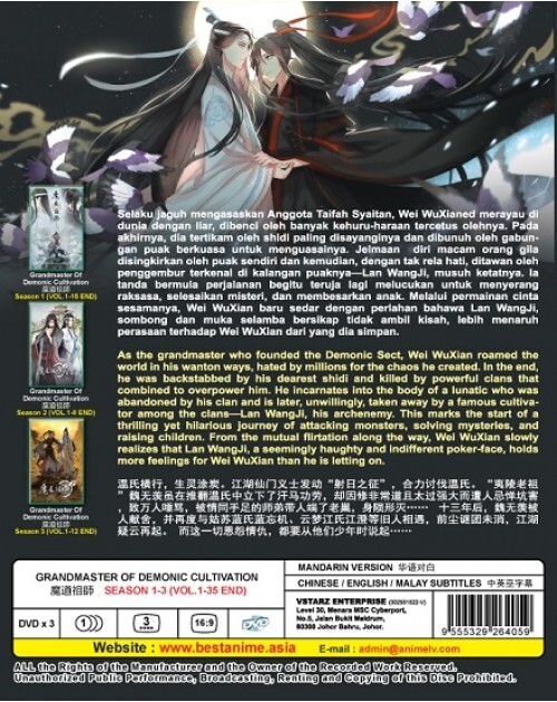 For detail of this set please view below only, and also to tell if this set has english or Japanese audio view below and check out the listing photo back side. If it shows as (Japanese / English Version means it has English audio but if it only shows Japanese Version no English Audio) All our set has at less English Subtitles if only Japanese audio. This set is all regions. GRANDMASTER OF DEMONIC CULTIVATION SEASON 1-3 (VOL.1-35 END) DVD Title Name GRANDMASTER OF DEMONIC CULTIVATION SEASON 1-3 (VOL.1-35 END) No of Disc 3 Disc (35 Episodes) Version Mandarin Subtitles Chinese / English / Malay Format DVD / NTSC & All Region Code (16:9) STORY : As the grandmaster who founded the Demonic Sect, Wei WuXian roamed the world in his wanton ways, hated by millions for the chaos he created. In the end, he was backstabbed by his dearest shidi and killed by powerful clans that combined to overpower him. He incarnates into the body of a lunatic who was abandoned by his clan and is later, unwillingly, taken away by a famous cultivator among the clans—Lan WangJi, his archenemy. This marks the start of a thrilling yet hilarious journey of attacking monsters, solving mysteries, and raising children. From the mutual flirtation along the way, Wei WuXian slowly realizes that Lan WangJi, a seemingly haughty and indifferent poker-face, holds more feelings for Wei WuXian than he is letting on. We Only Sell Original/Genuine DVDs. All DVDs I'm selling are from Licensed Publisher in Malaysia. All DVDs come with Original Sealed Authenticated Sticker / Hologram by Malaysia Censorship Board. ALL PACKAGE WILL BE SHIP OUT FROM USA CA SAN DIEGO AREA OCEANSIDE, SAN MARCOS. THIS MEAN WITH IN USA YOU SHOULD RECEIVE THE PACKAGE WITH IN 4-6 BUSINESS DAY AFTER SHIP OUT. We Only Sell Original/Genuine DVDs. All DVDs I'm selling are from Licensed Publisher in Malaysia. All our products are All region so it will play any dvd player in the world Any problem please contact us first so we can speed up taking care of you.
