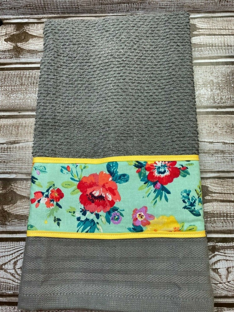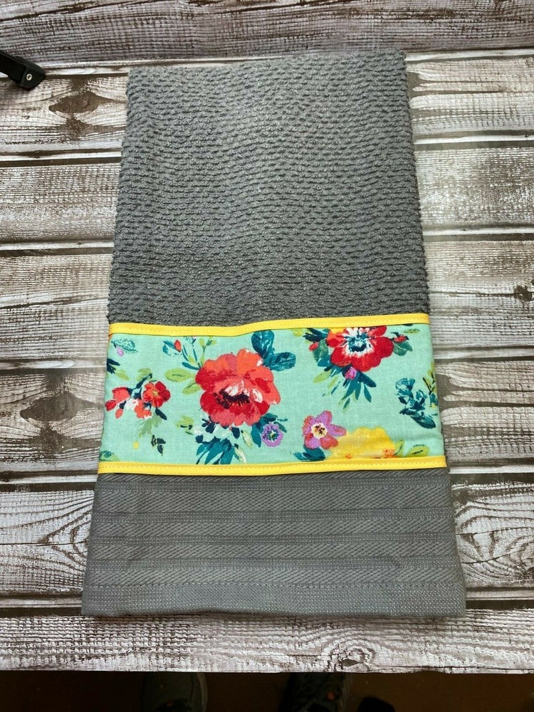 Fabric and Trim Decorated 100 % Cotton Gray Kitchen Hand Towel Teal fabric w red, yellow, lavender and teal flowers and yellow trim BS2800 Decorative fabric and trim are width of hand towel Hand Towel...