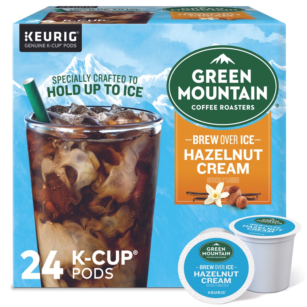 The mountains are a special place. It's where Green Mountain Coffee Roasters was born. It's where we developed our adventurous spirit and our commitment to improving the lands through sustainably sourced coffee. We're driven to bring the world a richer, better cup of coffee. Be bold. Be alive. Grab a cup and get out there. Green Mountain Coffee Roasters® Brew Over Ice K-Cup® pods are made for ice. We start with a specially crafted premium roast blend, then add an extra boost of 100% Arabica coffee captured at its peak flavor. All so you can enjoy an exceptionally rich, wonderfully balanced, and refreshingly full-flavored iced coffee that’s anything but ordinary. These single-serve K-Cup® pods are compatible with all Keurig K-Cup® Pod Single-Serve Coffee Makers Visit Our Store Contact Us Green Mountain Coffee Roasters Brew Over Ice Hazelnut Cream, K-Cups, 24 Count The mountains are a special place. It's where Green Mountain Coffee Roasters was born. It's where we developed our adventurous spirit and our commitment to improving the lands through sustainably sourced coffee. We're driven to bring the world a richer, better cup of coffee. Be bold. Be alive. Grab a cup and get out there. Green Mountain Coffee Roasters® Brew Over Ice K-Cup® pods are made for ice. We start with a specially crafted premium roast blend, then add an extra boost of 100% Arabica coffee captured at its peak flavor. All so you can enjoy an exceptionally rich, wonderfully balanced, and refreshingly full-flavored iced coffee that’s anything but ordinary. These single-serve K-Cup® pods are compatible with all Keurig K-Cup® Pod Single-Serve Coffee Makers. Each K-Cup® pod is filled with the freshest ground coffee that will brew a perfect, great tasting cup, every time. Certified Orthodox Union Kosher. 100% responsibly sourced coffee: the coffee we purchase is grown and sold in adherence to a credible sourcing program that aligns with our company Responsible Sourcing Guidelines.
