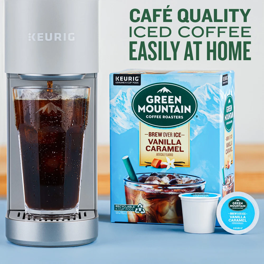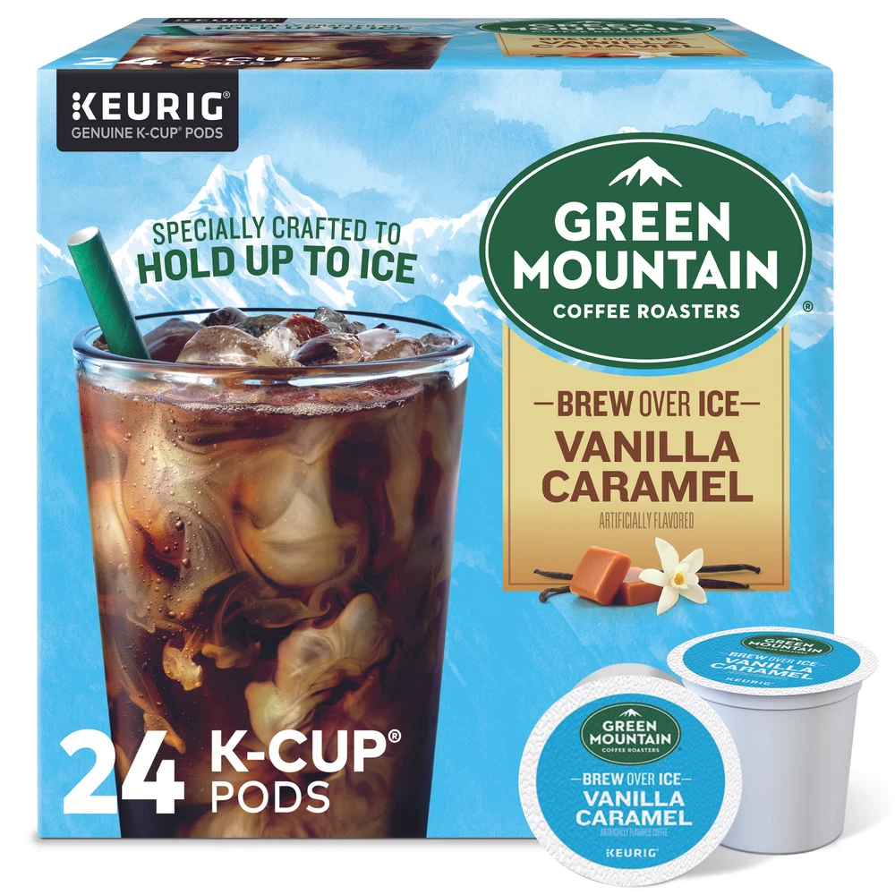 The mountains are a special place. It's where Green Mountain Coffee Roasters was born. It's where we developed our adventurous spirit and our commitment to improving the lands through sustainably sourced coffee. We're driven to bring the world a richer, better cup of coffee. Be bold. Be alive. Grab a cup and get out there. Green Mountain Coffee Roasters® Brew Over Ice K-Cup® pods are made for ice. We start with a specially crafted premium roast blend, then add an extra boost of 100% Arabica coffee captured at its peak flavor. All so you can enjoy an exceptionally rich, wonderfully balanced, and refreshingly full-flavored iced coffee that’s anything but ordinary. These single-serve K-Cup® pods are compatible with all Keurig K-Cup® Pod Single-Serve Coffee Makers Visit Our Store Contact Us Green Mountain Coffee Roasters Brew Over Ice Vanilla Caramel, K-Cups, 24 Count The mountains are a special place. It's where Green Mountain Coffee Roasters was born. It's where we developed our adventurous spirit and our commitment to improving the lands through sustainably sourced coffee. We're driven to bring the world a richer, better cup of coffee. Be bold. Be alive. Grab a cup and get out there. Green Mountain Coffee Roasters® Brew Over Ice K-Cup® pods are made for ice. We start with a specially crafted premium roast blend, then add an extra boost of 100% Arabica coffee captured at its peak flavor. All so you can enjoy an exceptionally rich, wonderfully balanced, and refreshingly full-flavored iced coffee that’s anything but ordinary. These single-serve K-Cup® pods are compatible with all Keurig K-Cup® Pod Single-Serve Coffee Makers. Each K-Cup® pod is filled with the freshest ground coffee that will brew a perfect, great tasting cup, every time. Certified Orthodox Union Kosher. 100% responsibly sourced coffee: the coffee we purchase is grown and sold in adherence to a credible sourcing program that aligns with our company Responsible Sourcing Guidelines.