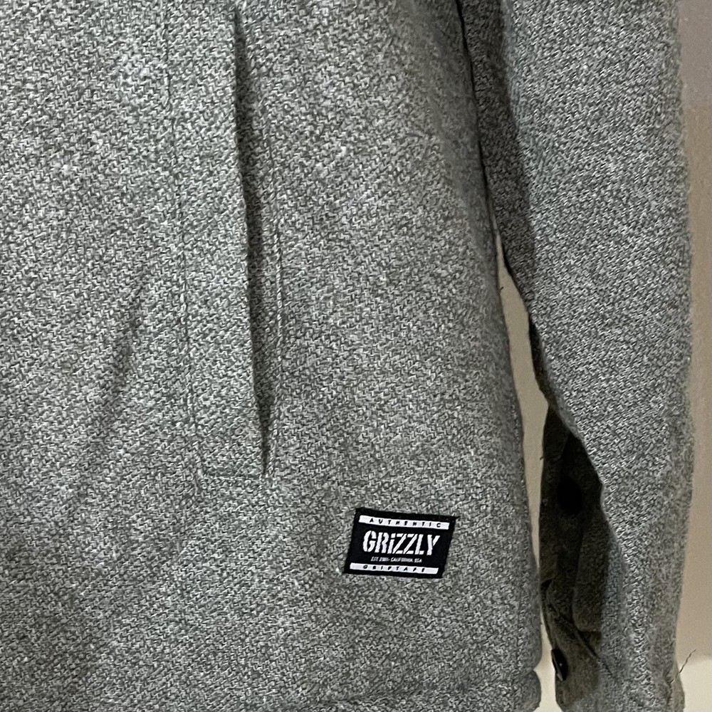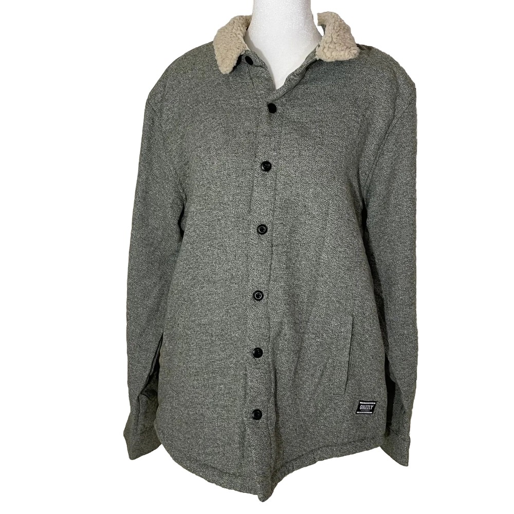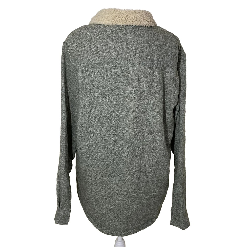 This Grizzly Women's Green Sherpa Lined Jacket in size L is perfect for any occasion, whether it be for travel, casual wear, workwear, or business attire. The mid-length jacket features a button closure and is made of a cotton and polyester blend with a solid pattern. The lining is made of a cotton polyester material with polyester insulation. The jacket also includes accents such as buttons and has a cozy theme, making it perfect for the winter, fall, or spring seasons. This pre-owned jacket has been well-maintained and is in great condition, ready to be worn and enjoyed by its new owner.