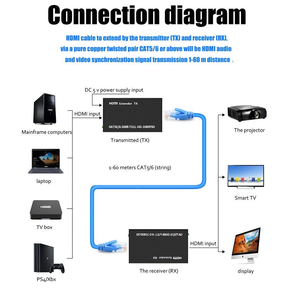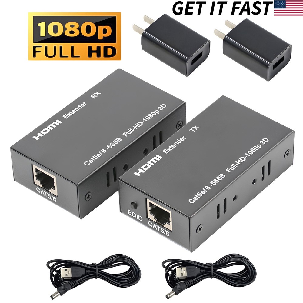 HDMI 1080P Extender up to 200ft over Cat5 Cat6 Ethernet Network LAN Cable 60m Product Introduction: HDMI signal amplifier extender uses two unshielded twisted pair wires to expand the distance of up to 60 meters high 1080P HD video not only breaks through the limit of HDMI cable, but also uses Cat5/6 network cable in the cable structure is more convenient and adaptable at the same time the cost is lower Is the key to expanding your HDMI signal selection product features: support for video input: 60 fs / 1080 p / 1080/24/50I / 720p / 576p / 576I / 480p / 480I signal transmission: A cat5e or cat6 cable (recommended) instead of an HDMI cable, Between receiver and emitter cable support up to 60 meters video output: 60 fs / 1080p / 1080/24/50I / 720p / 576p / 576I / 480p / 480I supported audio formats: DTS - HD/Dolby-trueHD/LPCM7.1 / DTS/Dolby-AC3 /DSD LED Show light: When a power supply or extender worked, a related LED light lit up using AWG26 specification cables with signal transmission of up to 60 meters with no signal loss and easy installation Product Guarantee We offer a 30 day return policy and a one year warranty. Buy with confidence! Item Location All orders ship from Indianapolis, IN, USA