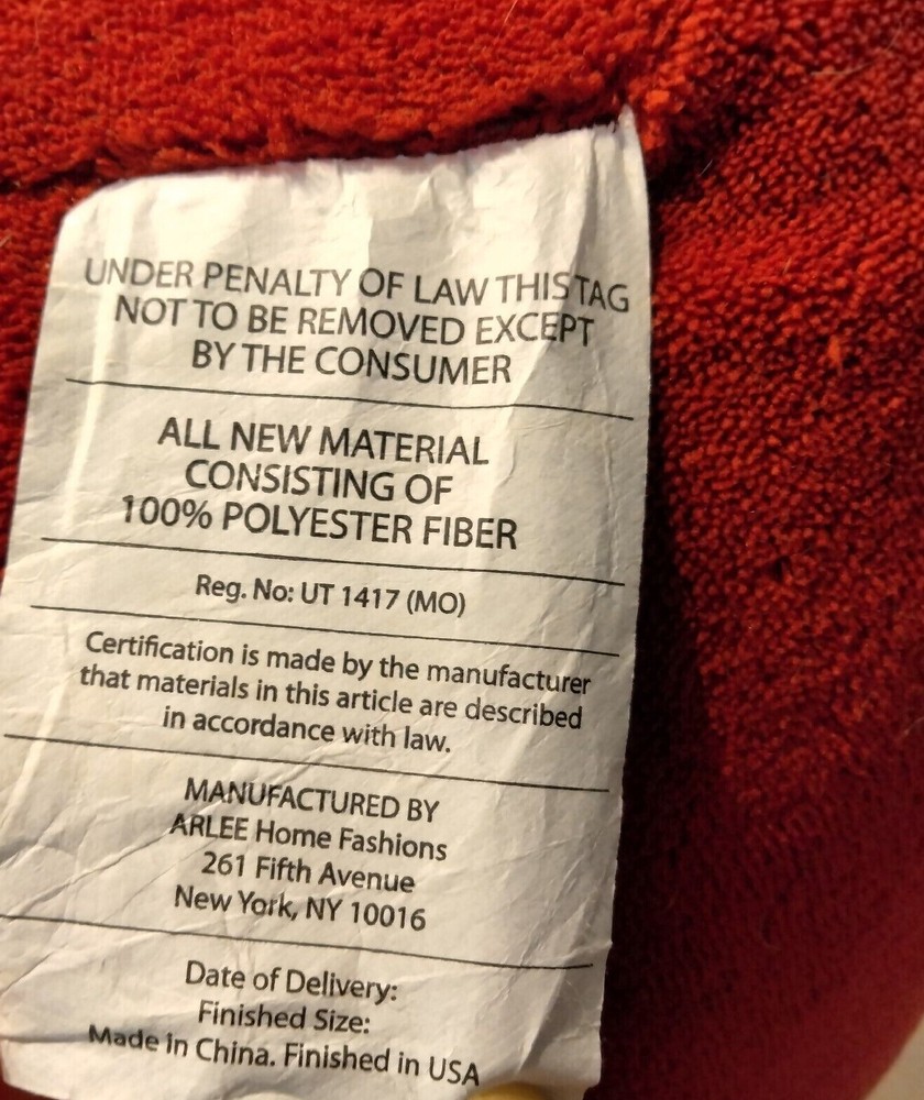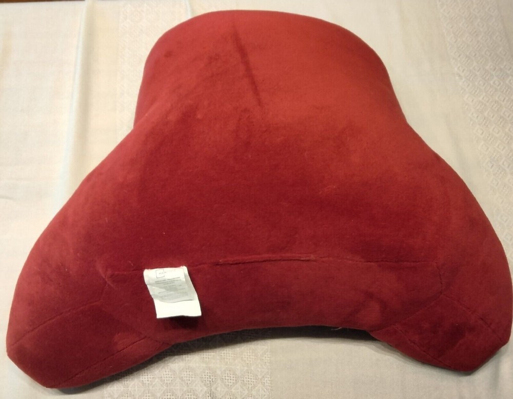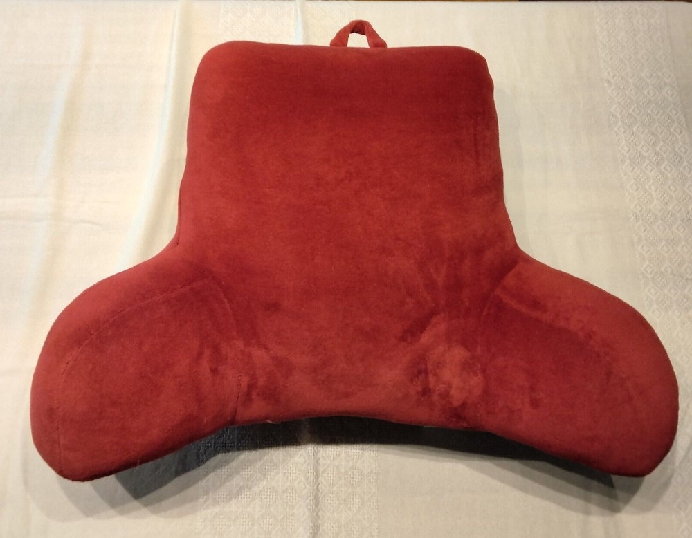 Comfy cozy Red Plush Bedrest/Floor Pillow GREAT for TV watching, gaming, or reading! Very gently used ONLY on furniture. Dimensions: 21" tall x 32" long (length includes arms which are 11" long each and 7" tall) x 9-1/2 inches thick. 16" width at top edge - there is also a loop at top for lifting. Cover is 100% Polyester; Interior: sustainable 100% polyester fiberfill from recycled plastic. Care tag reads: Spot clean only. Pillow must be thoroughly dry before placing on furniture or floor. Do not bleach. SEE OUR LISTING FOR NICHOLAS SNOWFLAKE DESIGN COTTON QUILT!