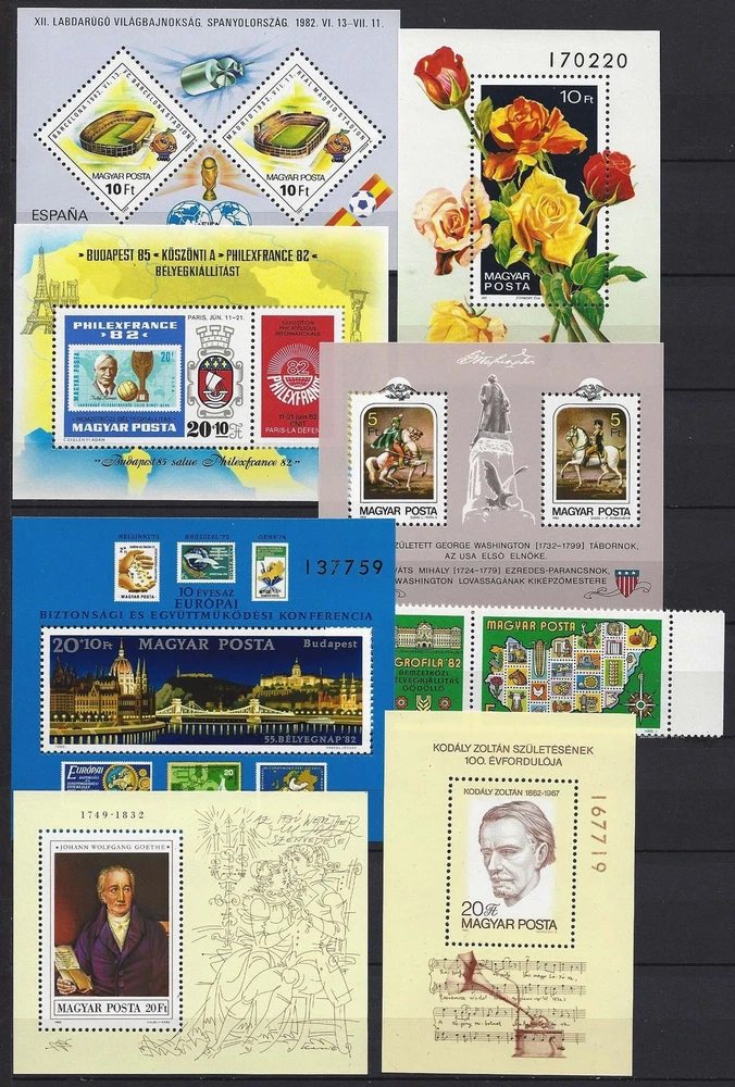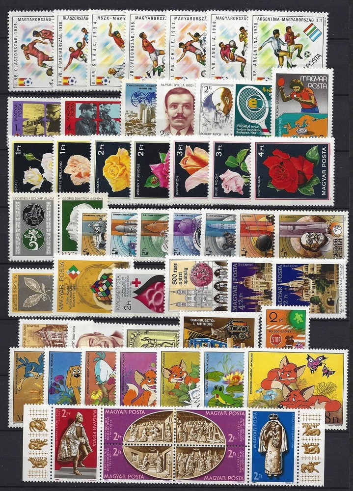 HUNGARY 1982.MNH!! Complete Year Set with Blocks Michel : 3532 - 3595. Michel Block : 155,156,157,158,159,160,161. Bid On my Item!!! Payment methods : I prefer Paypal. Shipping fees of multiple complete year sets: 1-2 year sets : 3.00US$ -Europe and 3.50US$ -Overseas 3-4 year sets with registration : 7.00US$ -Europe and 7.50US$ -Overseas 5-8 year sets with registration : 10.00US$ -Europe and 11.00US$ -Overseas 9-13 year sets with registration : 15.00US$ -Europe and 16.00US$ -Overseas If You have any question, please contact me with connection of payment.