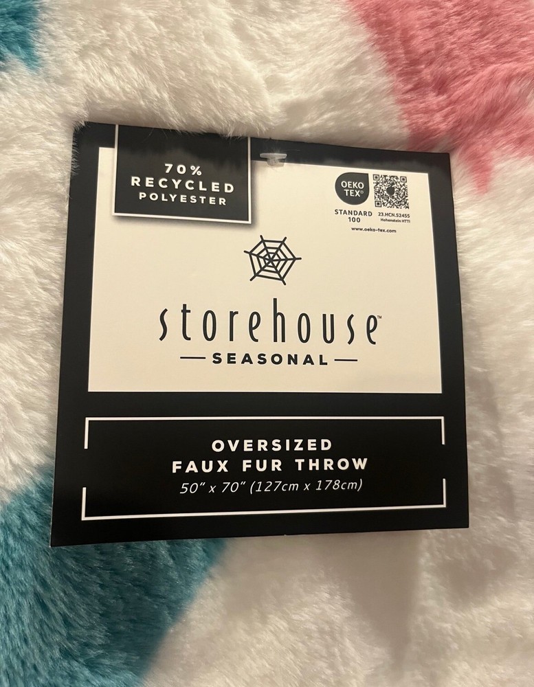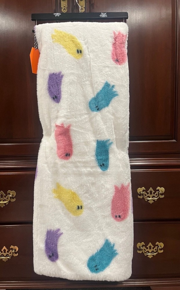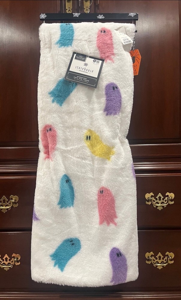 This is a Soft & Cozy blanket measuring 50" x 70" in white with multicolor pastel ghost patterns, perfect for Halloween. It is machine washable and easy to care for, suitable for use in the bedroom by teens, adults, and kids. The blanket features a fun ghost theme, making it a great addition to your Halloween decor. Comes from smoke free home. Let me know if you have any questions. Thanks!
