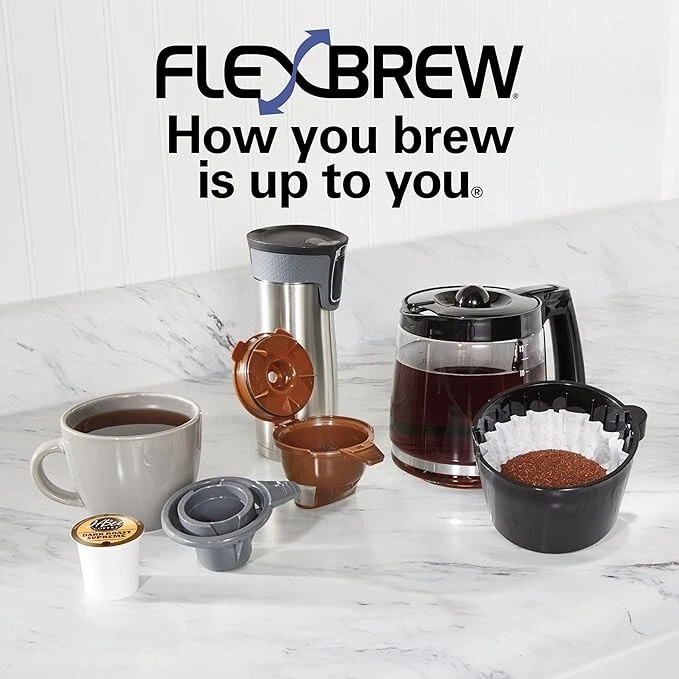 Brand Hamilton Beach Color Black Product Dimensions 11.4"D x 12.2"W x 13.7"H Special Feature Programmable, Permanent Filter, Automatic Shut-Off Coffee Maker Type Drip Coffee Machine Capacity 12 Cups Material Plastic Item Weight 6.4 Pounds Wattage 1050 watts About this item THREE WAYS TO BREW. Brew 12 cups with ground coffee on the carafe side or brew a single serving with a pod or ground coffee on the other. With a pod you can brew up to 10 oz. of coffee and when you use coffee grounds you can fill a 14 oz. travel mug.Filter type:Reusable.Auto shut-off: Yes SINGLE-CUP COFFEE MAKER. Brew a cup with a K-Cup pod, another pod brand, or ground coffee. The included pod holder and single-serve grounds basket easily handle both options and the cup rest removes so you can brew into a tall travel mug. BREW A FULL POT OF COFFEE: This programmable coffee maker has Easy-Touch programming for wake-up ready coffee. After brewing, coffee stays warm for 2 hours and the power automatically shuts off. AutoPause & Pour lets you pour a cup as coffee brews. CUSTOMIZE YOUR BREW STRENGTH: Control how strong you want your coffee with Select-a-Brew: regular and bold brewing options. 2 SEPARATE EASY-FILL WATER RESERVOIRS: Each brewing side on this Hamilton Beach coffee maker has its own water reservoir that’s easy to fill and features a water window, so you always know exactly how much water to add.