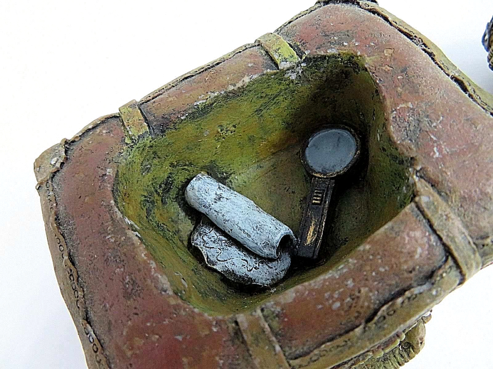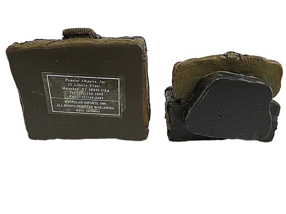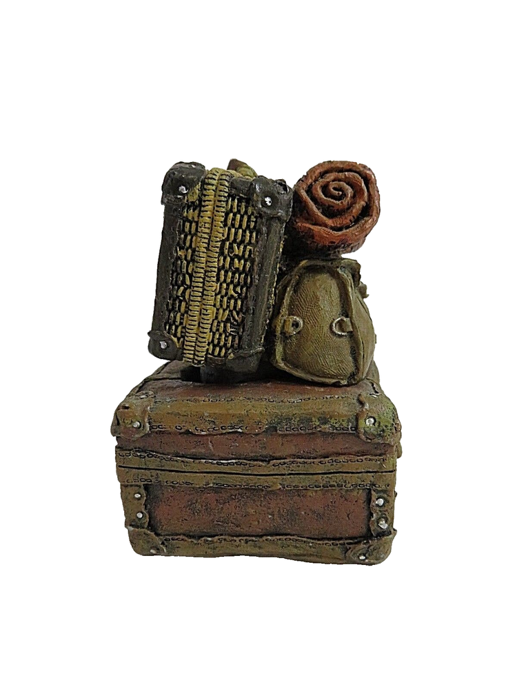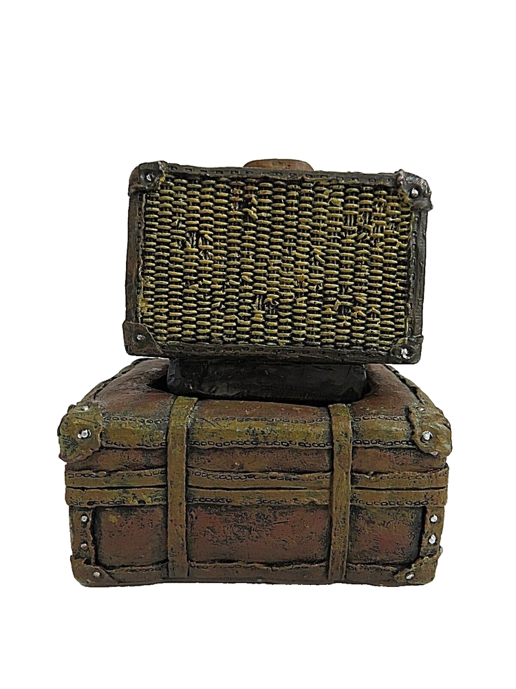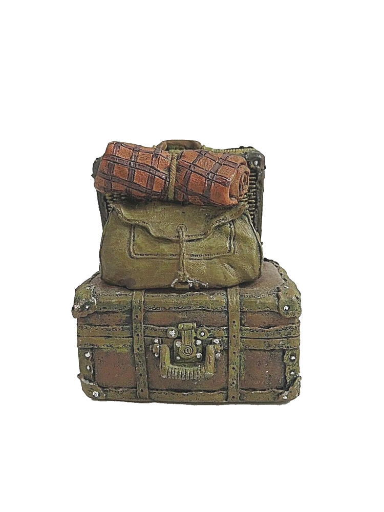 Trinket box is 3 5/8" high x 3" wide x 2 3/4" deep outside dimensions. It weighs 1 pound 2.6 ounces alone. Just enough room inside to hold a ring or small piece of jewelry. Hand painted resin trinket box is shaped like an old trunk with a travel bag, wicker suitcase, and bedroll atop the lid. Made by Popular Imports 1998. It has a rolled map and flashlight/magnifying glass molded inside the box. Very nice details including the textured designs on the bedroll, the distressed look of the wicker suitcase, the soft leather look of the travel bag, and the old trunk with all it's marvelous details! The hardware on the trunk is so real looking with it's silver nail heads. Bottom of trinket box has the original sticker label from the manufacturer. The colors are dark brown, beige, and reddish-brown for the bedroll. The map inside is silver-gray color and the handle of the flash mag light is painted to look like copper. In very good used condition! No chips or cracks. Aisle 333100 Hot Pink Tag 5.5.5