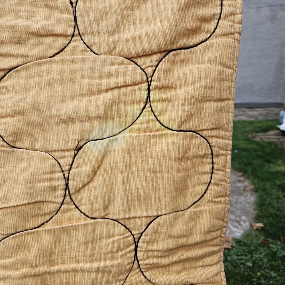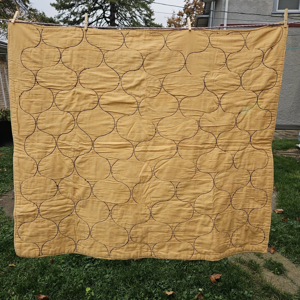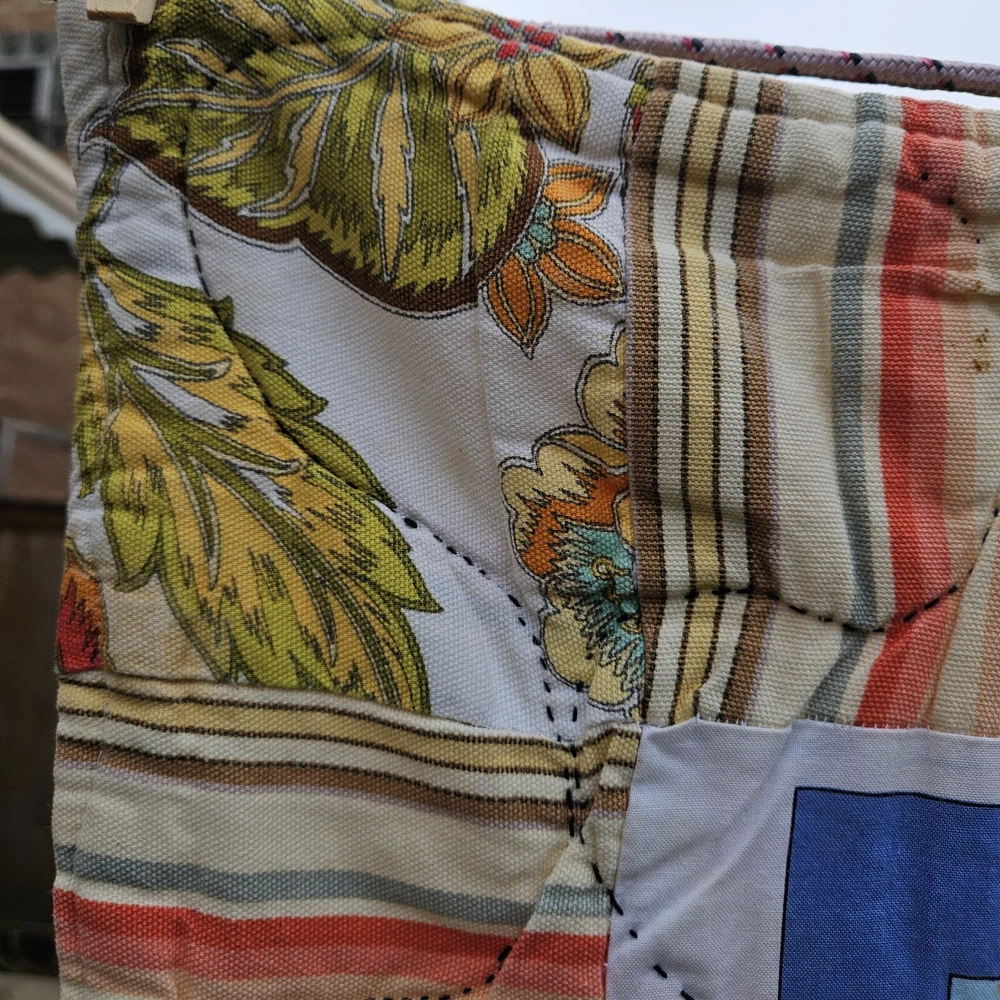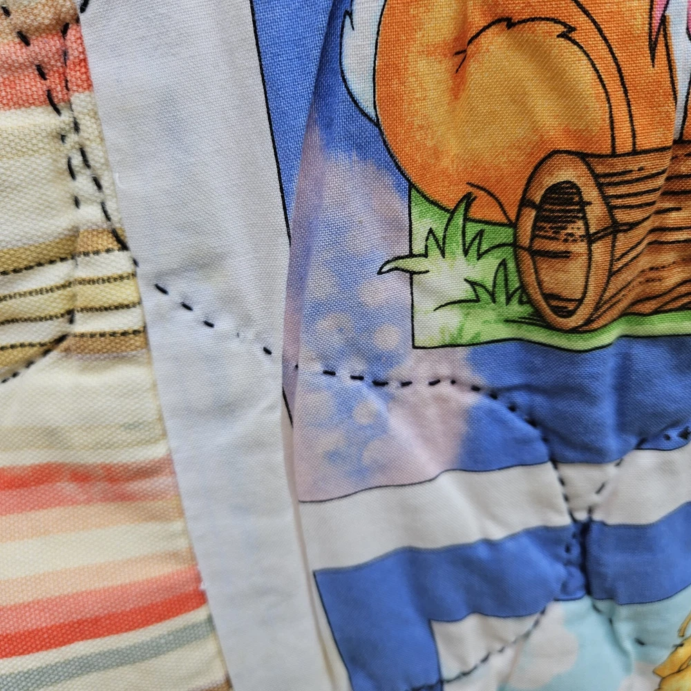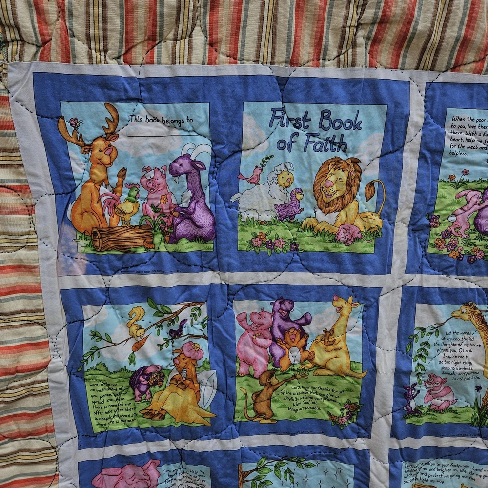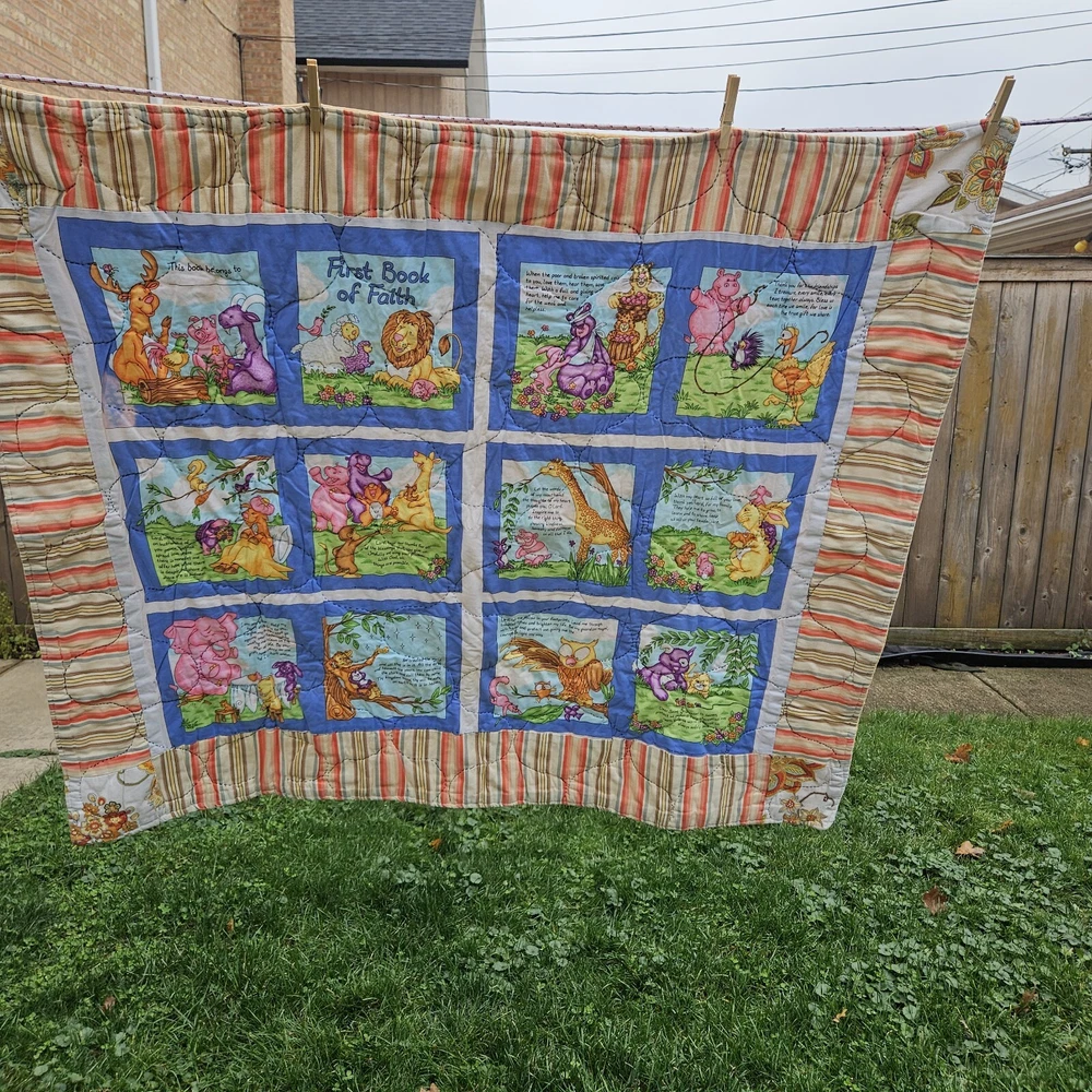 Well, love hand quilted and Hand-sewed baby blanket Very cozy, I made it in 2017 for my firstborn. My second child used it too and a lot of life in it. Made from cotton fabric for front and back and polyester pad in the middle. Unisex Used as: Stroller blanket Car seat blanket Crib blanket Receiving blanket Season: Fall Winter Spring Approximately 2.6 Ib Size 48×39 in Flaws: Little discoloration in the back and in the front(not that noticeable in the front). One corner with open tread can be fixed Wash: Hand-wash Machine wash