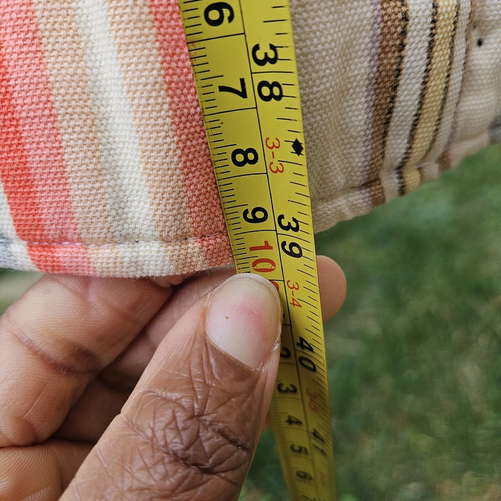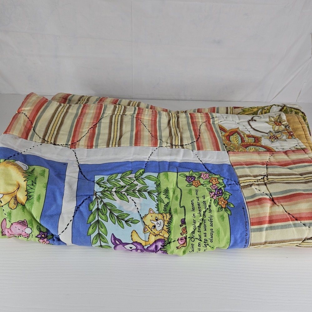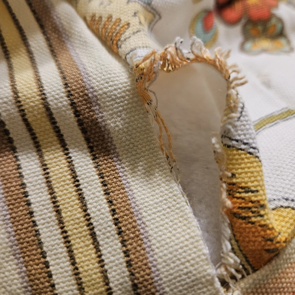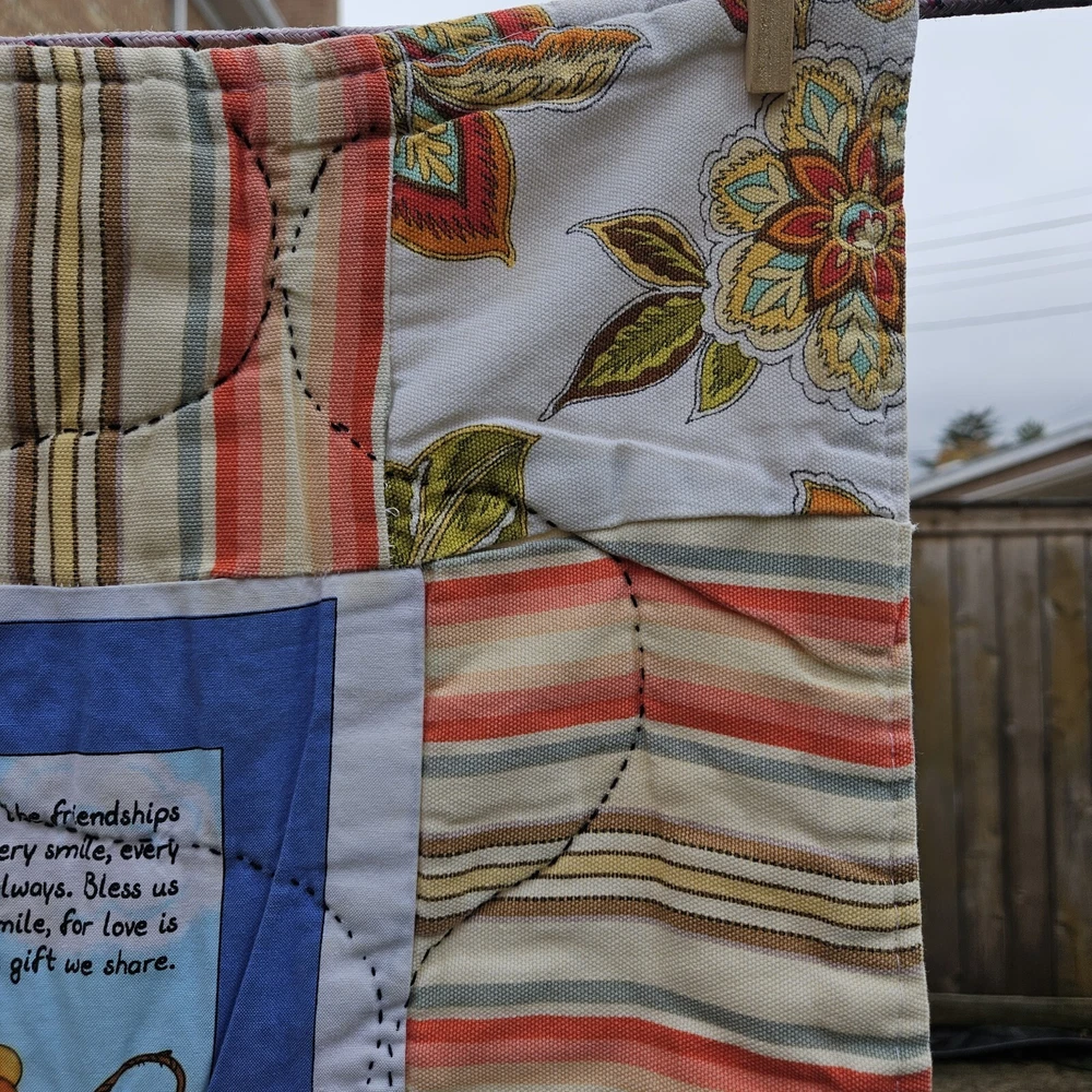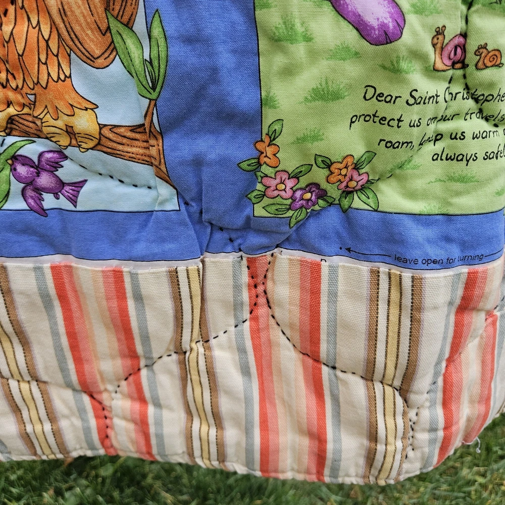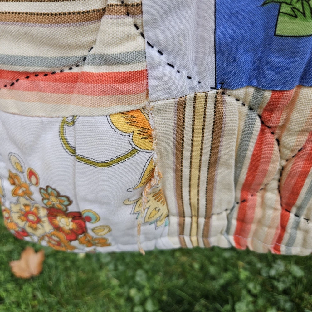 Well, love hand quilted and Hand-sewed baby blanket Very cozy, I made it in 2017 for my firstborn. My second child used it too and a lot of life in it. Made from cotton fabric for front and back and polyester pad in the middle. Unisex Used as: Stroller blanket Car seat blanket Crib blanket Receiving blanket Season: Fall Winter Spring Approximately 2.6 Ib Size 48×39 in Flaws: Little discoloration in the back and in the front(not that noticeable in the front). One corner with open tread can be fixed Wash: Hand-wash Machine wash