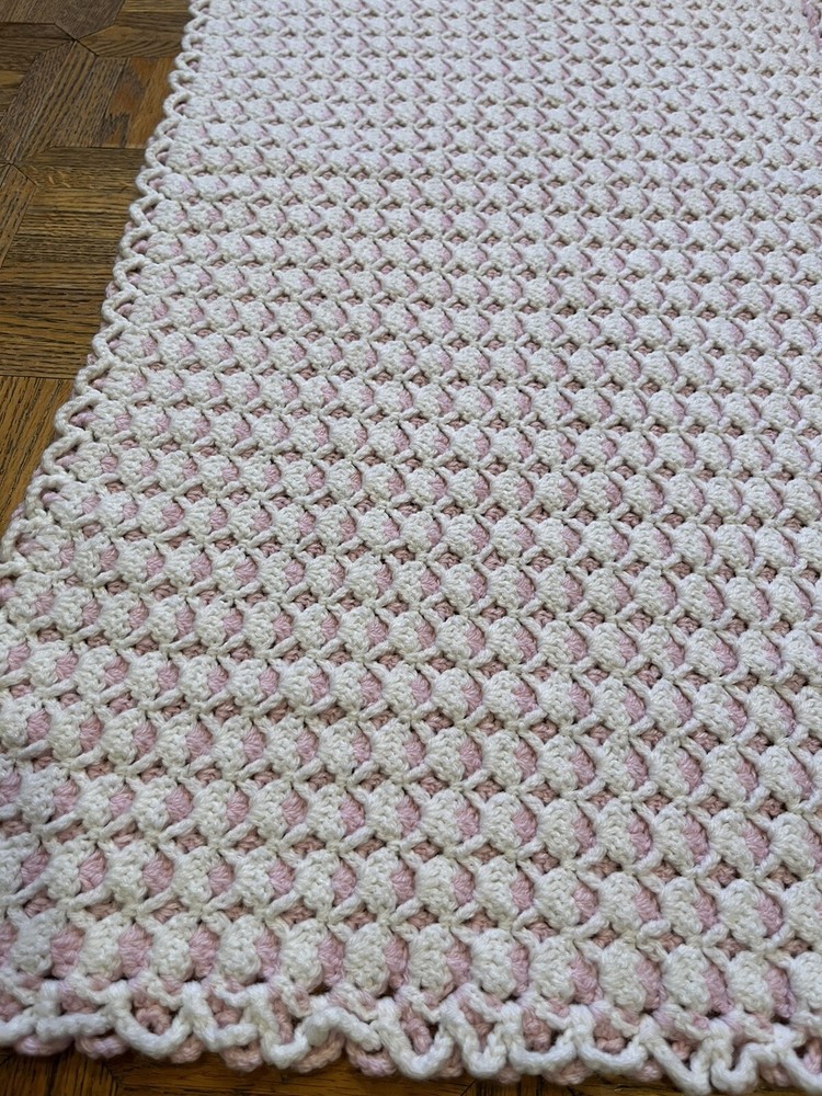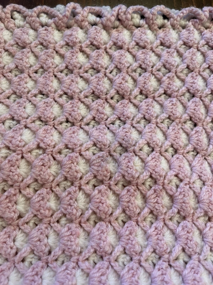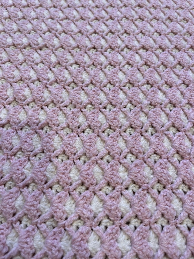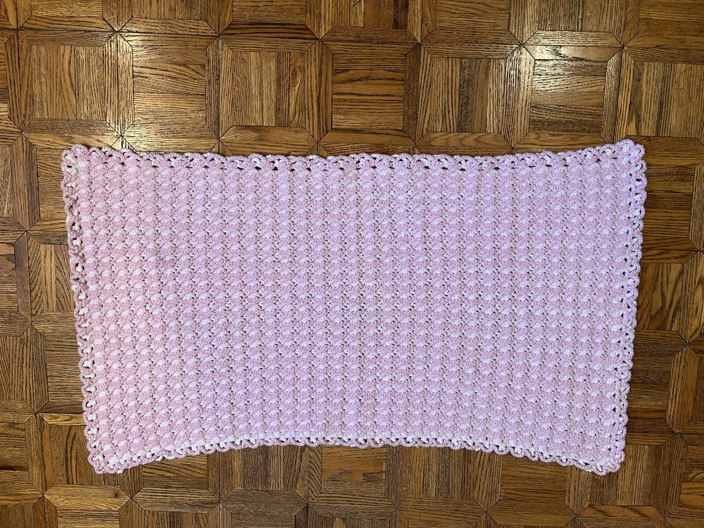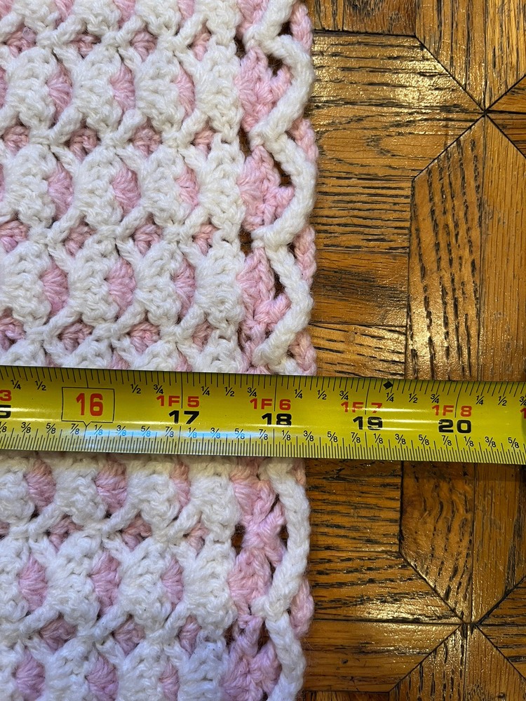 Handmade Crochet Blanket Leg Lap Warmer Pink And White 35.5” X 18.5”. Loop design. Pink dominant on one side, white dominant on the other. In good preowned condition. Dark mark on pink side. Estate sale find, will be shipping as found. Please see photos for condition, as there are no returns. Thank you for visiting my store. I appreciate your time and support.