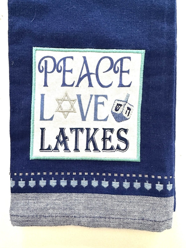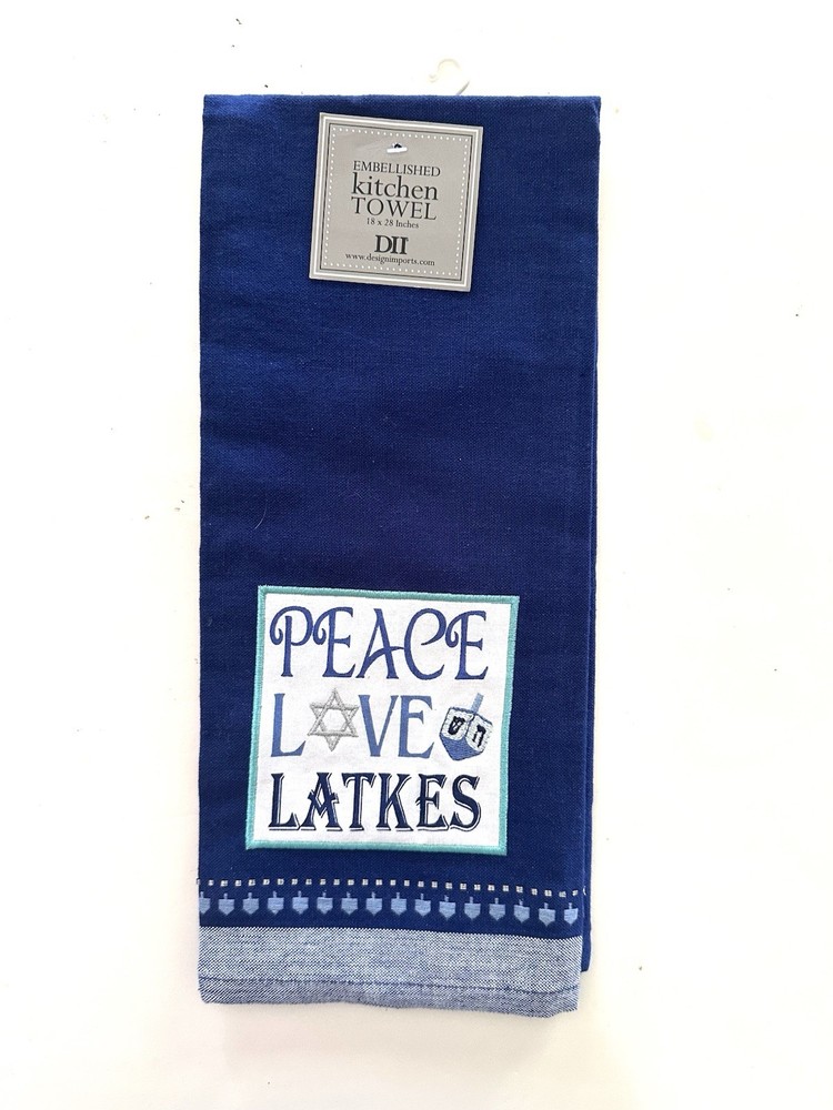 This Hanukkah Kitchen Towel featuring a “Peace Love Latkes” design is a festive addition to your holiday decor. Made of 100% cotton with a linen look finish, this tea towel showcases a blue and white color scheme embellished with silver thread, and featuring a dreidel. Perfect for adding a touch of holiday cheer to your kitchen or bath, this machine washable towel is a practical and stylish choice for your home or for gifting. New with tags. Approximately 18” X 28” Please see photos for best description of items and condition. From smoke-free, pet-free environment.