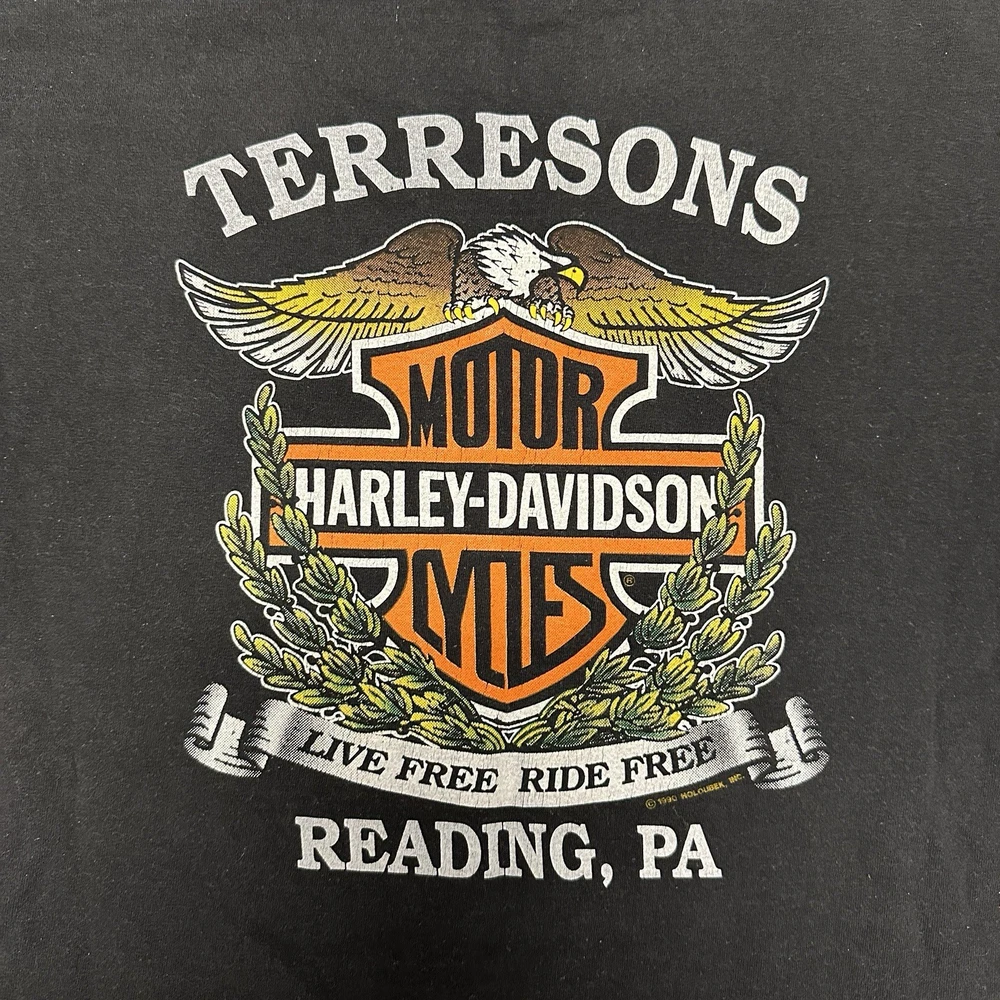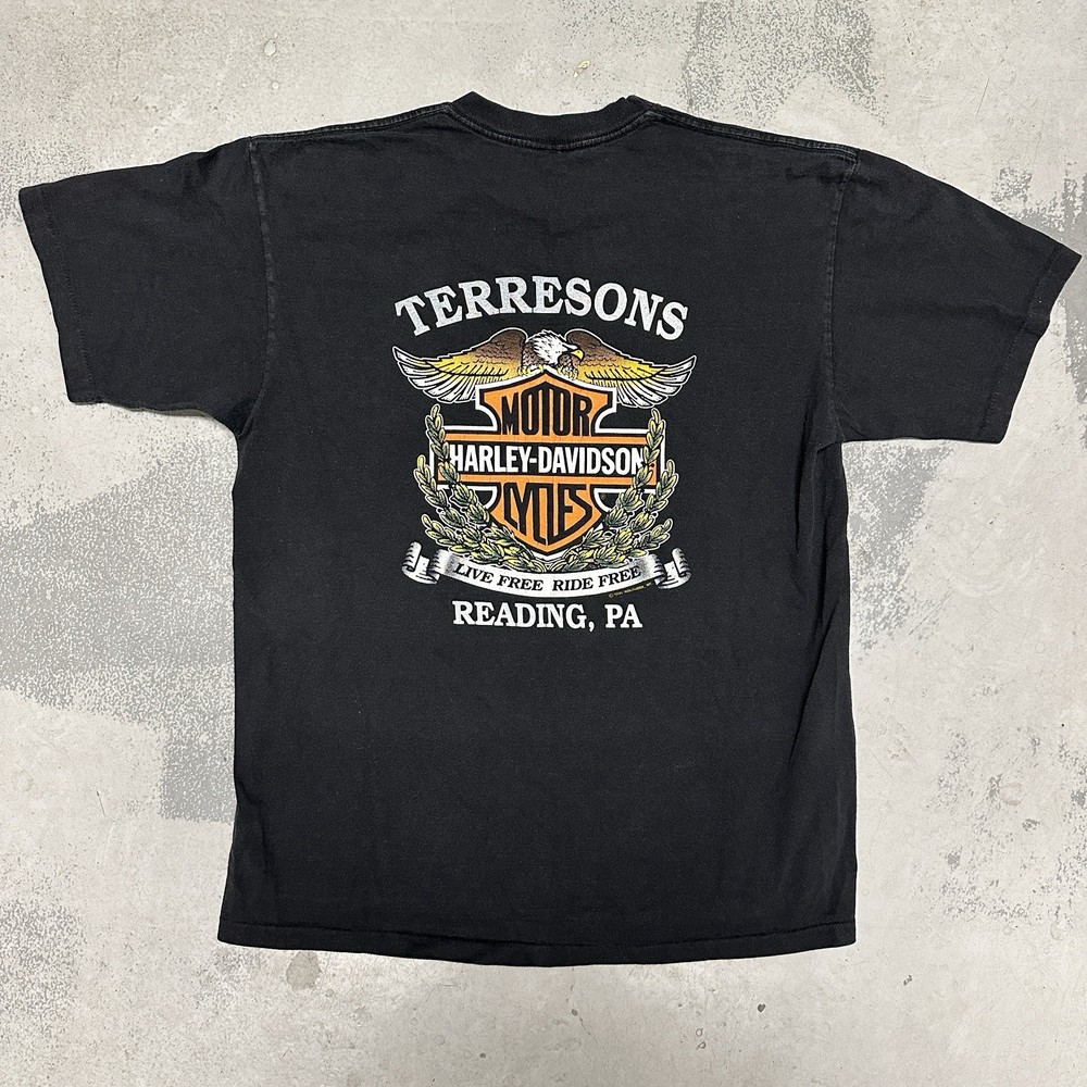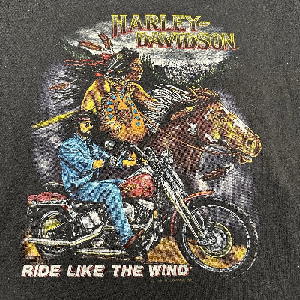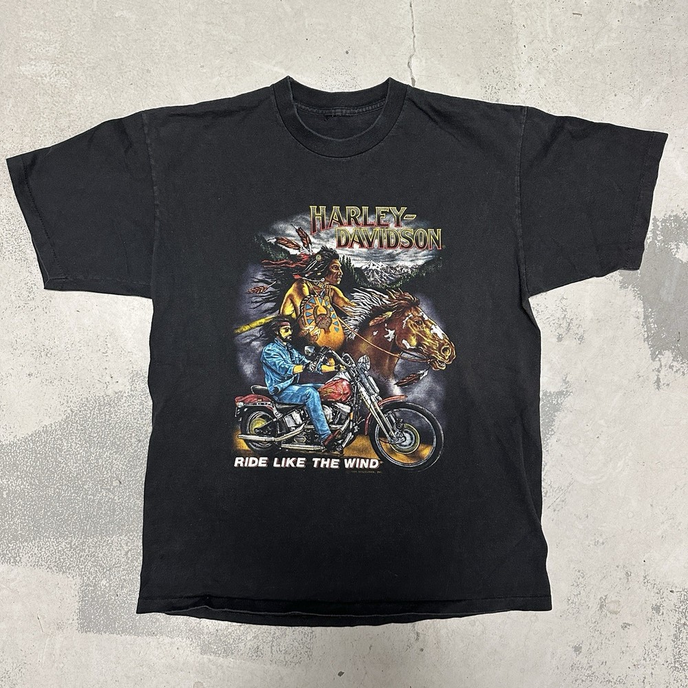 The Harley Davidson Men’s Ride Like The Wind Biker T-Shirt in vintage size medium features a classic black color with a crew neck and short sleeves, made of cotton material. This shirt is adorned with the Harley-Davidson logo as a accent, embodying themes of biker, motorcycle, USA, and 90s. With its regular fit and all seasons features, this t-shirt is perfect for any man looking to showcase their love for Harley Davidson and the spirit of the brand. Made in the United States during the 1990s, this vintage shirt is a must-have for any motorcycle enthusiast.