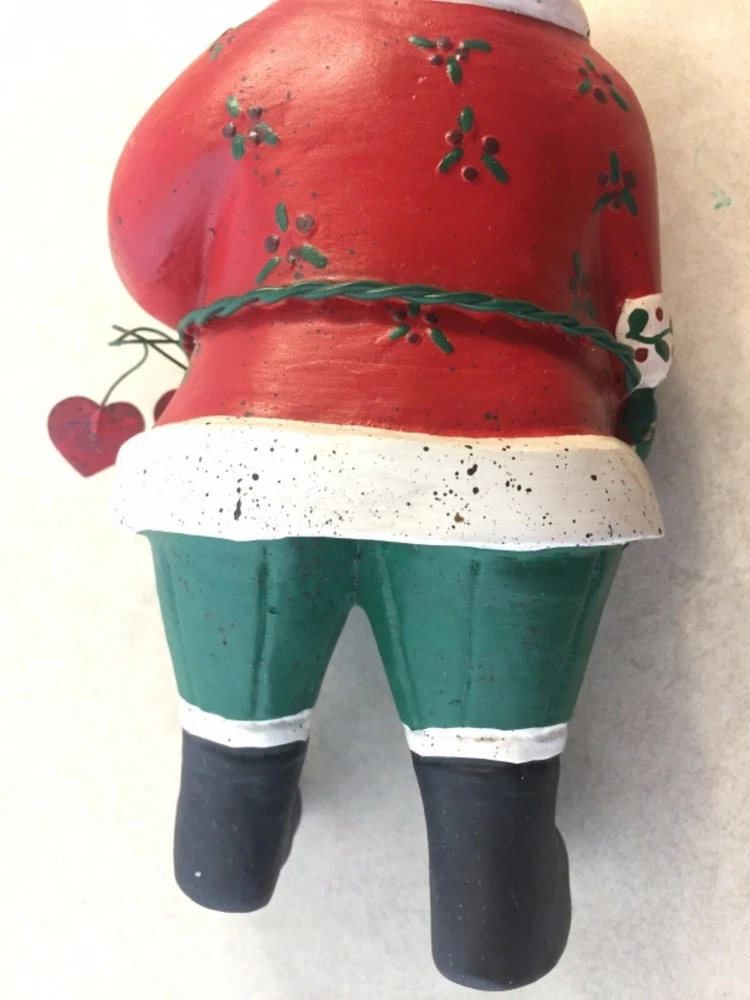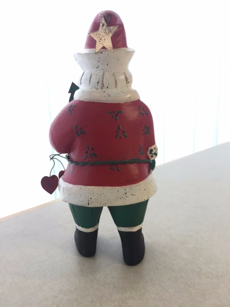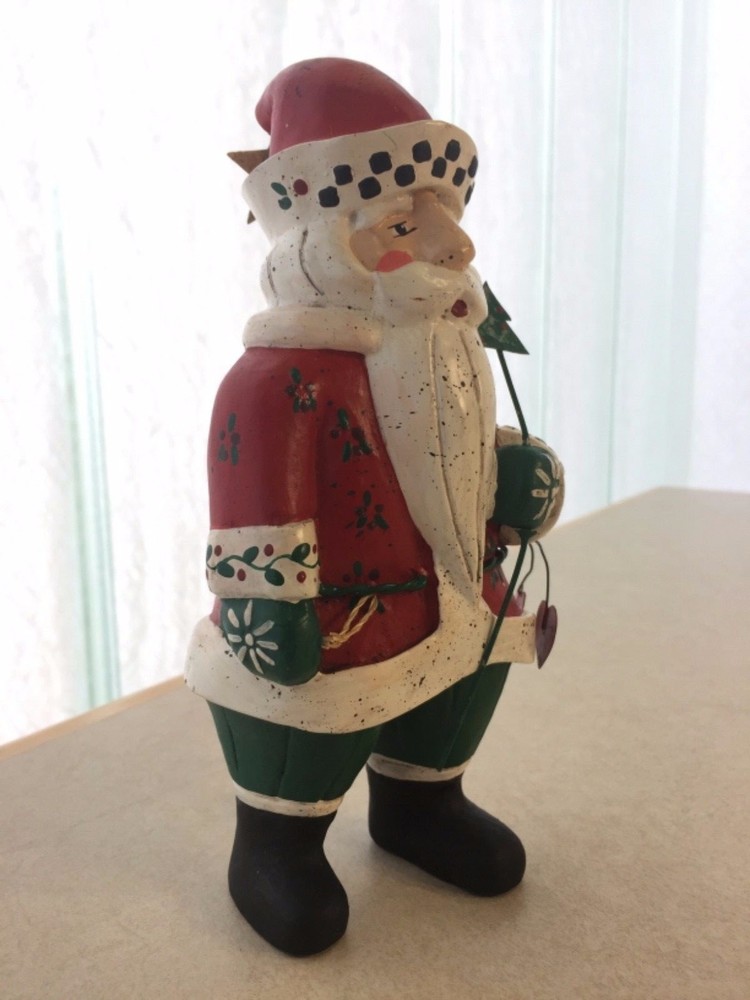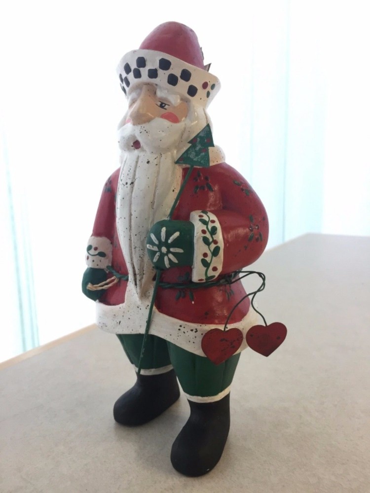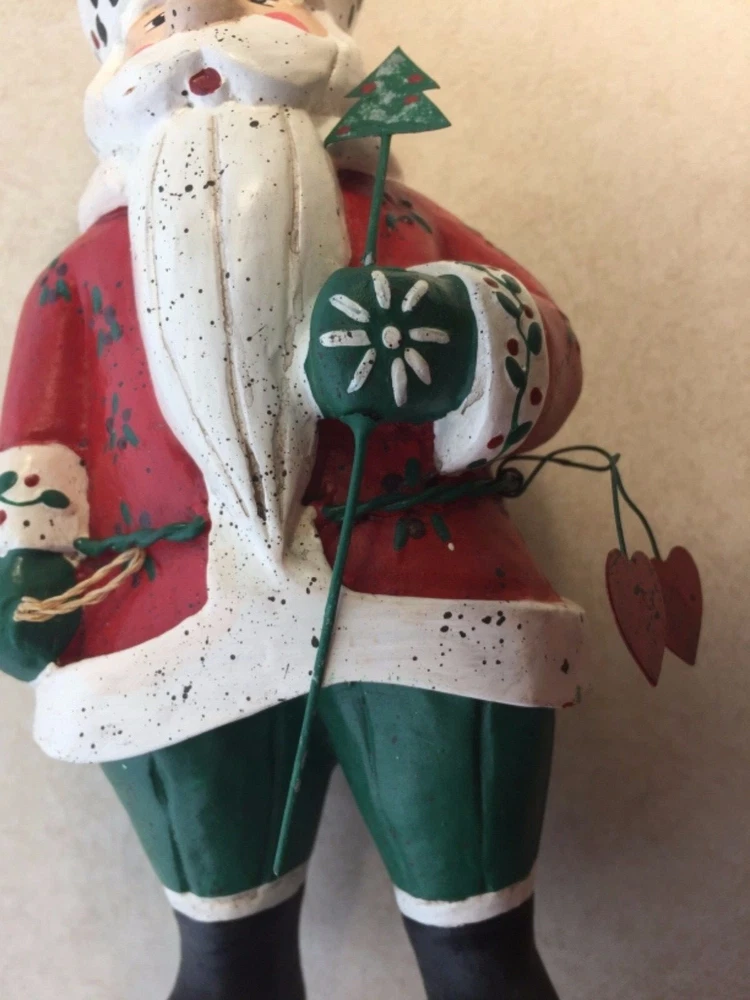 Vintage Heartland Santa Designed by A. Constanza Midwest Importers of Cannon Falls with Hearts, a Star & a Tree All of the art work and collectibles being sold by Adams-Byrd Fine Art & Antiques have been collected and selected one at a time by the proprietor, an art historian with many years of training and experience in university art history departments, museums, galleries, and historic sites both in the U.S. and abroad. The business has been based in the Washington, D.C. area for many years. The art and collectibles that we are offering to eBay buyers are special and unique pieces that have been carefully “curated” by us. This is one of our favorite collectible Santas by Midwest Importers of Cannon Falls. Two red hearts hang from his wire belt, and he holds a small metal tree on a long wire. A gold metal star hangs from the tip of his hat. There is a loop of twine rope in his left hand (at the front) . So, if you are a Santa collector who also likes hearts and stars, this will be a perfect addition to your collection. This charming Santa, designed by A. Constanza, has been beautifully painted with a lot of detail (flowers, leaves, checkerboard pattern on the hat, etc.). The Heartland Santa series figures, like many of the others made by Midwest Importers of Cannon Falls, were carved in wood and then cast in another material. Since acquiring this for our Christmas decorations collection years ago, we have learned that this Santa was originally pulling a sled …… attached to twine/rope coming out of the back of his left hand. This Santa still has the original white rectangular label on the bottom of his right foot --- MIDWEST IMPORTERS OF CANNON FALLS, INC. MADE IN THE PHILIPPINES The designer has been identified elsewhere as A. Constanza, but we don’t know if that attribution is from the original packaging, from a label or tag that originally came with it, or from a label under its original sled. This Santa is in good vintage condition. It is under 8“ tall, under 4“ wide, and about 3” deep. We would guess that this folk art Santa is from the 1980s or 1990s. All items we sell are from a pet free and smoke free environment – unless prior owner history is noted above. Terms and Conditions Please read the following terms and conditions, view all photos and read the full description before bidding or buying. We are incredibly scrupulous with our descriptions of an item’s condition so that you can make an informed purchasing decision. Note on measurements : All measurements are approximate. If you need extreme accuracy on particular measurements, please contact us before buying. Returns : To provide low pricing and a constant stream of quality merchandise, we are unable to accept returns for buyer remorse, buyer mistake or improper fit. It takes time on both the buyer and seller’s ends and the whole process is much more fulfilling when we, the seller, provide comprehensive information about an item and you, the buyer, carefully read and consider that information before making the decision to buy. Payment : For auction items, payment is expected within 3 days of purchase. After 4 days, an unpaid item case may be opened with eBay so that the item can be relisted or second chance offers may be made to other bidders. We require immediate payment for Buy it Now items. Shipping : We aim to ship within 3 business days of receiving payment, however delays may occur – in the event of a delay, we will update you on the progress of your shipment. We always ship with delivery confirmation/tracking. Attention international shoppers: We do ship internationally through eBay's global shipping program. Feedback : We aim for an enjoyable eBay experience for all, measured as 100% satisfaction in eBay terms. We hope you enjoy your purchase(s) from us. If you are not satisfied with an item for any reason, please contact us upon receiving it. Positive feedback lets us know that an item was received safely.