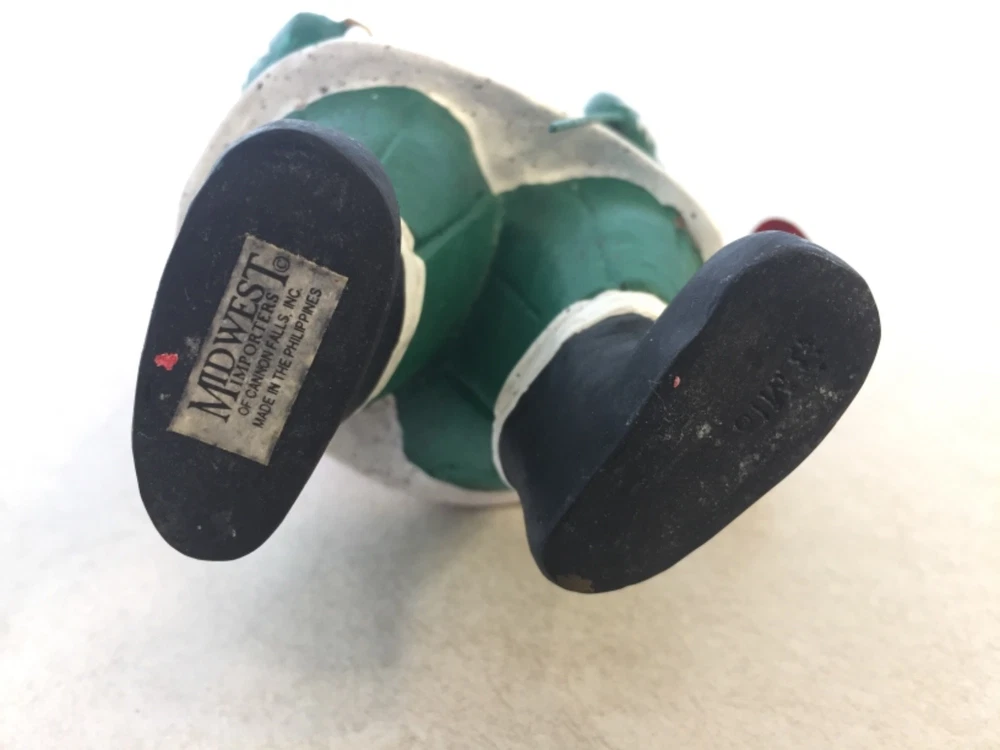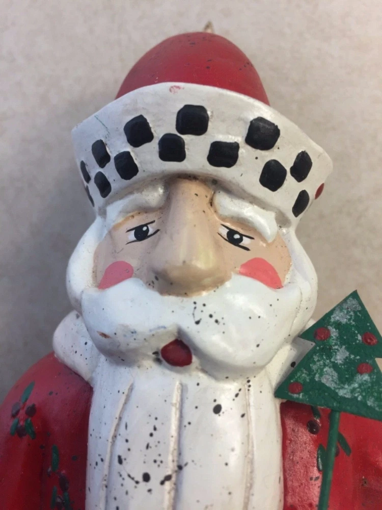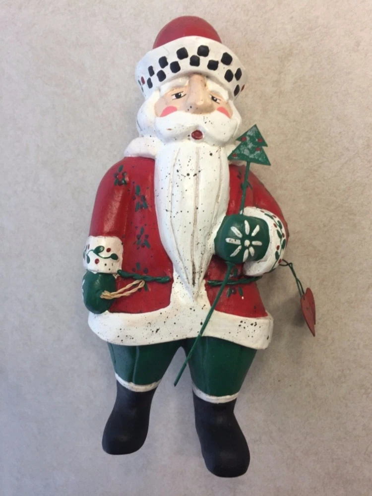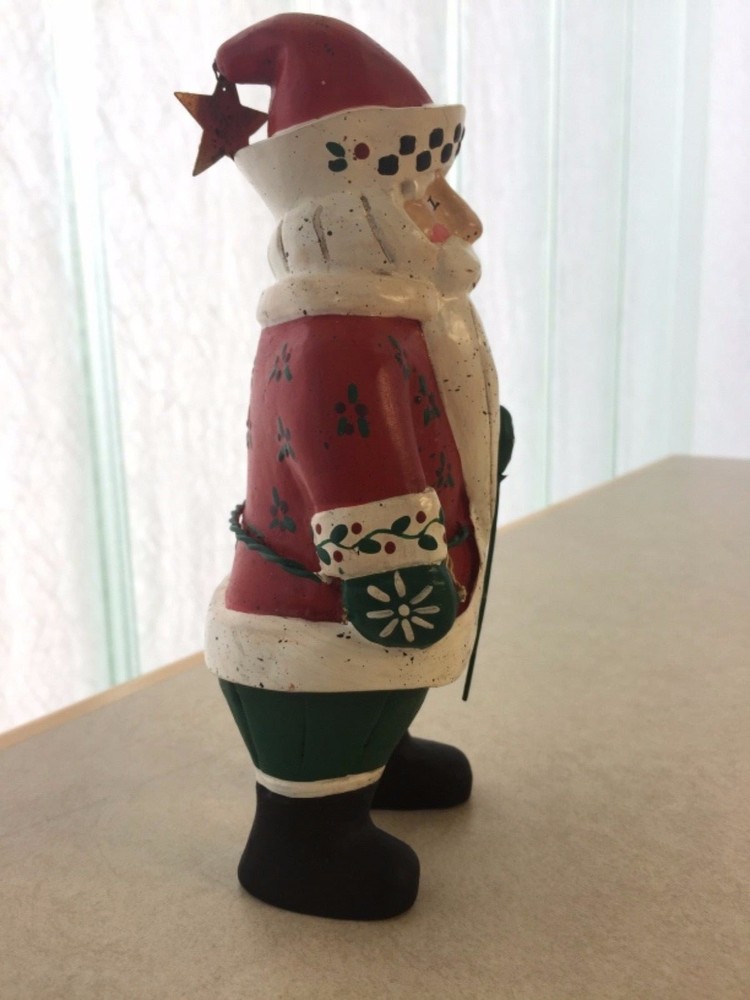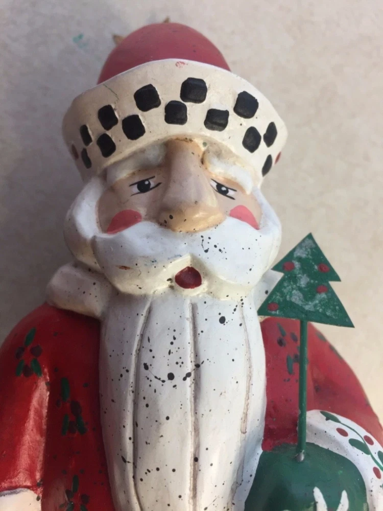 Vintage Heartland Santa Designed by A. Constanza Midwest Importers of Cannon Falls with Hearts, a Star & a Tree All of the art work and collectibles being sold by Adams-Byrd Fine Art & Antiques have been collected and selected one at a time by the proprietor, an art historian with many years of training and experience in university art history departments, museums, galleries, and historic sites both in the U.S. and abroad. The business has been based in the Washington, D.C. area for many years. The art and collectibles that we are offering to eBay buyers are special and unique pieces that have been carefully “curated” by us. This is one of our favorite collectible Santas by Midwest Importers of Cannon Falls. Two red hearts hang from his wire belt, and he holds a small metal tree on a long wire. A gold metal star hangs from the tip of his hat. There is a loop of twine rope in his left hand (at the front) . So, if you are a Santa collector who also likes hearts and stars, this will be a perfect addition to your collection. This charming Santa, designed by A. Constanza, has been beautifully painted with a lot of detail (flowers, leaves, checkerboard pattern on the hat, etc.). The Heartland Santa series figures, like many of the others made by Midwest Importers of Cannon Falls, were carved in wood and then cast in another material. Since acquiring this for our Christmas decorations collection years ago, we have learned that this Santa was originally pulling a sled …… attached to twine/rope coming out of the back of his left hand. This Santa still has the original white rectangular label on the bottom of his right foot --- MIDWEST IMPORTERS OF CANNON FALLS, INC. MADE IN THE PHILIPPINES The designer has been identified elsewhere as A. Constanza, but we don’t know if that attribution is from the original packaging, from a label or tag that originally came with it, or from a label under its original sled. This Santa is in good vintage condition. It is under 8“ tall, under 4“ wide, and about 3” deep. We would guess that this folk art Santa is from the 1980s or 1990s. All items we sell are from a pet free and smoke free environment – unless prior owner history is noted above. Terms and Conditions Please read the following terms and conditions, view all photos and read the full description before bidding or buying. We are incredibly scrupulous with our descriptions of an item’s condition so that you can make an informed purchasing decision. Note on measurements : All measurements are approximate. If you need extreme accuracy on particular measurements, please contact us before buying. Returns : To provide low pricing and a constant stream of quality merchandise, we are unable to accept returns for buyer remorse, buyer mistake or improper fit. It takes time on both the buyer and seller’s ends and the whole process is much more fulfilling when we, the seller, provide comprehensive information about an item and you, the buyer, carefully read and consider that information before making the decision to buy. Payment : For auction items, payment is expected within 3 days of purchase. After 4 days, an unpaid item case may be opened with eBay so that the item can be relisted or second chance offers may be made to other bidders. We require immediate payment for Buy it Now items. Shipping : We aim to ship within 3 business days of receiving payment, however delays may occur – in the event of a delay, we will update you on the progress of your shipment. We always ship with delivery confirmation/tracking. Attention international shoppers: We do ship internationally through eBay's global shipping program. Feedback : We aim for an enjoyable eBay experience for all, measured as 100% satisfaction in eBay terms. We hope you enjoy your purchase(s) from us. If you are not satisfied with an item for any reason, please contact us upon receiving it. Positive feedback lets us know that an item was received safely.