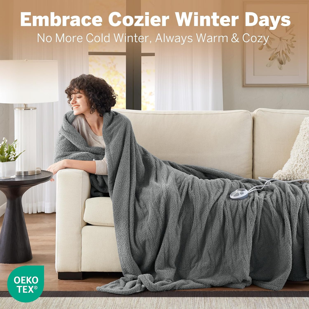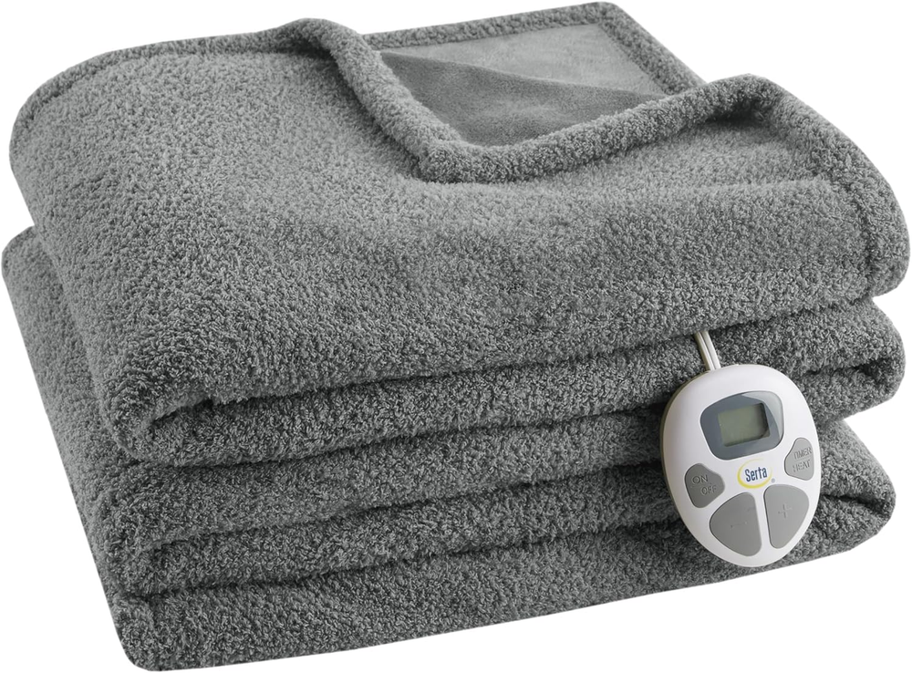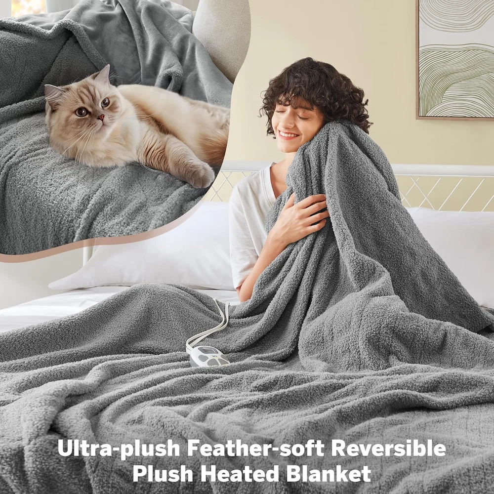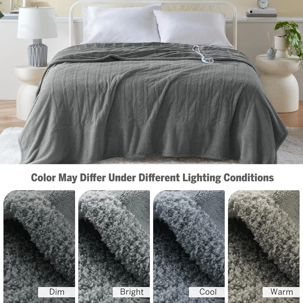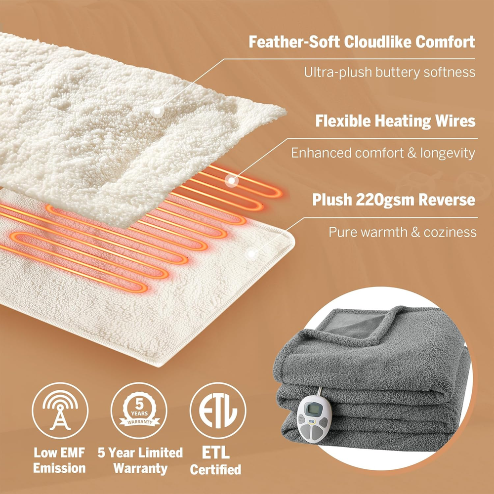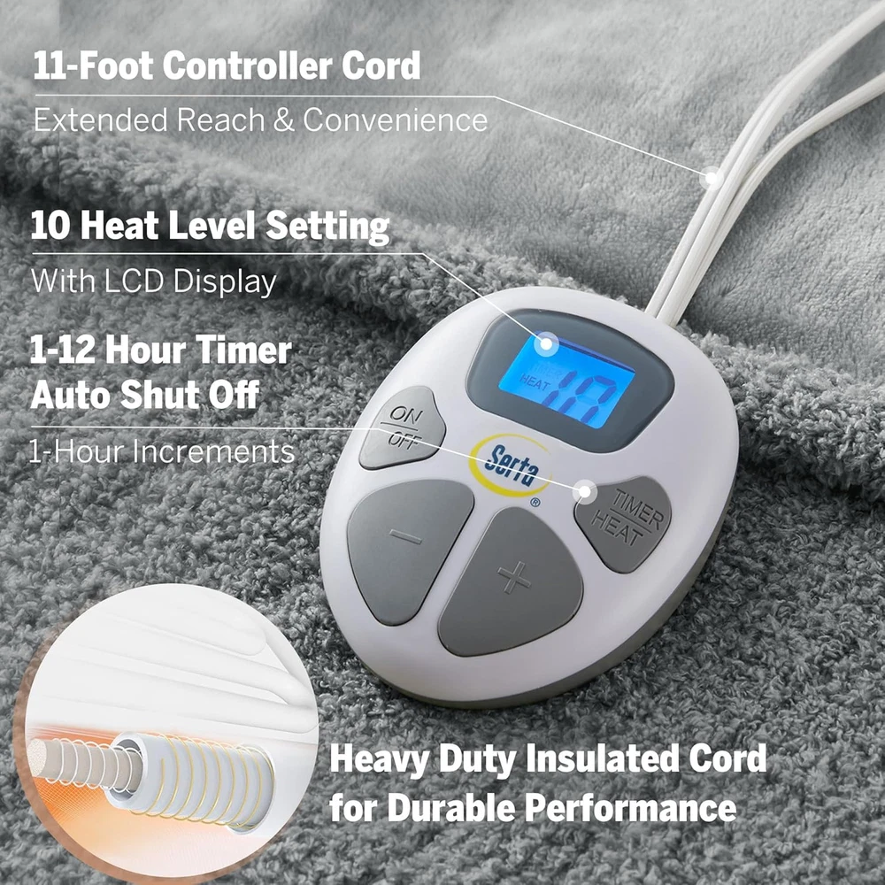 Sherpa Luxuriously Cozy: Experience the ultra-soft, cozy and warm for the perfect snuggle. Our fuzzy knit blanket is luxuriously soft and fluffy, providing cloud-like comfort. Oeko-Tex certified, ensuring high-quality and responsible craftsmanship Energy Saving: Stay warm and cozy while keeping electricity costs low. Our heated throw offers targeted heating on individual without raising your entire home's temperature. SIZE QUEEN OR LARGER comes with 2 controllers Premium Warmth: Even without electricity, this blanket keeps you warm and cozy. Soft, evenly spaced heating wires deliver quick, uniform heat, and it's ETL certified for safety and luxurious comfort Perfect Gift for Any Occasion: Luxuriously cozy feathersoft heated throw for cloudlike comfort. 10 level heat setting delivers adjustable heat and for added safety & convenience, it includes a 1-12 hour auto shut off Easy to Use: This twin-size (62x84") heated blanket is perfect for personal comfort. It’s conveniently machine washable. Confidently carry 5 year warranty. DO NOT LEAVE CONTROLLER COVERED WHEN IN USED TO AVOID OVERHEATING Luxuriously Cozy and Energy Efficient: Experience ultimate comfort with our fuzzy knit heated blanket, featuring a buttery-soft feel and cloud-like fluffiness. Crafted with high-quality, responsible materials and Oeko-Tex certified, it ensures safe, cozy warmth even without electricity. When powered on, soft, evenly spaced heating wires provide quick and uniform heat, while dual controllers on queen or larger sizes offer personalized comfort. With 10 adjustable heat settings and a 1-12 hour auto shut-off for safety, it’s the perfect energy-saving solution to stay warm without raising your home’s temperature. ETL certified and backed by a 5-year warranty, this blanket makes a perfect gift for any occasion. Note: Do not cover the controller during use to prevent overheating
