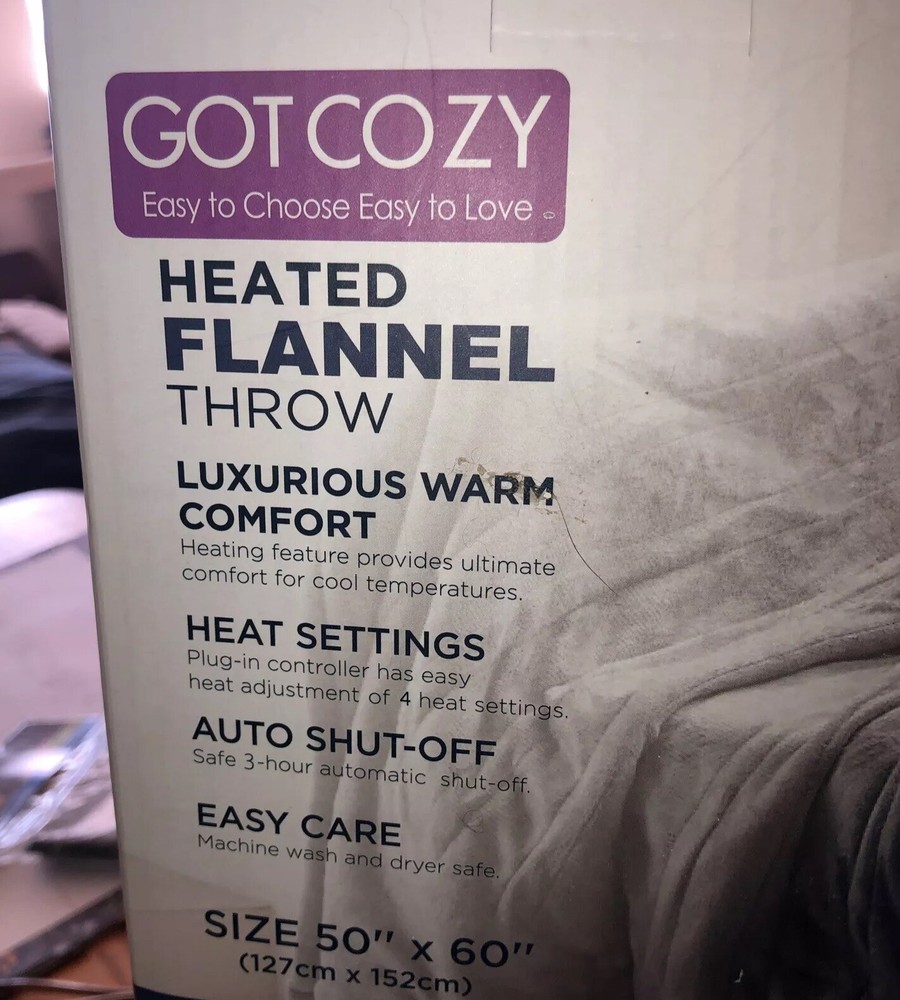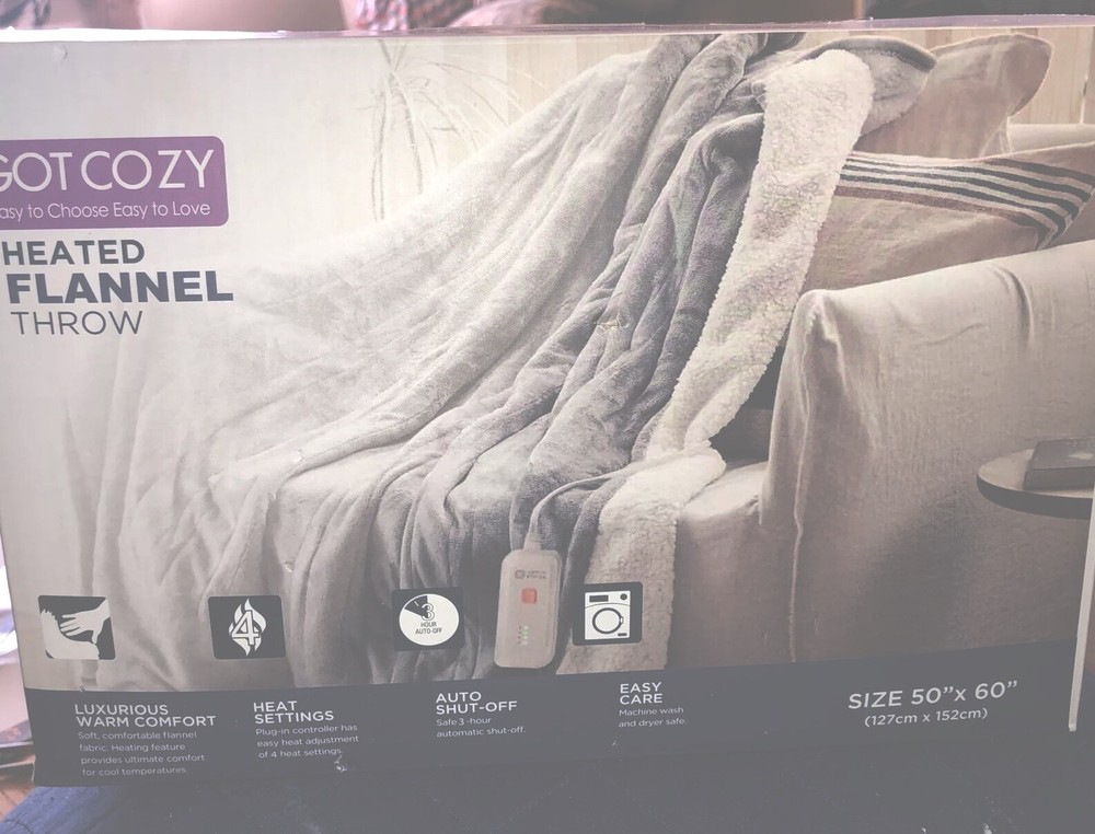 Stay cozy and warm with this Got Cozy Heated Throw. The flannel material and gray color make it a stylish addition to any bedroom. Measuring 50 x 60 inches, it's the perfect size for snuggling up on the couch or in bed. Featuring a heated throw with auto shut off, this blanket will keep you comfortable and warm throughout the night. Its warm insulation will keep you cozy, while its features make it a practical addition to your home. Whether you're looking for a comforting blanket or a stylish home accessory, this Got Cozy Heated Throw is the perfect choice.