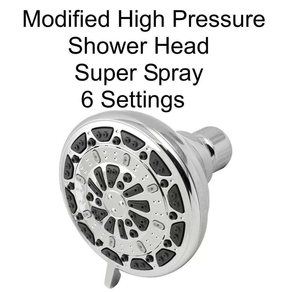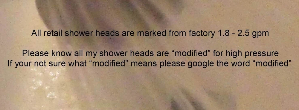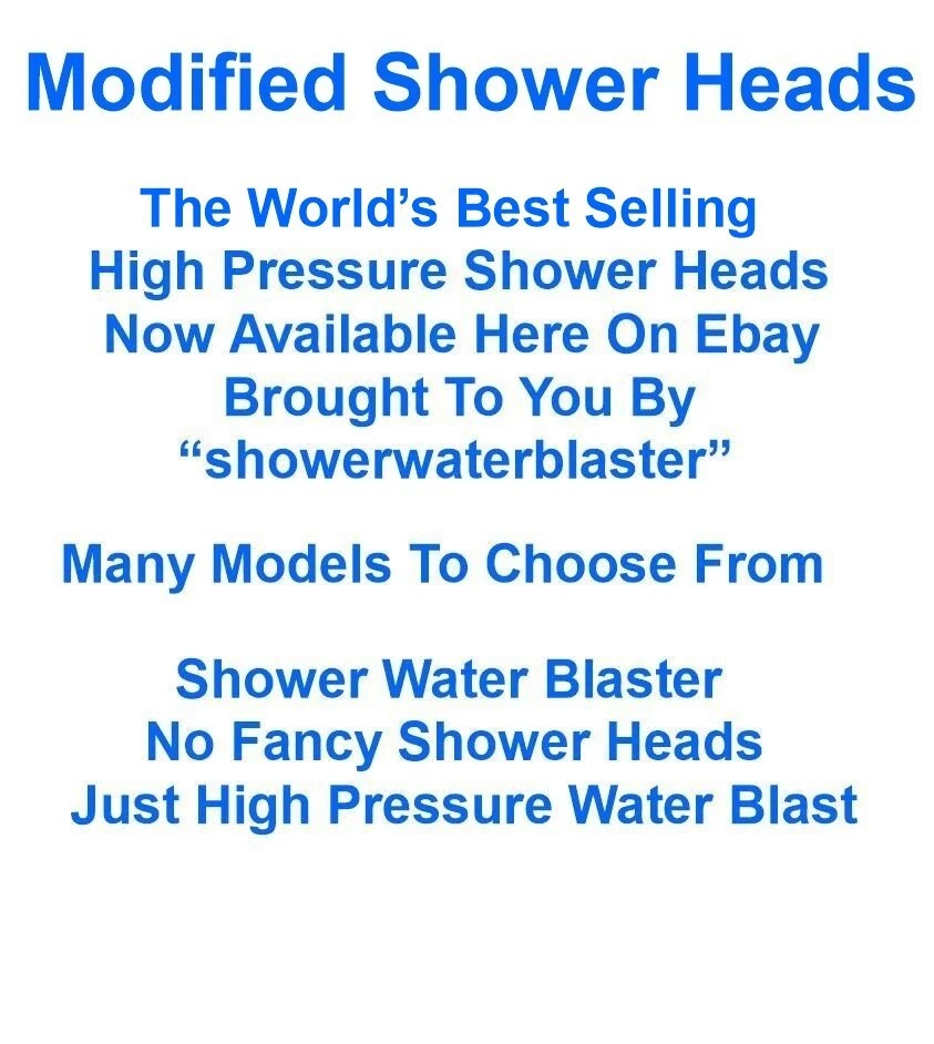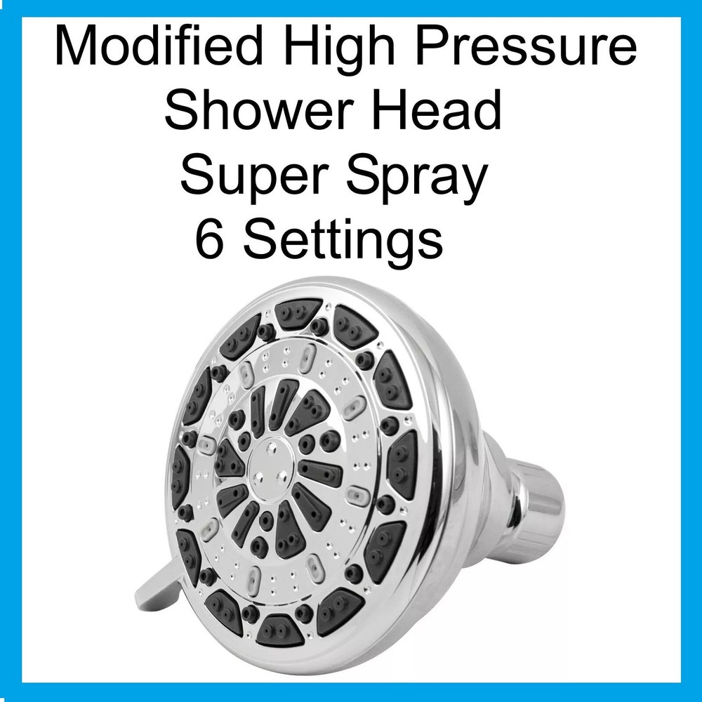 All Shower Heads Are Brand New Removed From Package For Modification Bulk Shipping (No Retail Package) Waxman by Delta Shower Head Modified To Give High Pressure Super Spray High Pressure 71 Faucet Holes 6 Patterns 3 3/4" Head, 30 degree swivel 100% Forever Quality Thermoplastic Chrome Plated Silver Chrome Finish Bored Open To Give High Pressure 10gpm Carefully Bored Out Not To Compromise The Integrity Of The Shower Head Shower Head Modified for Maximum Pressure Water Flow Yellow warning tape on neck is not permanent Easy to install just remove your old shower head an screw on your new shower head Black rubber gasket is provided To avoid breaking shower head it only needs to be hand tighten 30 day no risk no hassle returns - like it or return for refund Mailed USPS Ground Advantage (Formally 1st Class Mail) and now delivers in 3-8 business days Shipping 6 days a week If you have any issues (before posting feedback) do contact us Any Issues needs to be reported to us before posting feedback Posting negative or neutral feedback complicates matters and is not helpful for a resolution