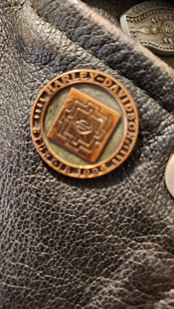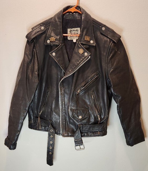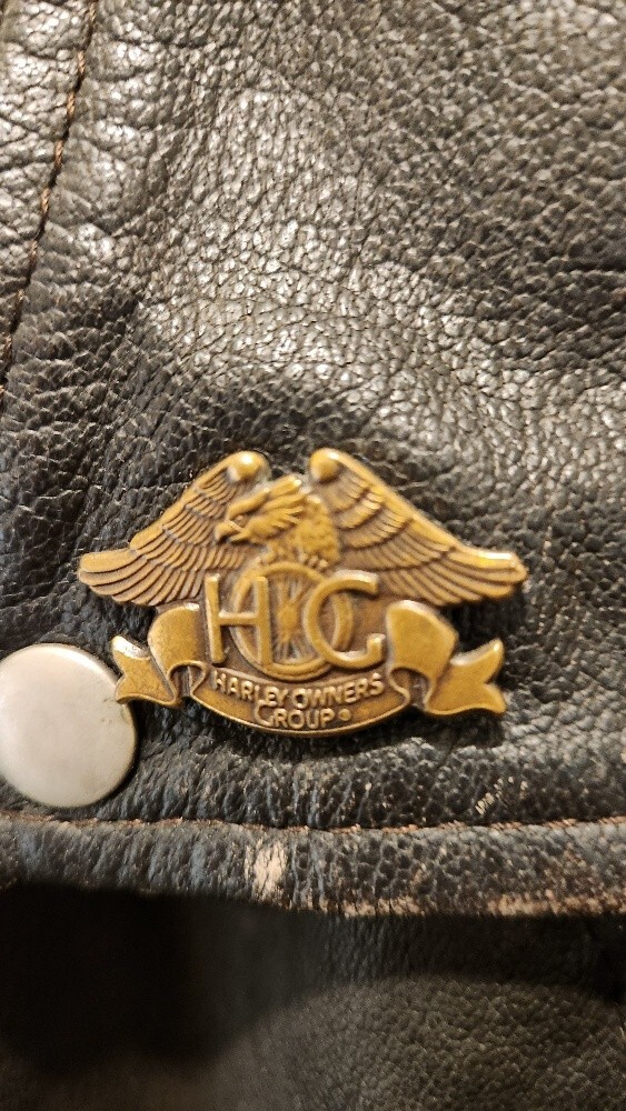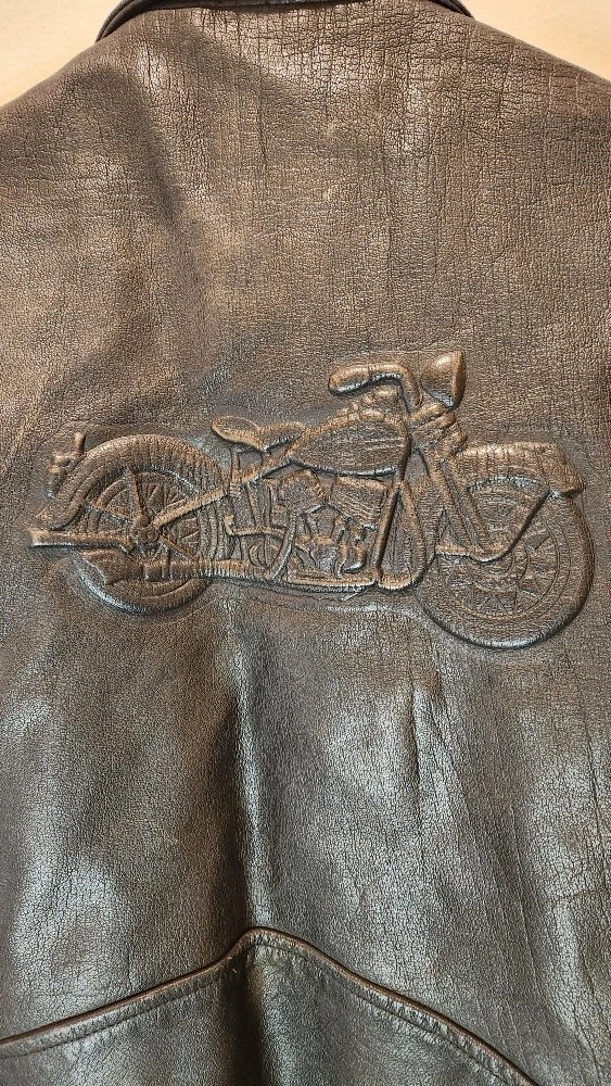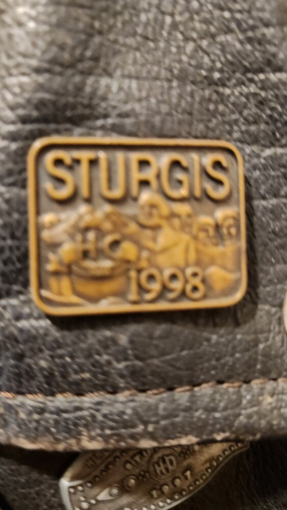 Get ready to ride with this stylish and versatile Highway One Men's Leather Jacket. Made from high-quality leather, this jacket is perfect for any occasion, whether you're hitting the road on your motorcycle or just looking for a stylish layer to wear over your favorite outfit. Featuring a black snap zip closure, this jacket is both easy to wear and wind-resistant, making it an ideal choice for outdoor activities. With a relaxed fit and a range of pockets, this jacket is perfect for storing your essentials while on the go. Whether you're a fan of the biker or motorcycle theme, or just looking for a stylish and functional piece of clothing, this Highway One Men's Leather Jacket is the perfect choice. The jacket includes an embossed image of a motorcycle on the back of the jacket. Jacket includes 4 classic pins as pictured: Sturgis 1996 Sturgis 1997 Sturgis 1998 HOG (Harley Owners Group) Measurements: Armpit to armpit = 23" Length = 25"