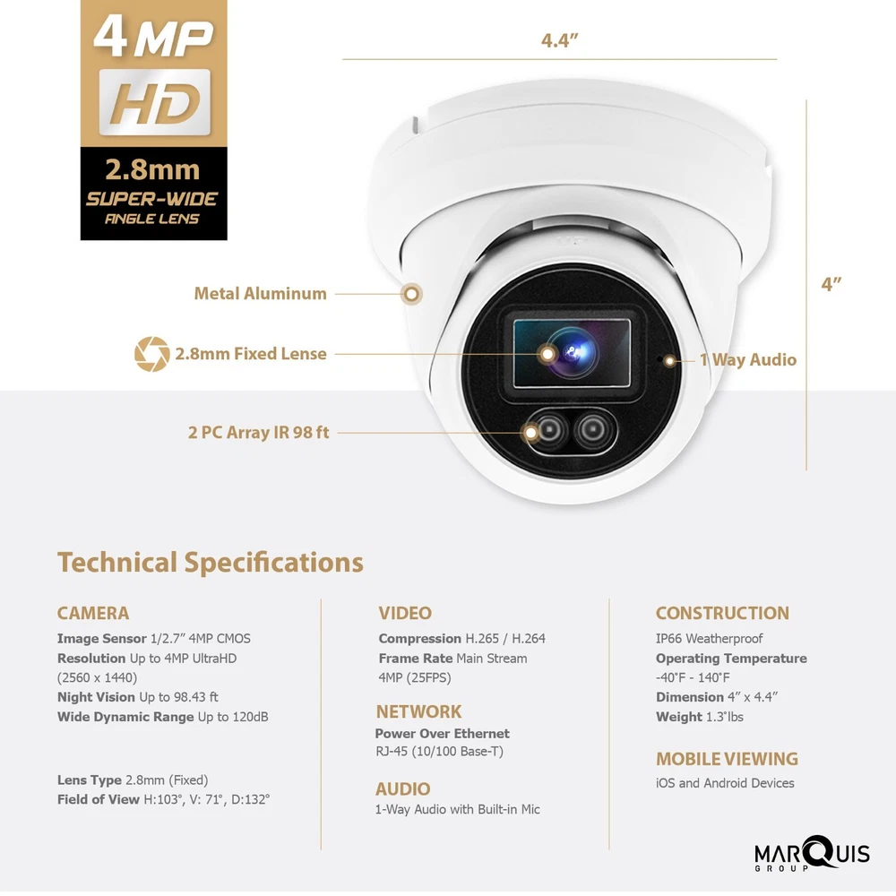 NDAA Compliant IP Camera Work with Hikvision Uniview NVR & Onvif System Camera Image Sensor: 1/2.9" Progressive Scan CMOS Signal System: PAL/NTSC Min. Illumination: Color: 0.01 lux @(F1.2, AGC ON), 0.028 Lux @(F2.0, AGC ON), 0 lux with IR Slow shutter: Support Shutter time: 1/3 s to 1/100,000 s Lens: 2.8 mm, horizontal field of view: 97° Lens Mount: M12 Adjustment Range: Pan: 0° to 355°, tilt: 0° to 75°, rotate: 0° to 355° Day& Night: IR cut filter with auto switch Wide Dynamic Range: 120 dB Digital noise reduction: 3D DNR Focus: Fixed Compression Standard Video Compression: H.265/H.264/MJPEG Video bit rate: 32Kbps~16Mbps Triple Streams: Yes Image Max. Image Resolution: 2560 x 1440 Frame Rate: 50Hz: 12.5fps (5MP), 20fps (4MP), 25fps (2MP) 60Hz: 15fps (5MP), 20fps (4MP), 30fps (2MP) Image Enhancement: BLC/3D DNR/BLC Image Settings: Rotate mode, saturation, brightness, contrast, sharpness and white balance adjustable by client software or web browser ROI: Support 1 fixed region for main stream and sub stream separately Day/Night Switch: Day/Night/Auto/Schedule/Triggered by Alarm In(-S) General Operating Conditions: -30 °C ~ 60 °C (-22 °F ~ 140 °F) Humidity 95% or less (non-condensing) Power Supply: 12 VDC ± 25%, PoE (802.3af Class3) Power Consumption: 12 VDC ± 25%, 6.2 W PoE(802.3af, class 3), 9 W Impact Protection: IK10 Weather Proof: IP67 IR Range: Up to 30m