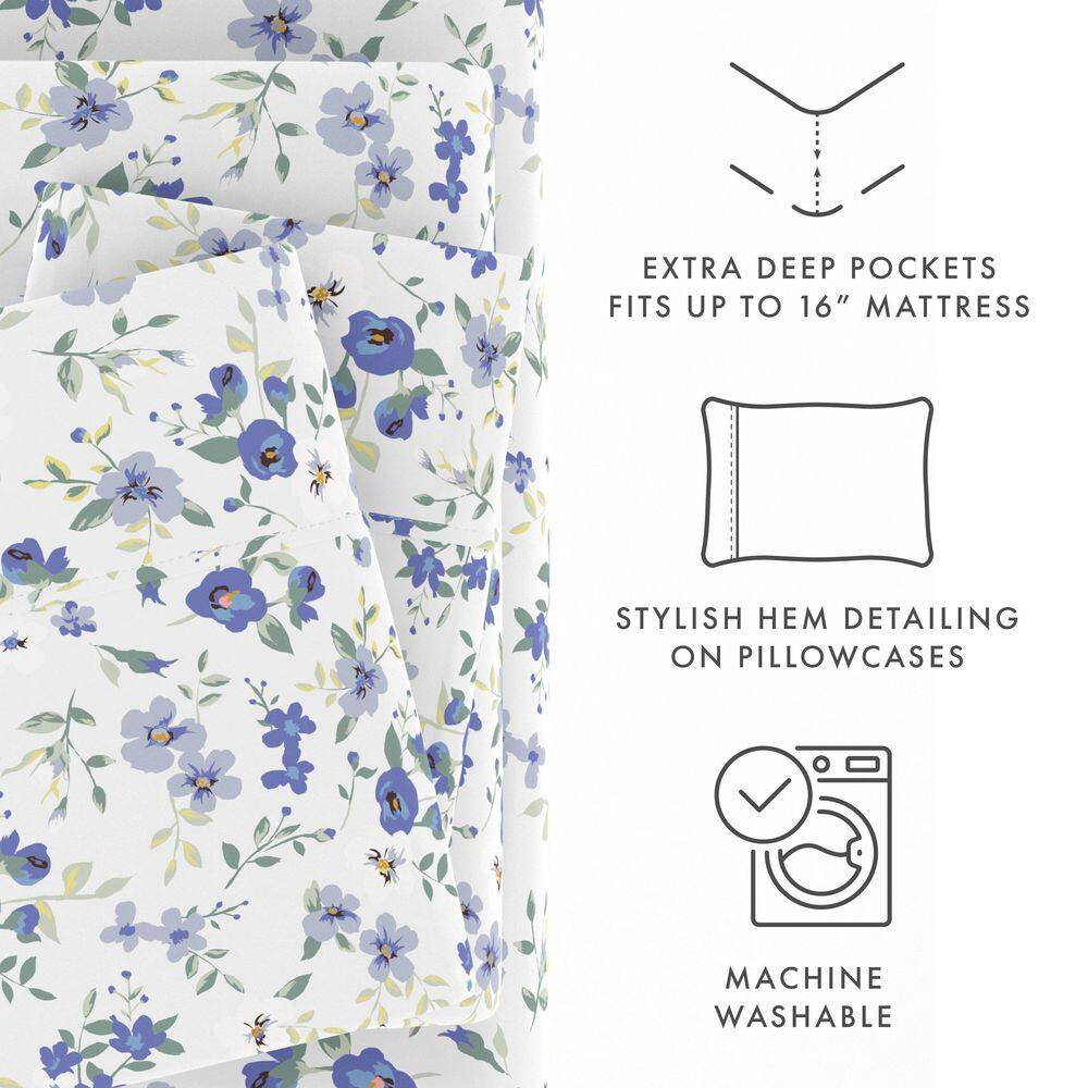 Includes 1-Flat, 1-Fitted, 2-Pcases (TW sets 1-Pcase) 16 in. Deep-Pocket Fitted Sheets Hypoallergenic and antimicrobial for sensitive skin The Becky Cameron Blossoms 4-Piece sheet set is designed with your comfort in mind. Add a designer accent to your bedroom decor. Made of the finest imported double-brushed microfiber yarns creating a new standard in softness and breathability, this 4-piece sheet set will make it incredibly hard to get out of bed in the morning. Our premium yarns are two times more durable than cotton, completely wrinkle free, and perfect for all seasons. Double-brushed microfiber for outstanding comfort Easy Care: Machine wash cold, Tumble dry low, Fade Resistant, Wrinkle Free, No Ironing Necessary Superior weave for durability and a buttery-soft touch California King Size Set Includes: 1 California King Fitted Sheet: 72" W x 84" L + 16" ; 1 California King Flat Sheet: 108" W x 102" L ; 2 King Pillowcases: 20" W x 40" L King Size Set Includes: 1 King Fitted Sheet: 78" W x 80" L + 16" ; 1 King Flat Sheet: 102" W x 105" L ; 2 King Pillowcases: 20" W x 40" L Queen Size Set Includes: 1 Queen Fitted Sheet: 60" W x 80" L + 16" ; 1 Queen Flat Sheet: 90" W x 102" L ; 2 Standard Pillowcases: 20" W x 30" L Full Size Set Includes: 1 Full Fitted Sheet: 54" W x 75" L + 16" ; 1 Full Flat Sheet: 81" W x 96" L ; 2 Standard Pillowcases: 20" W x 30" L Twin Size Set Includes: 1 Twin Fitted Sheet: 39" W x 75" L +16" ; 1 Twin Flat Sheet: 66" W x 96" L ; 1 Standard Pillowcase: 20" W x 30" L
