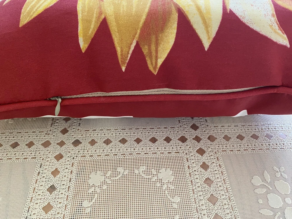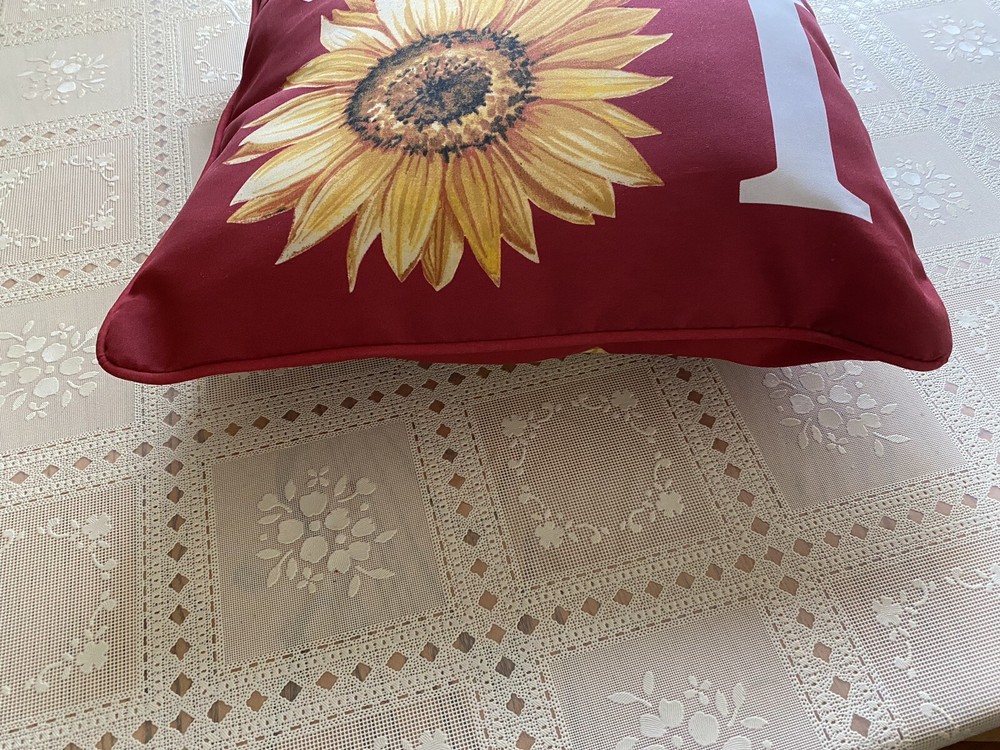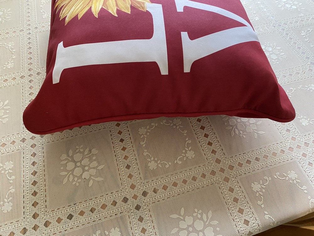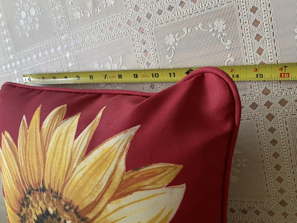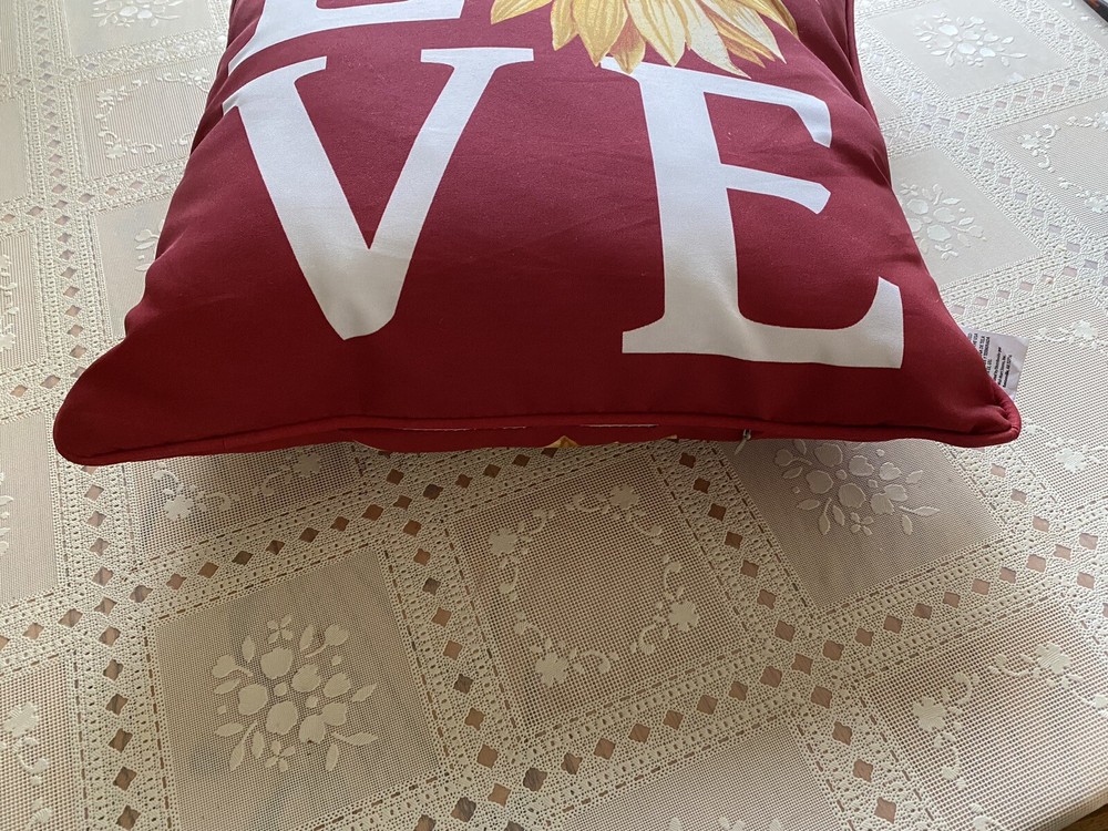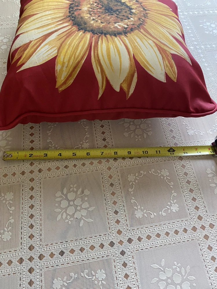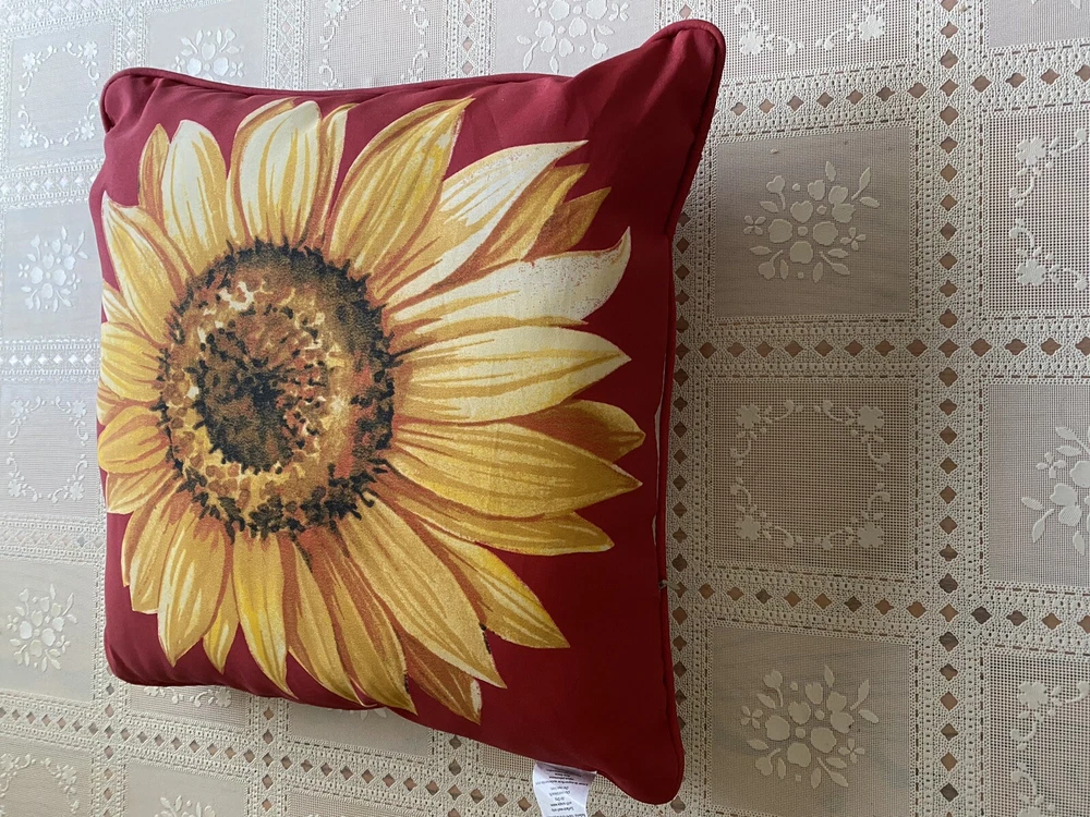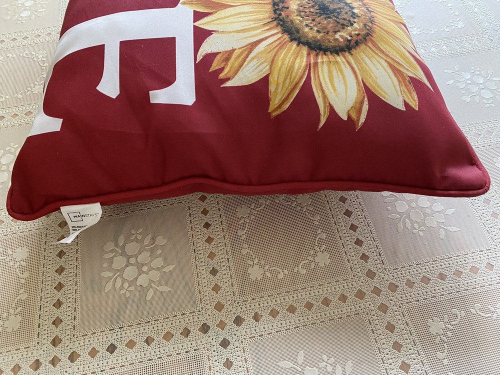 Add a touch of nature to your home decor with this beautiful decorative pillow from Mainstay. Featuring a vibrant sunflower pattern in red, yellow, and white, this 15 x 15 inch square pillow is perfect for both outdoor and can be used for indoor use. Made of 100% polyester material, it is resistant to water, stains, mold and mildew and will add a touch of elegance to any room. The sunflower theme is perfect for those who love natural elements and want to add a pop of color to their decor. This pillow is made in China and is sure to brighten up any space. Please refer to photos. Ships from smoke free pet free home We do our best to identify and highlight any issues, defects, or flaws in our items but there are times we miss things. Please review all photos and feel free to message us for more detailed information, close ups, specifics, or measurements.