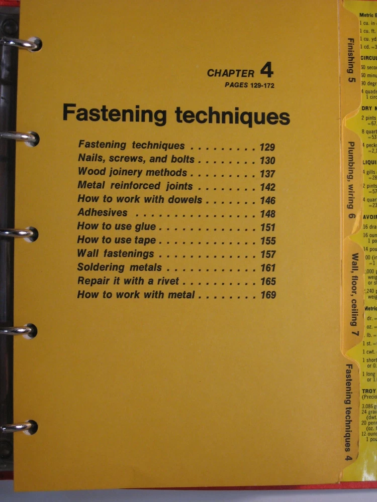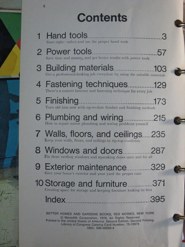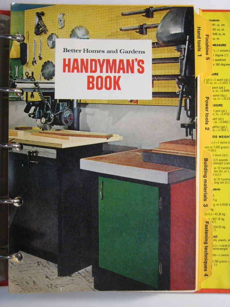 PoThis vintage Home Handyman's Book from 1970 is a must-have for any DIY enthusiast. The 5-ring binder comes with index tabs for easy navigation, and the book covers a wide range of home repair and improvement topics. The book is in its original form and is illustrated throughout, making it a great addition to any collection. The language used in the book is English, and the publisher is Better Homes & Gardens. This book falls under the categories of Antiquarian & Collectible and Books & Magazines. It is an original printing and special attributes of the book include being hardcover and illustrated. Get your hands on this classic now! Handyman's Book. by Better Homes & Gardens. 5-ring binder. 1970, 2nd edition, 2nd printing. 8 1/2 by 10 inches. Ten (10) chapters plus an Index. Sample subjects: * Hand Tools * Power Tools * Building Materials * Fasteners * Plumbing * Wiring * Walls * Floors * Ceilings * Windows * Doors * Exterior Maintenance * Storage * Furniture Thank you!
