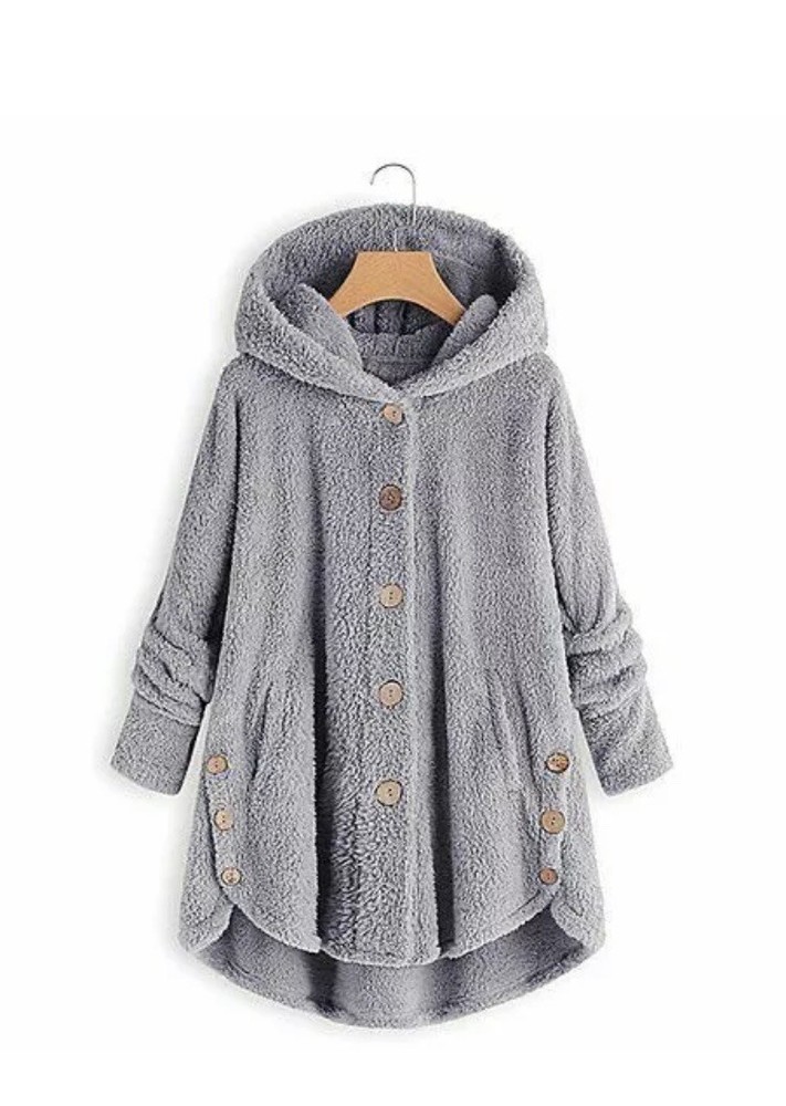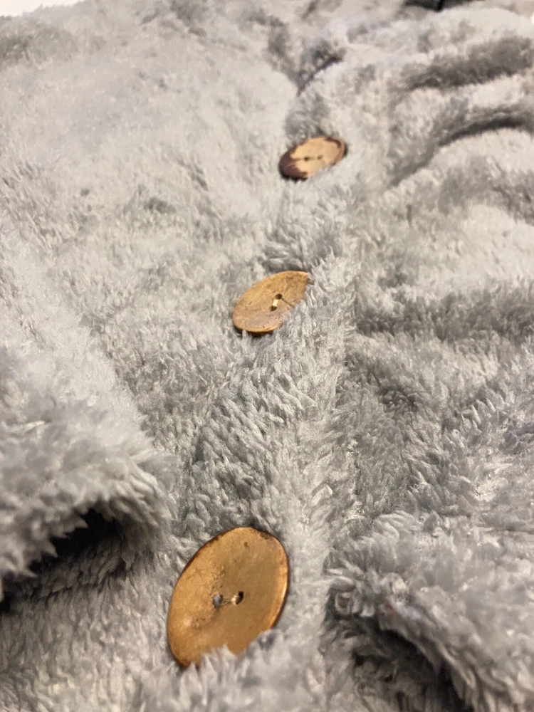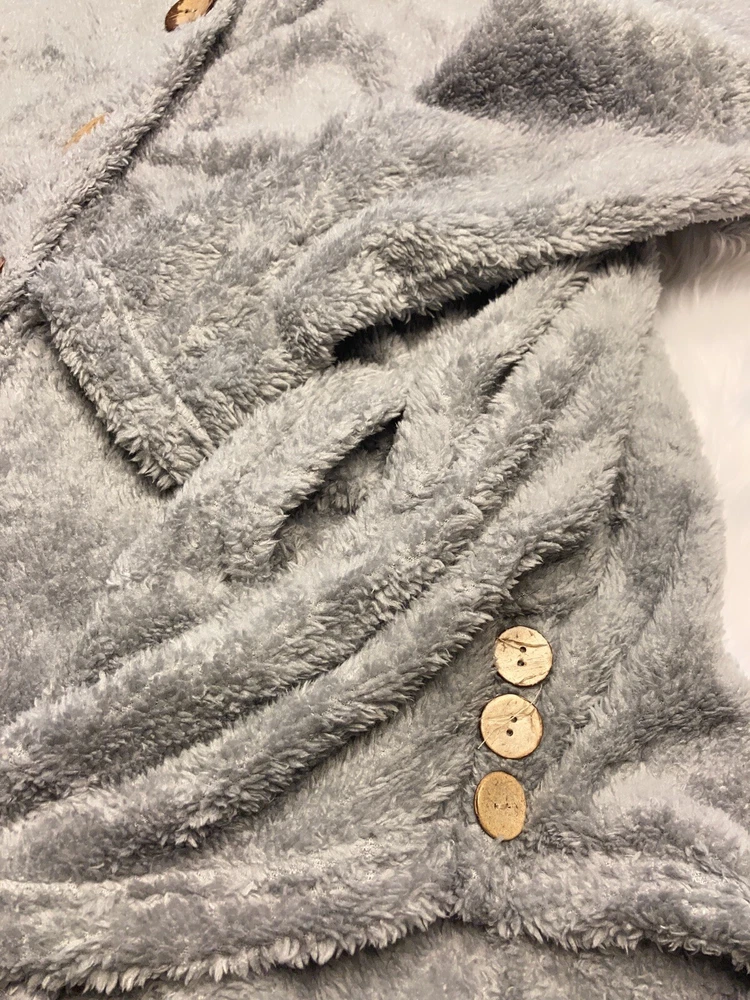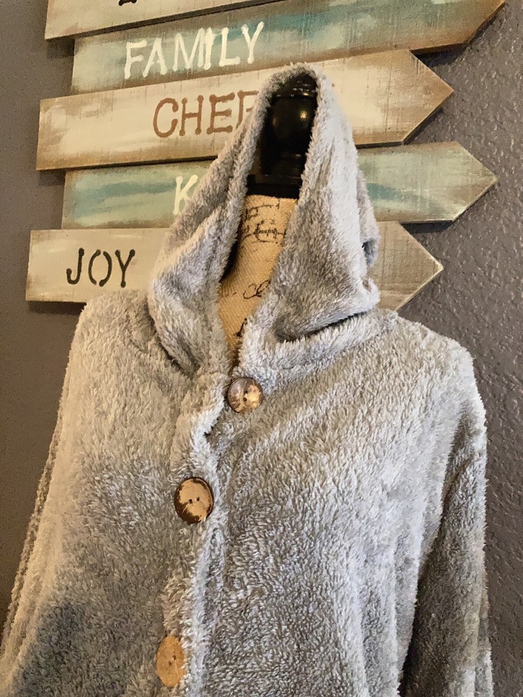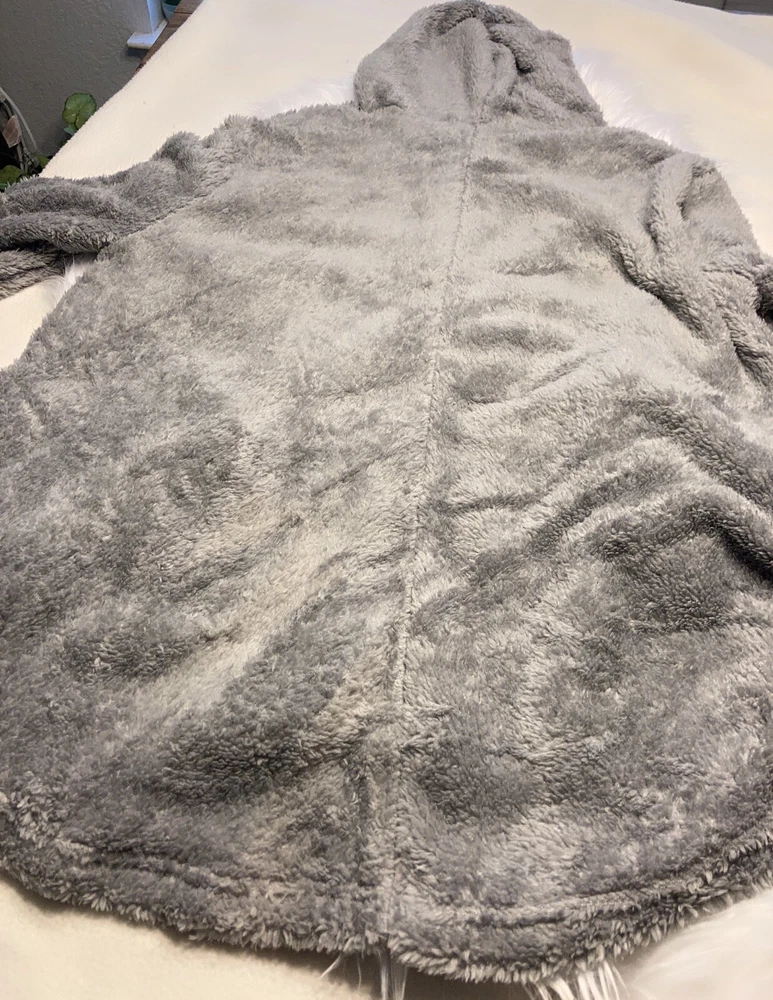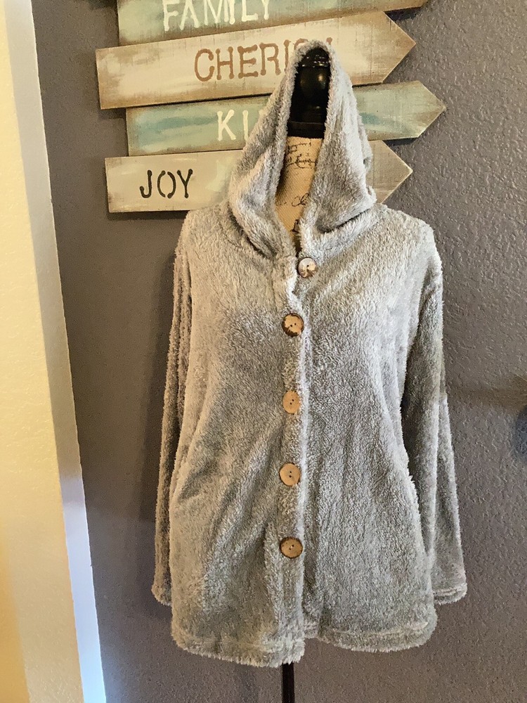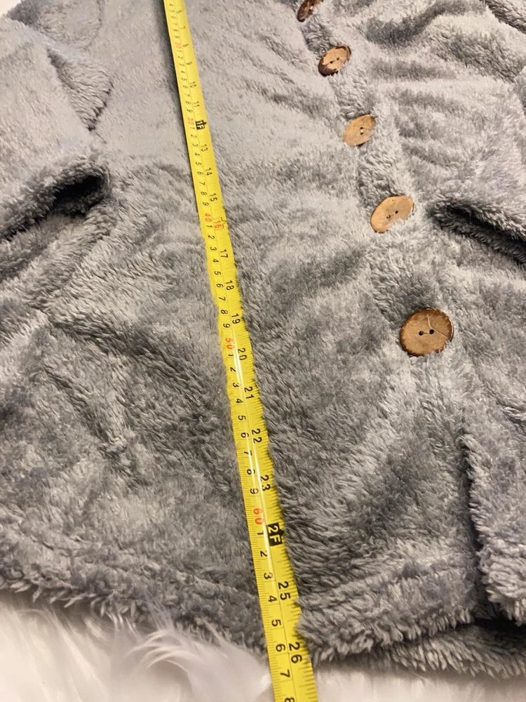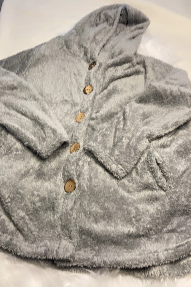 Hooded Teddy Jacket M. Shipped with USPS Priority Mail. Light weight cozy jacket that you can wear it to any places. It has pockets and side decorative buttons. Measurements are provided on pictures & they are taken flat and without stretch. All measurements are apprx. No size tag, fits as size M. It may fit to size L too. Color is heather gray. No returns.