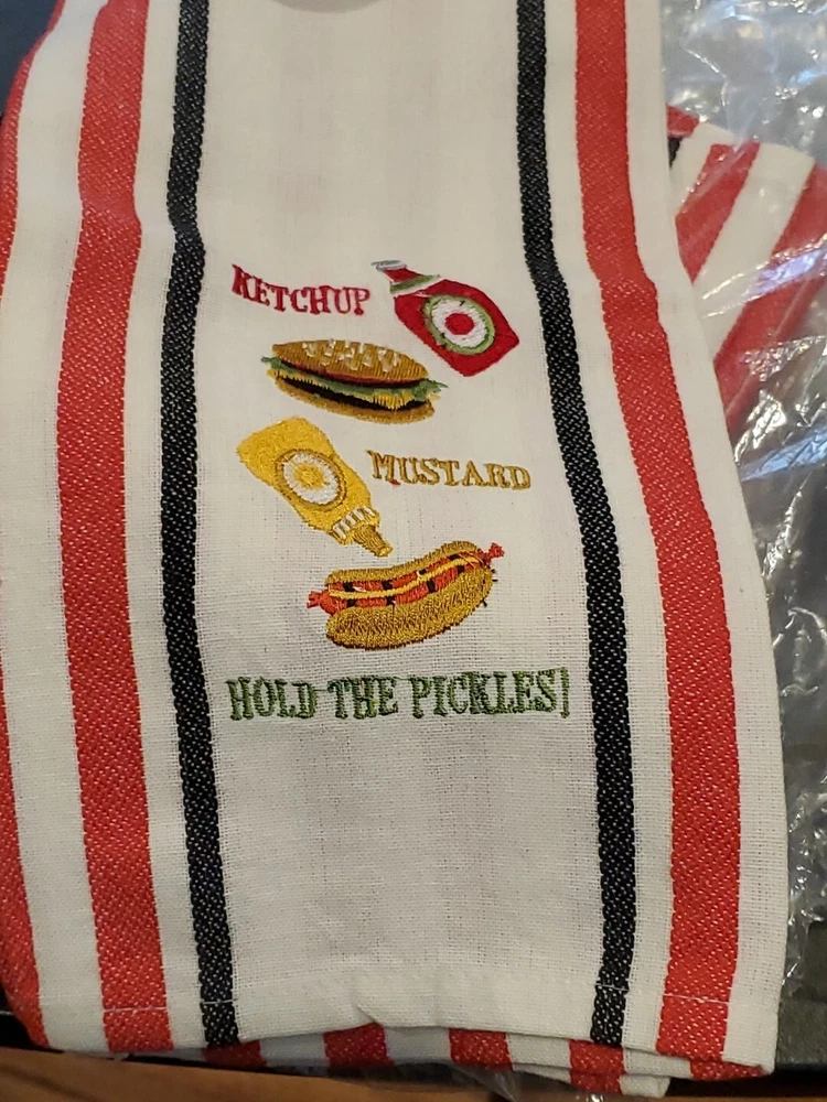 Great house warming gift for new home owners. Hostess Gift. Gift basket. Grilling gift. Webber grill. Order up to 6 towels - Discounted shipping automatically applied ($0.75 for each additional towel purchased) See my other listing for coordinating "What's Cookin'?" towels *** eBay item number: 235398512512 https://www.ebay.com/itm/235398512512 Have a blast with these cute dish hand towels at your next family gathering, picnic, or just to liven up your kitchen for cookout holidays theme DII Kitchen Hand Towel Cookout Burger Hotdog Mustard Hold the Pickles 18 x 28" Design Imports Seattle, WA New with tags.