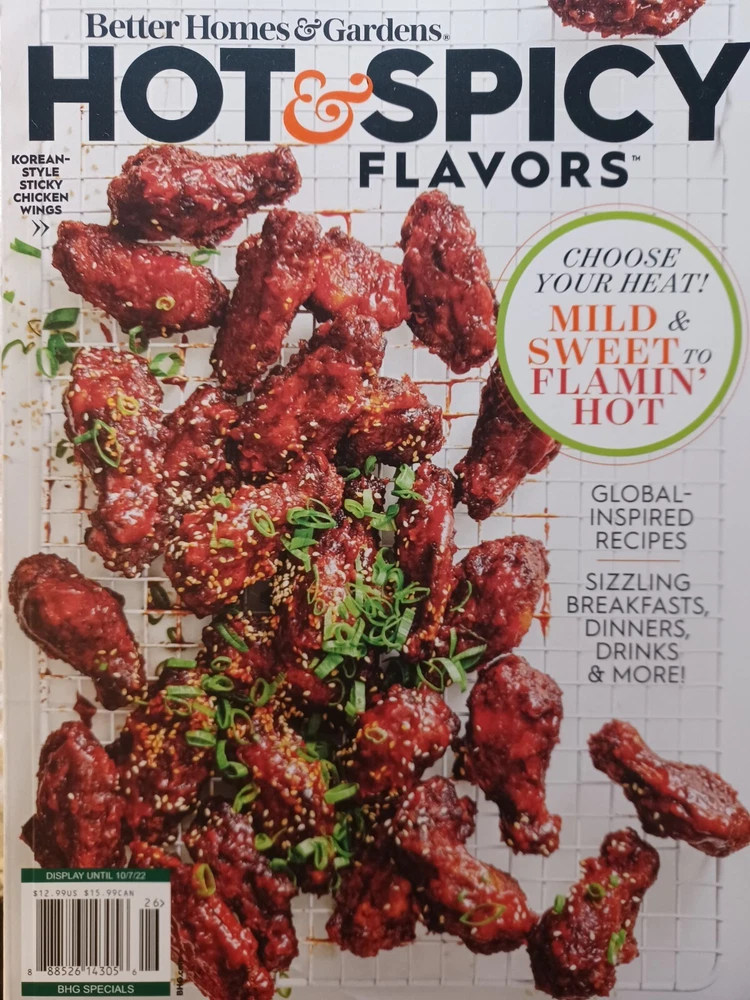 Hot & Spicy Flavors Better Homes & Garden Magazine. To see table of contents please see pictures. Shipped with media mail. **These Magazines are new as in never owned before. They are magazines I recieve that didn't sell off the retail shelves. They are in great condition. Not perfect. Some are perfect. I don't list these as collector items. If you would like a picture of the copy you recieve I can send pictures upon request. I ship all of my magazines with cardboard to ensure no damage from post office. When you open the envelope, the side with the address has the cardboard and safe to cut open on that side. Please take a look at seller's other magazine's 😊