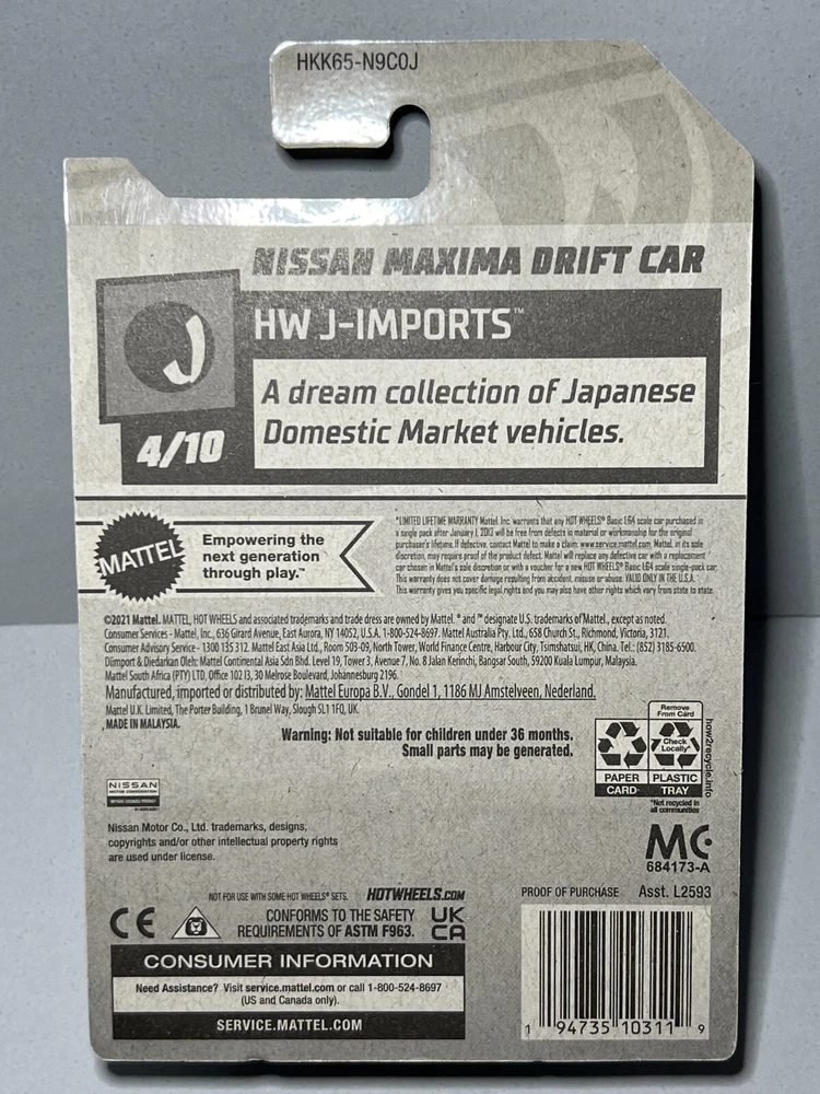 The Nissan Maxima is a full-sized car produced by Nissan since 1980, now in its eighth generation. It is offered as Nissan's flagship sedan mainly in North America, the Middle East and China. This casting is intended to represent a G910 Maxima station wagon modified for drift usage, with an RB26 engine from a Nissan Skyline in place of the L24E inline-6. This casting marks the debut of the FC3 wheel. Of note was that a Maxima was Hot Wheels designer Dmitriy Shakhmatov's first car in the United States. *COMBINED SHIPPING AVAILABLE*
