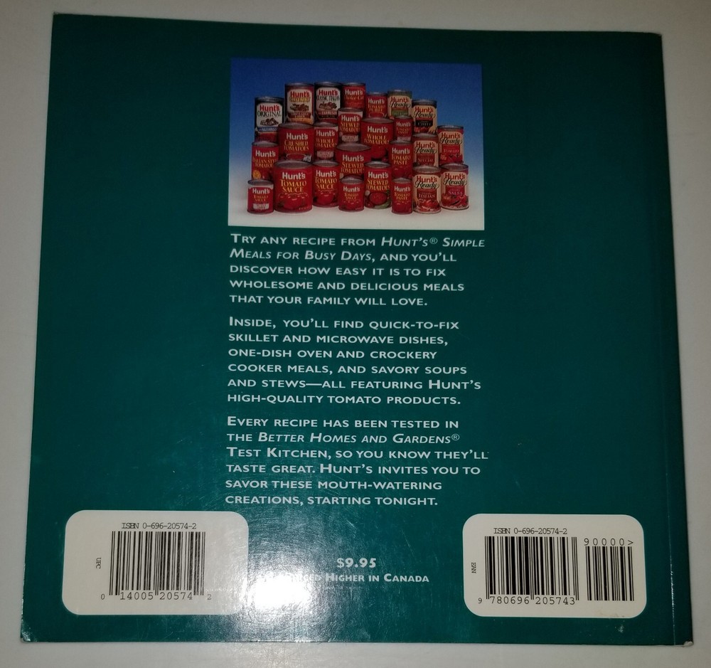 Introducing Hunt's Simple Meals for Busy Days, a must-have recipe book for foodies and home cooks alike. Packed with 65 delicious recipes, this trade paperback is authored by Better Homes and Gardens Editors and published by Meredith Books in 1996. The book focuses on general cooking and covers a wide range of recipes suitable for adults. The book is illustrated with photographs by renowned photographers and contains 95 pages of cooking topics. Our copy is in very good condition, making it a perfect addition to your cookbook collection. So, whether you're looking for quick and easy meal ideas or want to experiment with new recipes, Hunt's Simple Meals for Busy Days has got you covered. Shipped upon a cleared payment. Is a trade paperback sized book. Has 95 numbered pages Published by Meredith Corporation as stated on the pictured copyright page. Book cover has edgewear and marks. Book is in very good condition. All items in my store can be combined shipped upon request if you purchase more than 1 item. I don't compare or proofread addresses on purchases between items or look at labels until I package items for shipping, so if you purchase more than 1 item, it sends separately unless requested combined shipping via eBay messaging. I make all arrangements on purchases or deals through eBay messaging only and not via phone calls. All my shipping timelines and policies are posted on my store in the section provided by eBay for their store subscribers. Please do consult these sections for further clarification if you need it. I am always willing to answer questions about my store and items. Thanks for your time, reading my listing, and looking. I hope you'll look forward to my other listings and other media items in the " Book " tabbed items section at my store at Sch-8076 . Thank You.