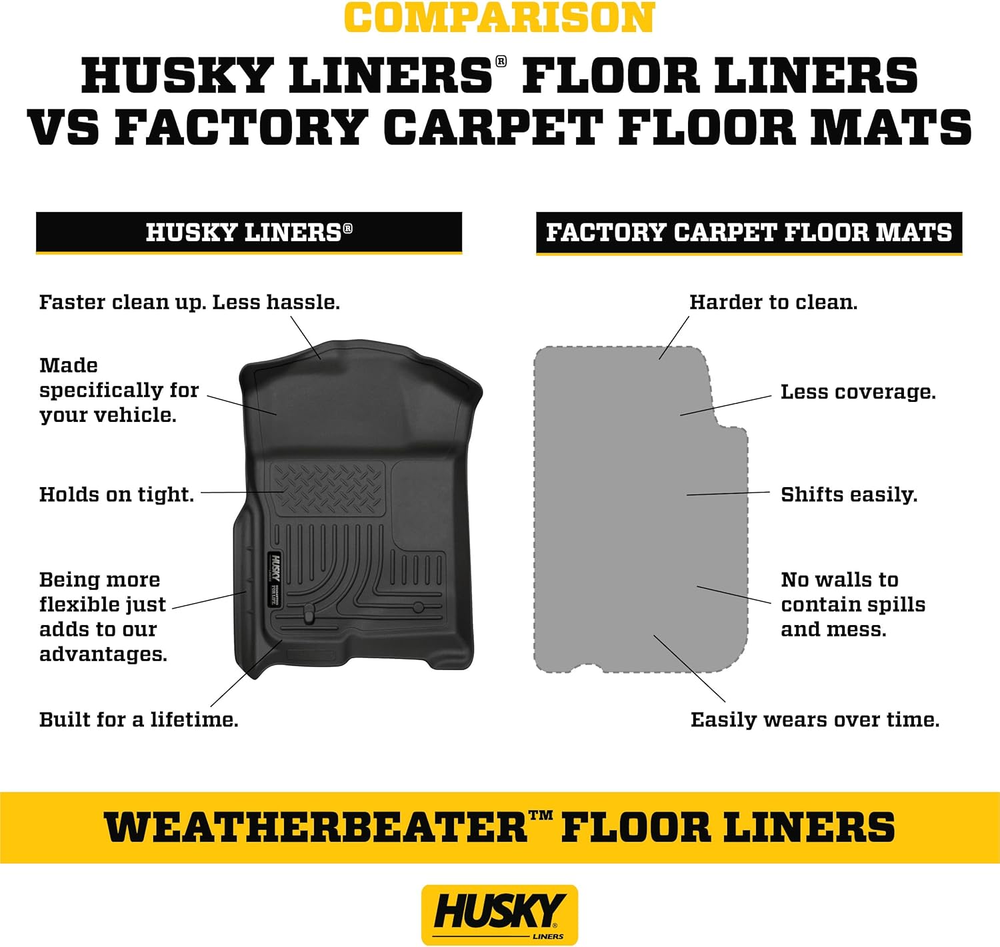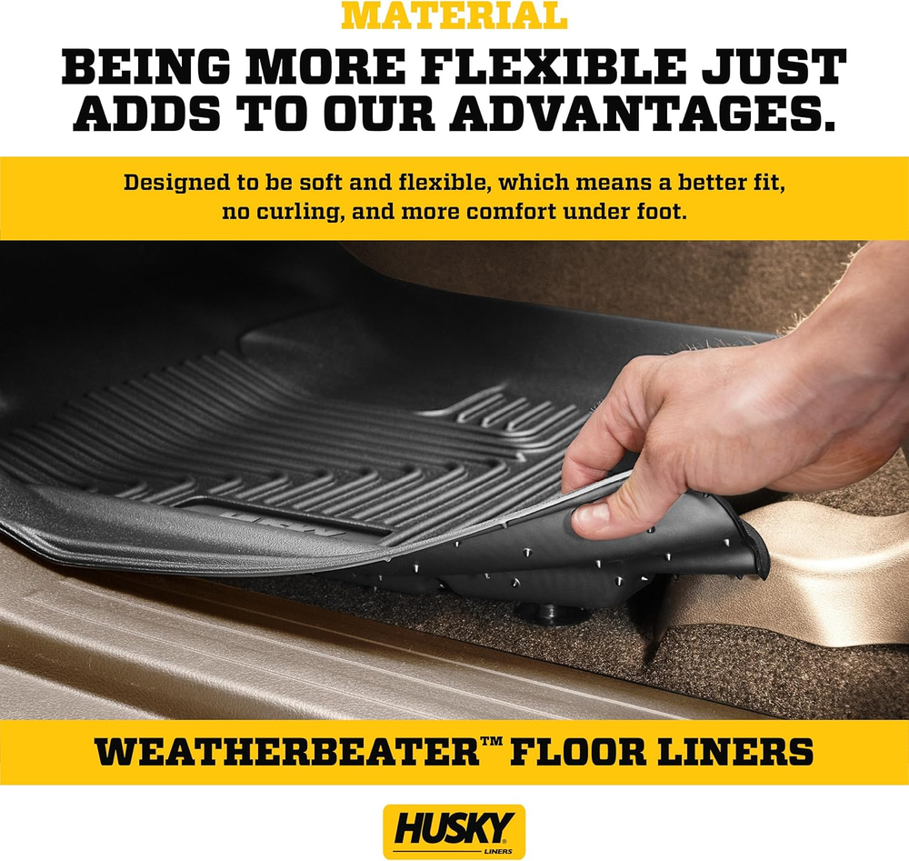CUSTOM FITMENT | 2015 - 2021 Ford Transit 150/250/350/350HD w/Carpet Flooring HIGH DURABILITY | ProGard formula gives you a long-lasting liner that’s guaranteed for life. EASY CLEAN UP, EVERY TIME | Easy to remove and reinstall with our ProGard formula, which means you can clean quickly and get back to doing literally anything else. PRECISION LASER-TIGHT FIT | Floorboards are 3D laser-scanned to precisely fit your vehicle for edge-to-edge coverage based on its specific make, model and year. SECURED WITH HUNDEDS OF STAY PUT NIBS | Backed with hundreds of StayPut Nibs that penetrate carpet for a no-slip, no-slide, stable surface with absolutely zero compromise in protection. COMFORT UNDERFOOT, MILE AFTER MILE | Designed to be soft and flexible, which means a better fit, no curling, and more comfort underfoot. BUILT FOR A LIFETIME | Stay like new no matter what you throw at them, providing extended protection and peace of mind. MADE IN THE USA | Husky Liners Floor Liners stand up to everyday life and stay like new. Proudly made in the USA. LASER-TIGHT FIT MEETS DURABILITY | The Weatherbeater combines a laser-tight fit with the high durability that built the Husky reputation. The original all-weather liner is ready, come rain, snow or dropped coffee. The Weatherbeater’s construction is a no-slip zone with no edge curl, and its StayPut Nibs keep it firmly anchored underfoot. It stands up to the adventures of everyday life while staying tough and flexible, even under extreme temperatures. Its laser-scanned, FormFit Design gives your truck, van, or SUV an ultra-clean look with easy cleanup to match, while its FormFit Edge keeps spills contained and carpets unstained. It’s unbeatable Husky protection guaranteed for life. Proudly made in the USA.