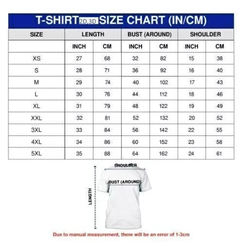 WELCOME TO OUR STORE T-shirt type: If you are looking for a shirt for yourself or a gift for a loved one, our store is the perfect place to help you do it. We have a wide variety of t-shirt designs for you to choose from. We have attached the size chart so you can choose the right size. DESCRIPTION: Decoration type: we use the Direct to Garment (DTG) printing method. In DTG printing, water-based inks are sprayed directly onto the fabric and absorbed by the fibers. This allows for highly detailed and vibrant prints, making it ideal for complex designs and a wide range of colors. Material: 100% Cotton Available sizes: S, M, L, XL, 2XL, 3XL, 4XL, 5XL CARE INSTRUCTIONS: Machine wash: warm (max 40C or 105F); Non-chlorine: bleach as needed; Tumble dry: medium; Do not iron; Do not dryclean. SHIPPING: We will process your order as soon as you place it. 5-7 days (or maybe faster) for shipping time We use USPS and UPS shipping services, so you can rest assured that your order will be delivered. SERVICE: Due to lighting effect and computer color, the actual color may be slightly different from the picture. Hope for your understanding on this. But customers who have used our products are very satisfied with the products they receive from us. We do not accept returns of goods for the following reasons: Customers choose the wrong size. we only accept return for damage or bad printing result (Please message us and provide pictures, the problem will be solved.) FEEDBACK: The satisfaction of our customers is the first place for us. If you are happy with your purchase, PLEASE take a moment to leave Positive feedback for us. We really appreciate that. If you are not happy with the purchase, PLEASE contact us to resolve the problem. We are always here to give you the best solutions. THANK YOU SO MUCH, HAVE A GOOD DAY!