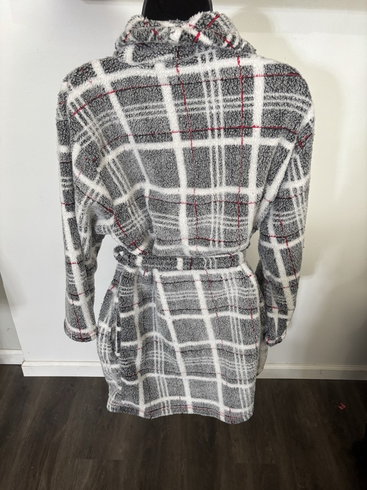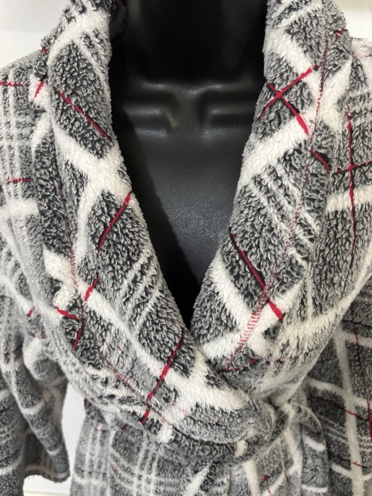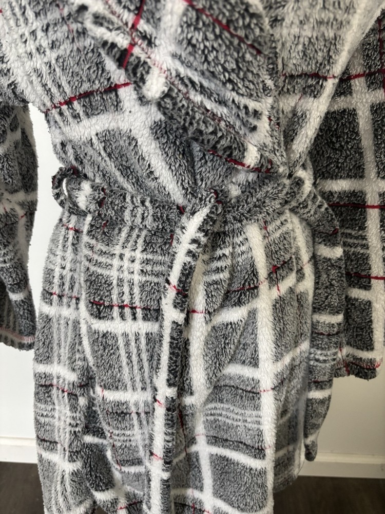 Wrap yourself in the cozy elegance of the I Appel Women's Plaid Robe, a perfect companion for those seeking both comfort and style. The robe features a timeless white, black, and red plaid pattern that brings a playful yet classic touch to your loungewear. With a kimono-style design and long sleeves, it's tailored for a regular fit in a size M, ensuring a flattering and comfortable silhouette. Crafted from soft polyester fleece, this robe ensures warmth and ease of movement. Its collared neckline and tie closure add a touch of sophistication, while the belted feature allows for a customizable fit. Versatile enough for fall, spring, summer, or winter, it's a must-have for those chilly evenings or as a stylish layer for cooler days.