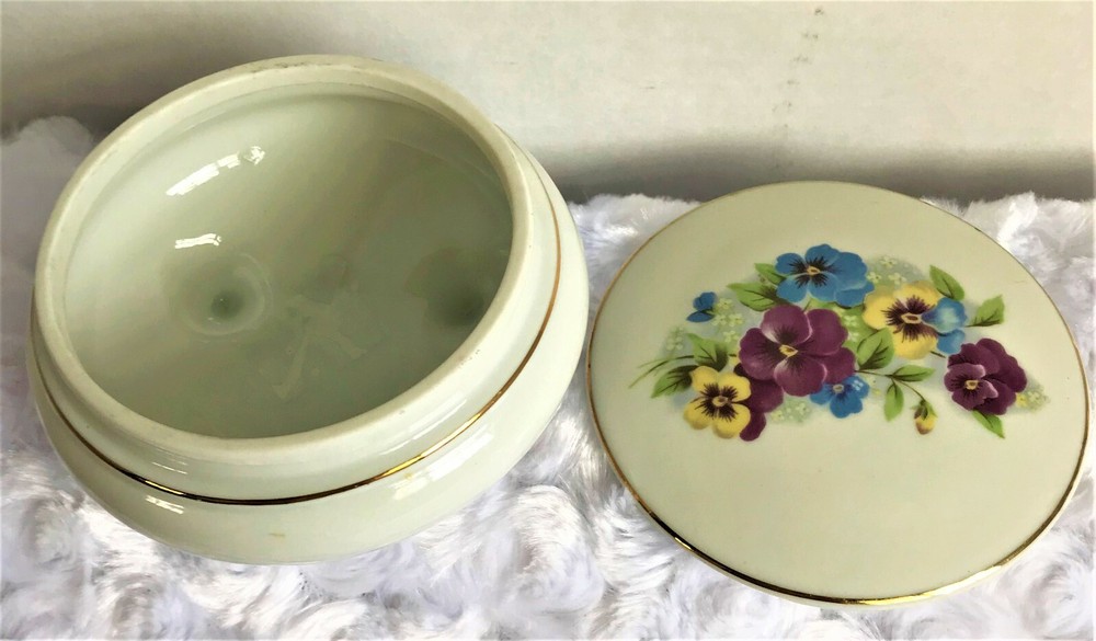 This is a very nice I.W. Rice trinket box with colorful pansies on the cover. It is in excellent condition and measures 2 inches tall and 3 inches across the opening. It is white porcelain, with pansi...