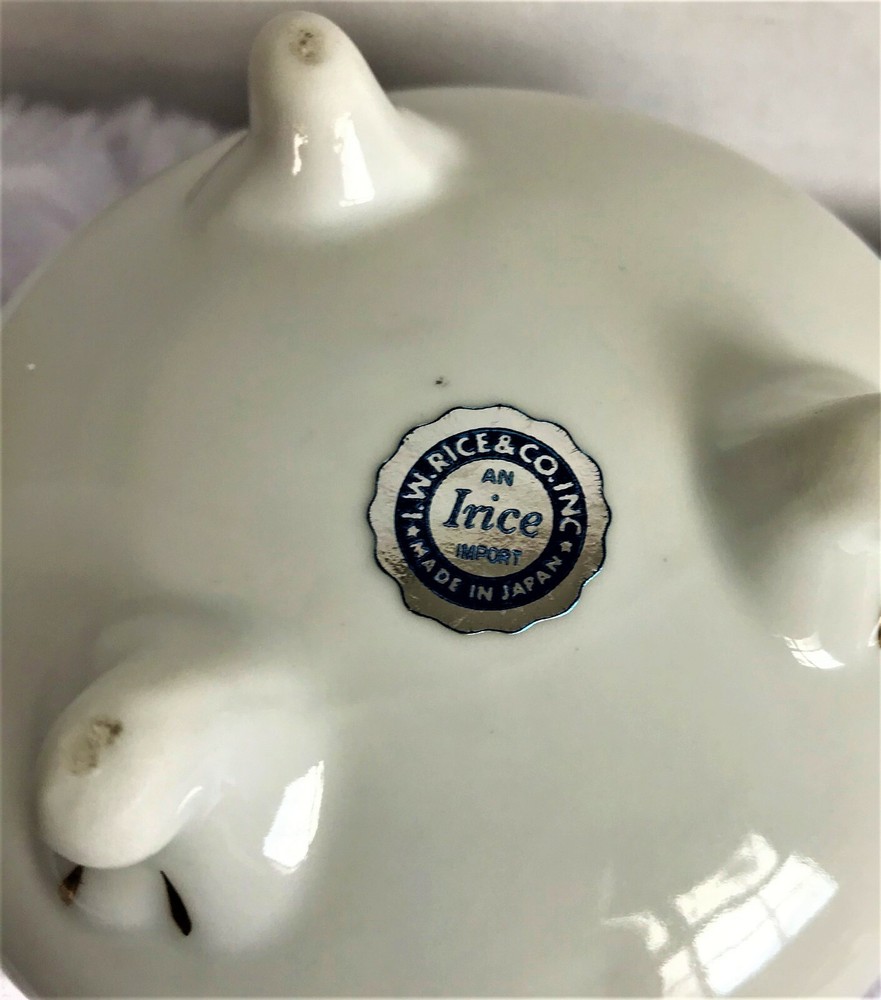 This is a very nice I.W. Rice trinket box with colorful pansies on the cover. It is in excellent condition and measures 2 inches tall and 3 inches across the opening. It is white porcelain, with pansies and gold trim.