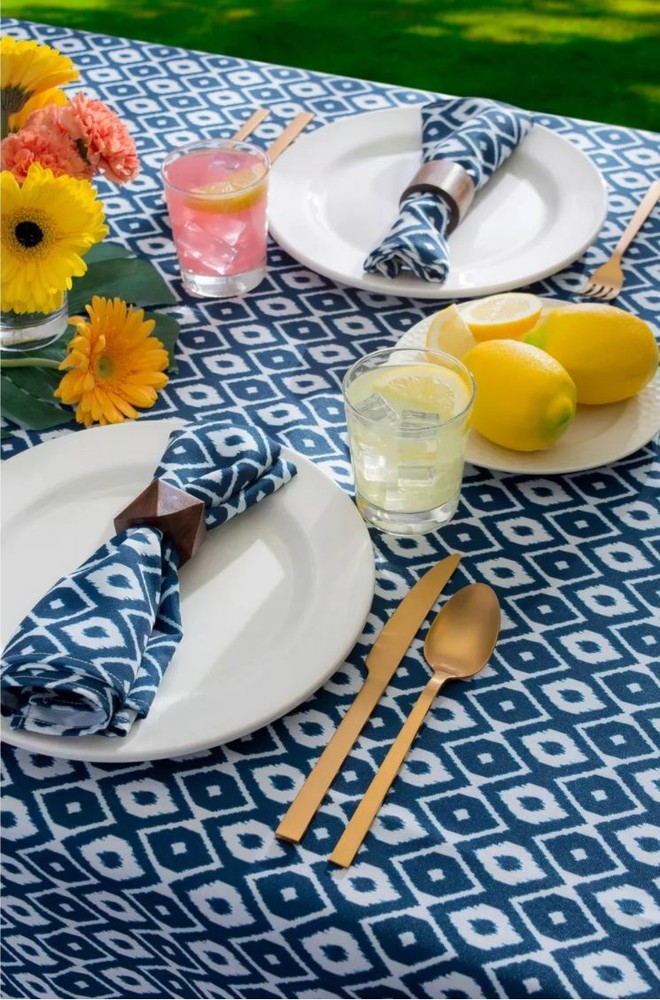 DII's spill proof tablecloths are perfect for outdoor use in the spring and summer months. The polyester material makes for simple cleanup. Great for BBQ's, parties, summer gatherings, dinner with the family, and more. Coordinate with the matching DII Outdoor Napkins for a complete look. DII's spill proof tablecloths are perfect for outdoor use in the spring and summer months The polyester material makes for simple cleanup - spill proof Great for BBQ's, parties, summer gatherings, dinner with the family, and more Design can be dressed up or down and can be used indoors and outdoors Features a classic design for an inviting look. Geometric Ikat Design is the perfect backdrop for a BBQ, Family Gathering, and Every day. Perfect for Outdoor Comes 84x60" 100% Polyester, for easy care Features: Rectangle (shape) Number of Pieces: 1 Dimensions (Overall): 84 Inches (L), 60 Inches (W) Textile Material: 100% Polyester Style: Tablecloths Textile construction: Plain Weave Fits Size: 60x84 Inches Rectangular Care & Cleaning: Machine Wash