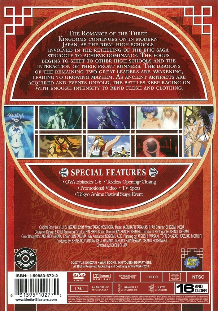 FREE & FAST SHIPPING, we ship same day of the order with online tracking A second season, called Ikki Tousen: Dragon Destiny (一騎当千 Dragon Destiny, Ikkitōsen Doragon Desutinī), Collects all 12 episodes on 3 discs .A new destiny for ancient heroes! The Romance of the Three Kingdoms continues on in modern Japan, as the rival high schools involved in the retelling of the epic saga struggle to achieve dominance. The dragons of the remaining two great leaders are awakening, leading to growing mayhem. As ancient artefacts are acquired and events unfold, the battles keep raging on...The exciting sequel to Ikki Tousen: Battle Vixens. Ikki-Tousen: Dragon Destiny continues the martial arts battles of our reincarnated Fighters introduced in the first Ikki-Tousen series. This set features the three discs as originally issued in one collection which, unlike some other recent sets, preserves them in their complete format including all the "extras". ( In addition to the 12 featured episodes in this series there are also an additional 6 "mini-episode" OAV's that are NOTHING but fanservice. ) ... This is a gorgeous release. Offered in 1.78:1 Widescreen, this series has a colorful design, and all of the colors are bright and bold. Lining is also clear and distinct. The transfer is free of technical flaws. Product details Actors: Masumi Asano Directors: Takashi Watanabe Format: Dolby, Color, Subtitled, Anamorphic, Dubbed Language: English, Japanese Subtitles: English Region: Region 1 Number of discs: 3 Rated: NR Not Rated Studio: Media Blasters / Anime Works Run Time: 300.00 minutes