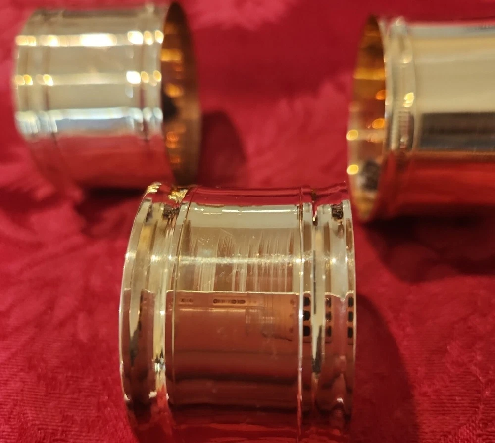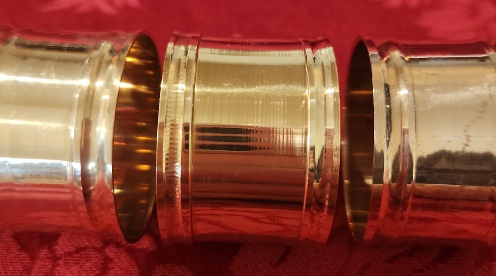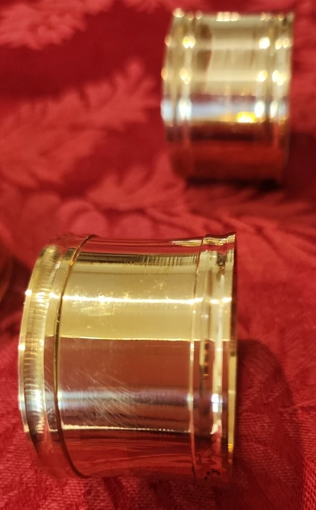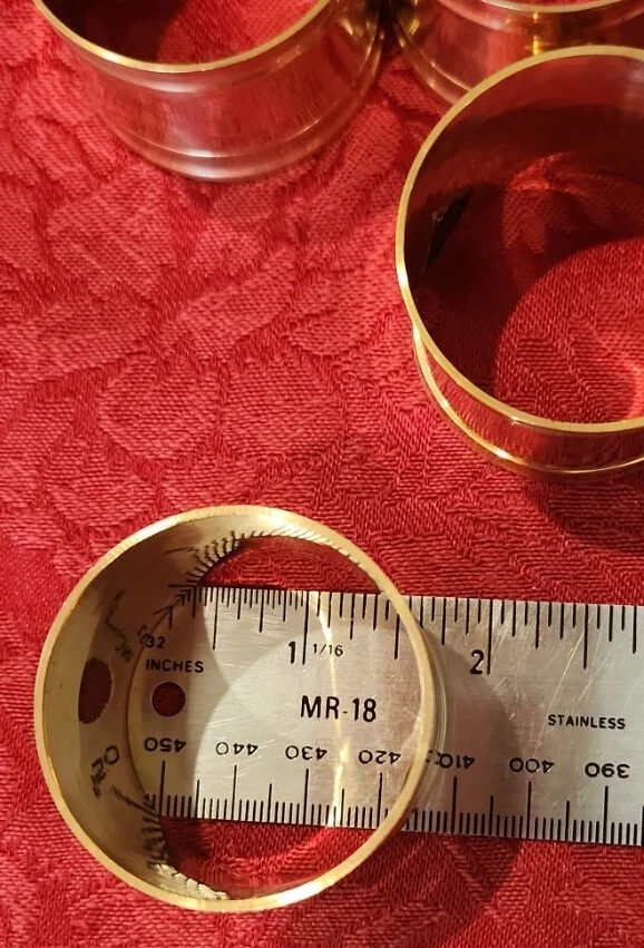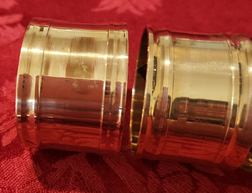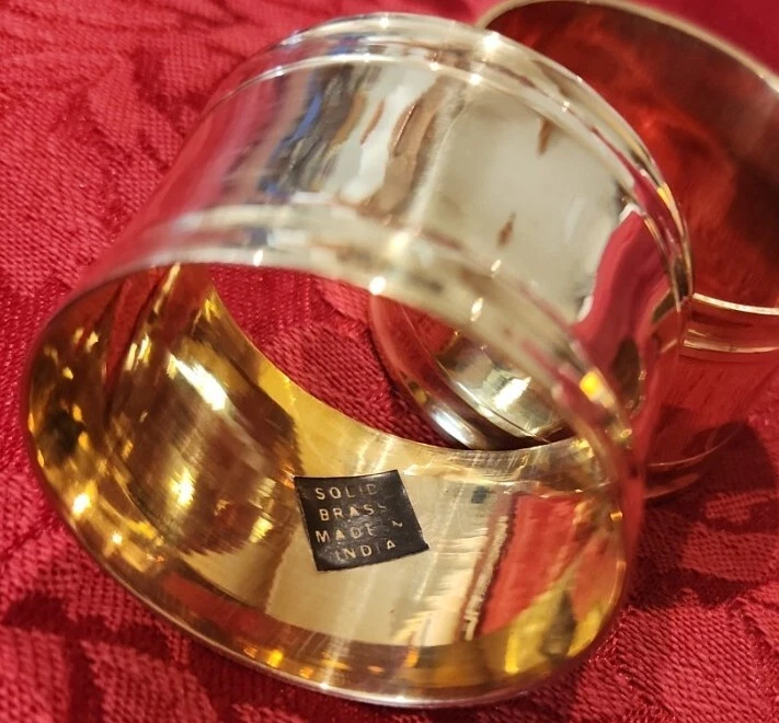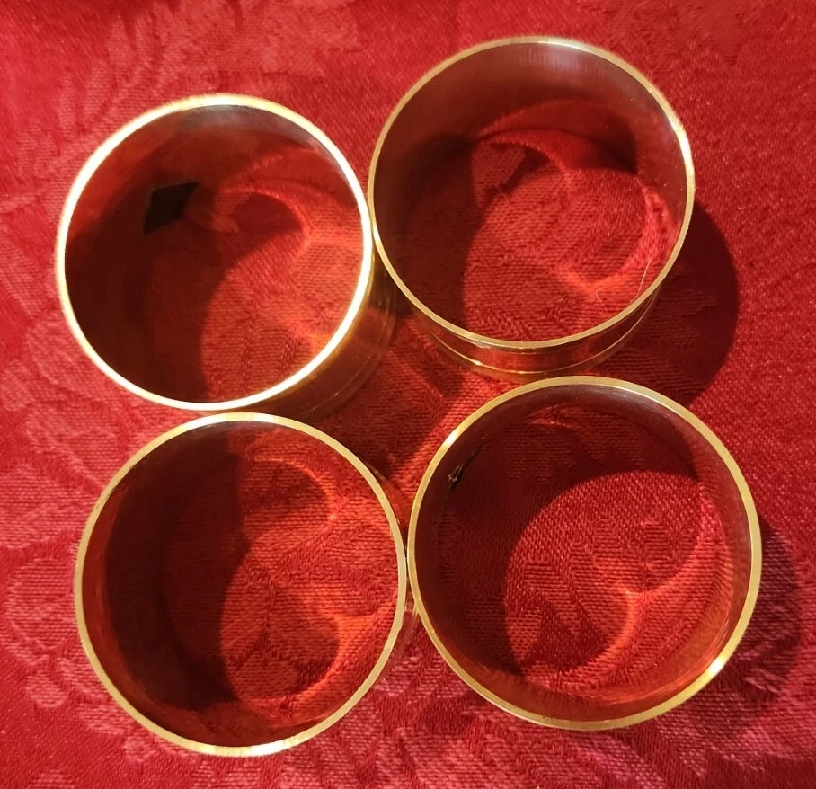 Import House New with defects. They have some abrasions. Possibly from original manufacturing or from shelf wear. See photos. Set of 4 Solid Brass Napkin Rings Items in photos are the items you will receive.