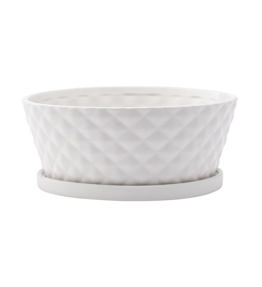Create a stunning miniature garden with this elegant dish garden pot; Featuring a sophisticated diamond pattern embossed around its wide, shallow form, this pot is perfect for showcasing a variety of succulents, bonsai trees, or other low-growing plants Made from durable ceramic, ensuring long-lasting beauty Measures approximately 3.75 x 8.25 inches; Comes with a drain hole and attached saucer Suitable for both indoor and outdoor settings, perfect for displaying succulents, flowers, herbs, or small plants; Bring indoors during winter months to prevent damage Contained in protective packaging; Ready for easy gifting