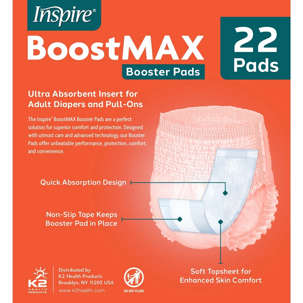 Introducing the Incontinence Booster Pads – giving you maximum absorbency for day and overnight adult diaper use. Our high-performance booster pads use scientifically proven technology to add significant absorbency to your existing incontinence product, providing more control and maximum comfort and confidence. Ideal for adult diapers and pull-ons. The Incontinence Booster Pads are ideal for those looking for extra protection against bladder leaks or overflow when it comes to dyatime or overnight adult diapers. Its unique ultra-absorbent design pulls moisture away from the skin surface, keeping you dry and comfortable throughout the day. The super absorbent layers not only reduces odors but will prevent liquid from leaking through the material due to its dual core performance layer. An ideal solution for those looking for a reliable source of incontinence supplies. Get yourself up and running with our Incontinence Booster Pad – designed with convenience in mind! Made with durability in mind, you can have complete peace of mind knowing these pads will keep you dry! Suitable for both men and women with bladder leakage, incontinence or bed wetting issues overnight, these booster pad inserts are perfect to use with any adult diaper product! So if you’re looking for extra protection, superior protection or better quality than standard incontinence products - look no further than the Incontinence Booster Pads! PUT AN END TO LEAKS, OUR MOST ABSORBENT BOOSTER PAD NOW IN EXTRA LONG: Booster pads for adult diapers SIGNIFIGANTLY increase your adult diaper's absorbency. Absorbs over 5 cups of liquid! Wet Diapers create a risk for skin break down. Perfect for extended use or night time to ensure dryness. Trusted quality from Incontinence Products. EXTRA 14.5" x 4.3" for superior coverage. ABSORBS OVER 5 CUPS OF FLUID! SUPER ABSORBENT POLYMER LOCKS IN FLUID AND REDUCES ODOR: Absorbent fluff quickly absorbs fluid while the super absorbent polymer gels to lock in fluid and odor for unbeatable performance and maximum protection. LEAK FREE GUARANTEE: The BoosterMAX will keep you leak free! Try it with no risk with our Leak Free Guarantee. Limited 1 per customer on 22 ct or 18 ct purchase. SOFT TOP SHEET FOR ENHANCED SKIN COMFORT: Managing incontinence can lead to rashes, skin break down and sores. diaper booster pads feature an extra soft top sheet for skin comfort while the absorbent core wicks away moisture quickly and efficiently. Incontinence booster pads make daily life easier and safer for caregivers and patients. ADHESIVE STRIP KEEPS PAD IN PLACE - SIMPLE TO USE: Simply peel off adhesive strip on back of diaper liner and secure to the inside of the diaper or pull up and transform any diaper in to a super diaper - overnight diaper. For use by men and women. Non Perishable.