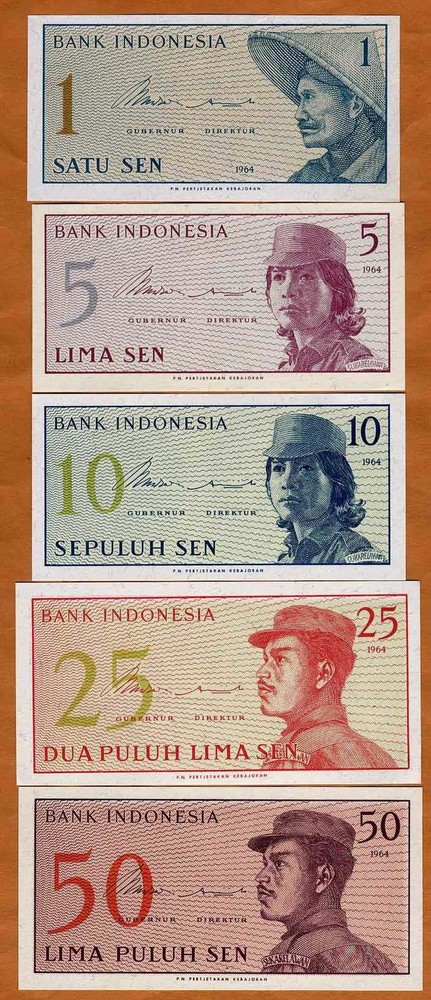 Bank Indonesia, Complete Fractional Set, 1-5-10-25-50 Sen, 1964, P-90-91-92-93-94 Original paper, sharp corners. It has no folds or creases, no pinholes or paper splits. Grade: Uncirculated One flat shipping charge, worldwide, no matter how many auctions you win. We are members of the ANA & IBNS (Become a subsriber to my Ebay store and get free email updates on what is new at the store and what is coming. Also get access to special deals, discounts and promotions designed for subsribers only) Please read the terms of sale and shipping terms before you bid, to make sure you understand them correctly. Email me if you have any questions. USA buyers pay $2.50 and ALL International bidders pay $3.00 for for 1st class mail postage. Registered mail is $17.50. Priority mail is available for $9.00 and INTERNATIONAL priority mail is $42.00 (where available). Only one shipping charge per shipment no matter how many items you buy (combined shipping).
