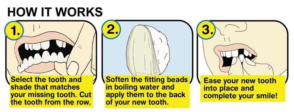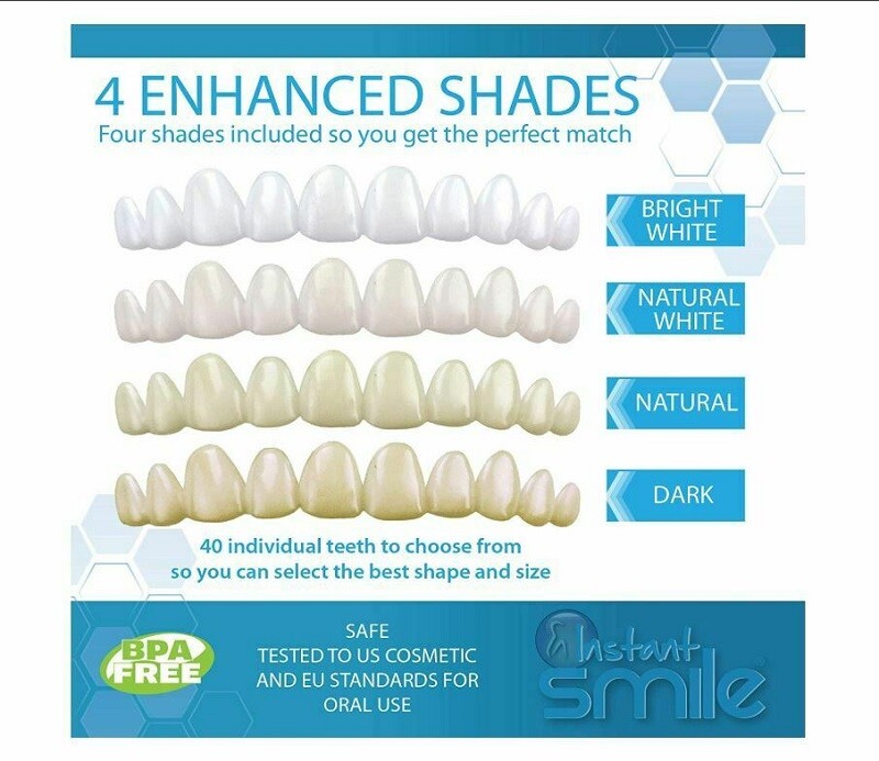 Instant Smile Complete Your Smile Tooth Replacement Kit Replace a broken or missing tooth in just 5 minutes! 4 enhanced shades included so you can get the perfect color match 40 different teeth for a perfect tooth match Works with Upper and Lower teeth These are not veneers that cover all of your teeth, they are designed to replace a single missing tooth for a more realistic look & feel. You only need to replace the teeth that are missing or cracked. If needed, each tooth can be shaped and trimmed for the perfect fit. Trimming and shaping tools included. No returns on opened packages due to health reasons.
