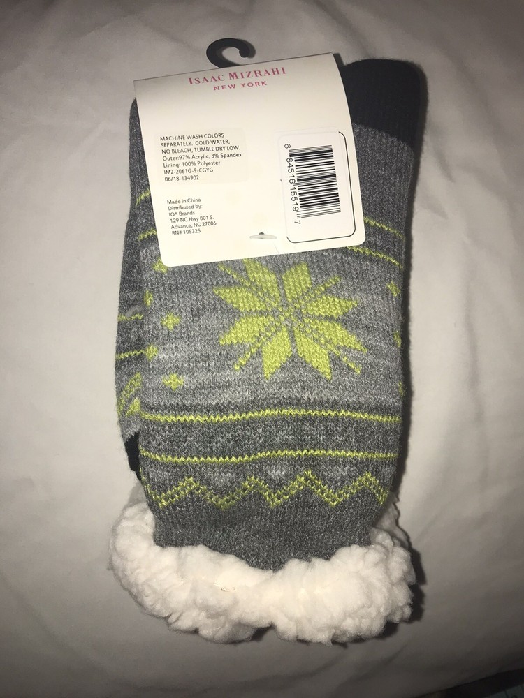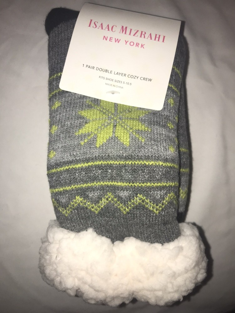 Keep your feet cozy this winter with these Gray Snowflake Crew Socks from Grays. These luxury socks come in a pack of 2 pairs and are made of 97/3 Acrylic/Spandex material, which makes them machine washable. They have a mild compression level and a non-slip feature for extra comfort and warmth. The Isaac Mizrahi Double Layer Cozy Crew Socks are perfect for casual occasions during the Fall and Winter seasons. They are mid-calf in length and have a full toe style. These socks are the perfect addition to your winter wardrobe and are available in size 5 to 10.5. Isaac Mizrahi Double Layer Cozy Crew Socks - Womens - Charcoal 2 Pairs Non Slip. Condition is "New with tags". Shipped with USPS First Class. Keep your feet warm at all times with these Isaac Mizrahi Double Layer luxury Cozy Crew Socks featuring snowflake-shaped grips on the soles - Plush on the inside, leaving nothing but warm and toasty toes on a chilly day! Specifications Womens Fits: Shoe Sizes 5-10.5 Outer Material: 97% Acrylic 3% Spandex Lining: 100% Polyester Care Instructions Machine wash colors separately, cold water, no bleach Tumble dry low