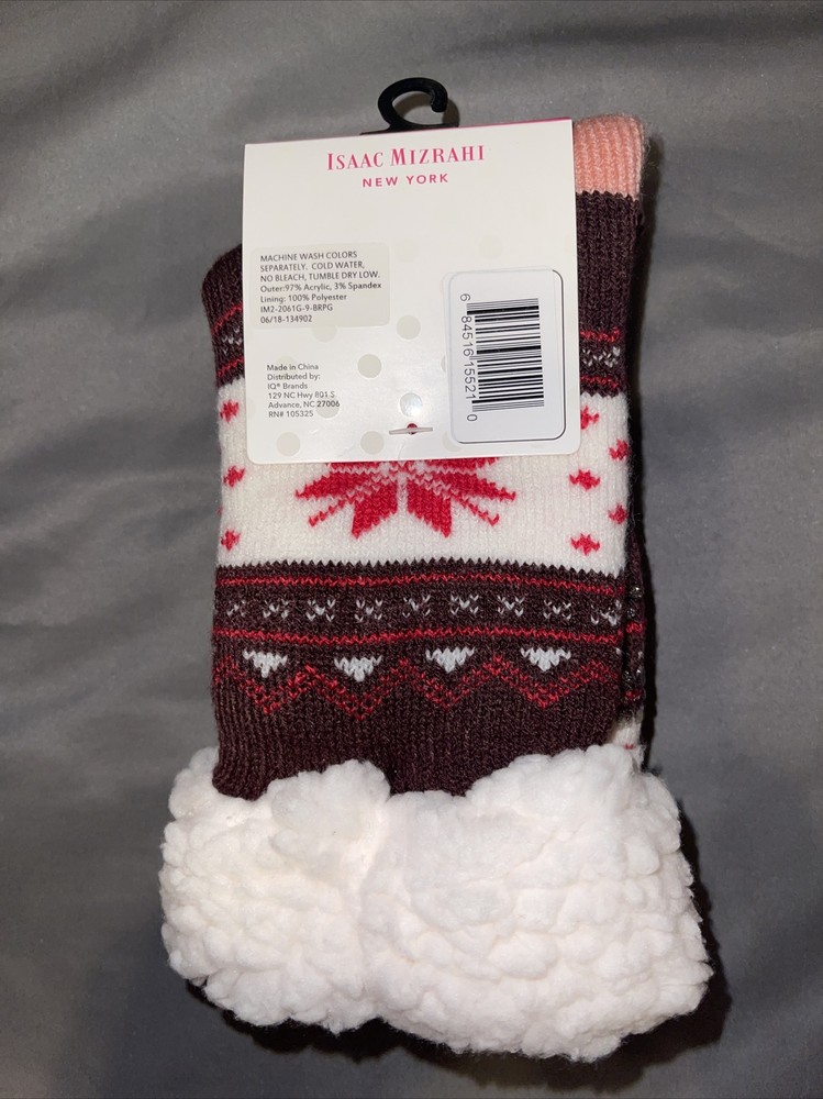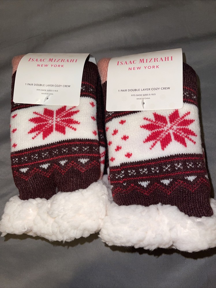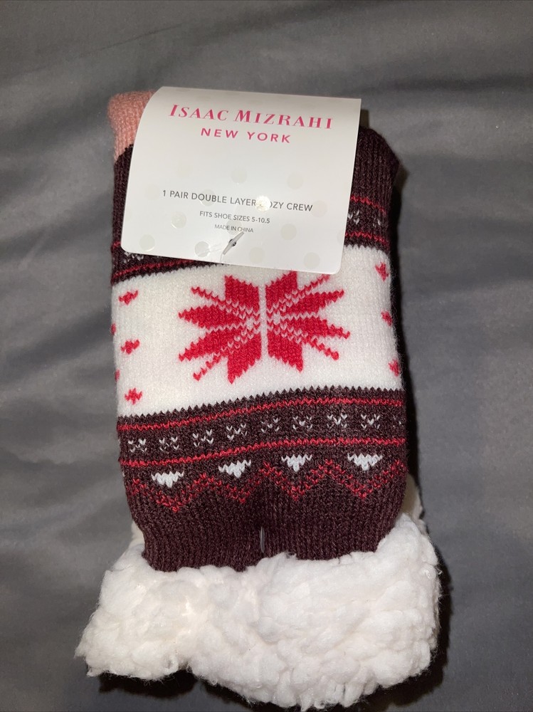Elevate your sock game this winter with these cozy crew socks from Isaac Mizrahi. The burgundy rose color is perfect for the season and the snowflake pattern adds a festive touch. Made with a double layer of 97/3 acrylic/spandex material, these socks are both comfortable and warm. The non-slip feature ensures that they will stay in place all day long. With a mid-calf length and full toe style, these socks are perfect for casual occasions and can fit women's sizes 5-10.5. Machine washable for easy care, these socks come in a pack of 2 pairs. Get ready for the winter and fall season with these stylish and practical socks from Isaac Mizrahi. Isaac Mizrahi Double Layer Cozy Crew Socks - Womens - Charcoal 2 Pairs Non Slip. Condition is "New with tags". Shipped with USPS First Class. Keep your feet warm at all times with these Isaac Mizrahi Double Layer Cozy Crew Socks featuring snowflake-shaped grips on the soles - Plush on the inside, leaving nothing but warm and toasty toes on a chilly day! Specifications Women’s socks Fits: Shoe Sizes 5-10.5 Outer Material: 97% Acrylic 3% Spandex Lining: 100% Polyester Care Instructions Machine wash colors, cold water, no bleach Tumble dry low