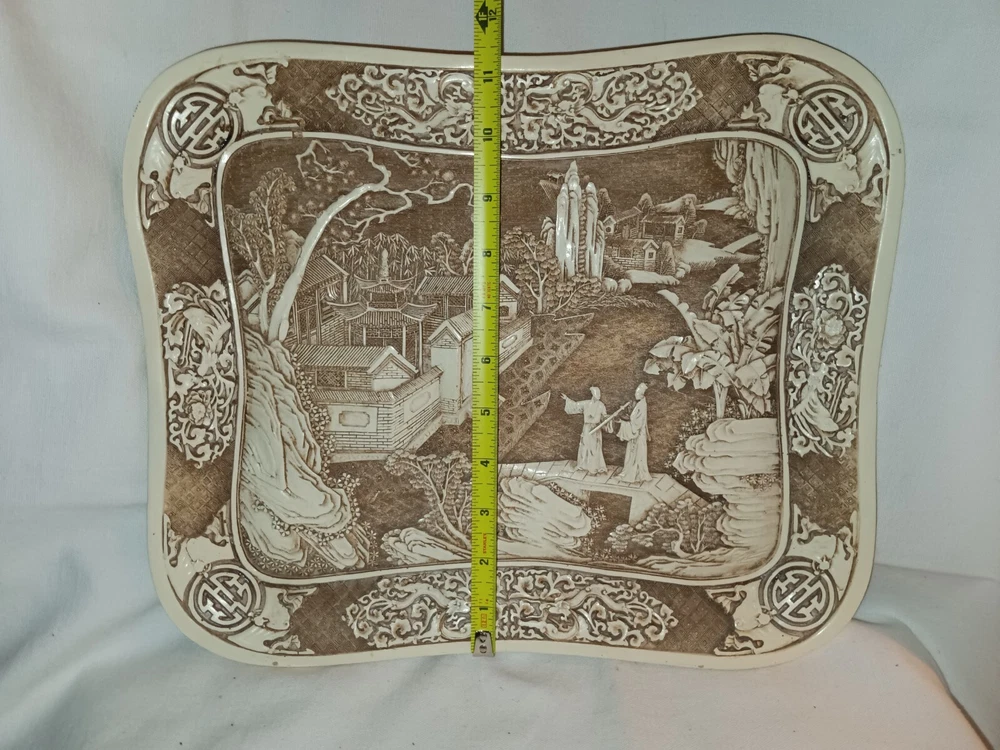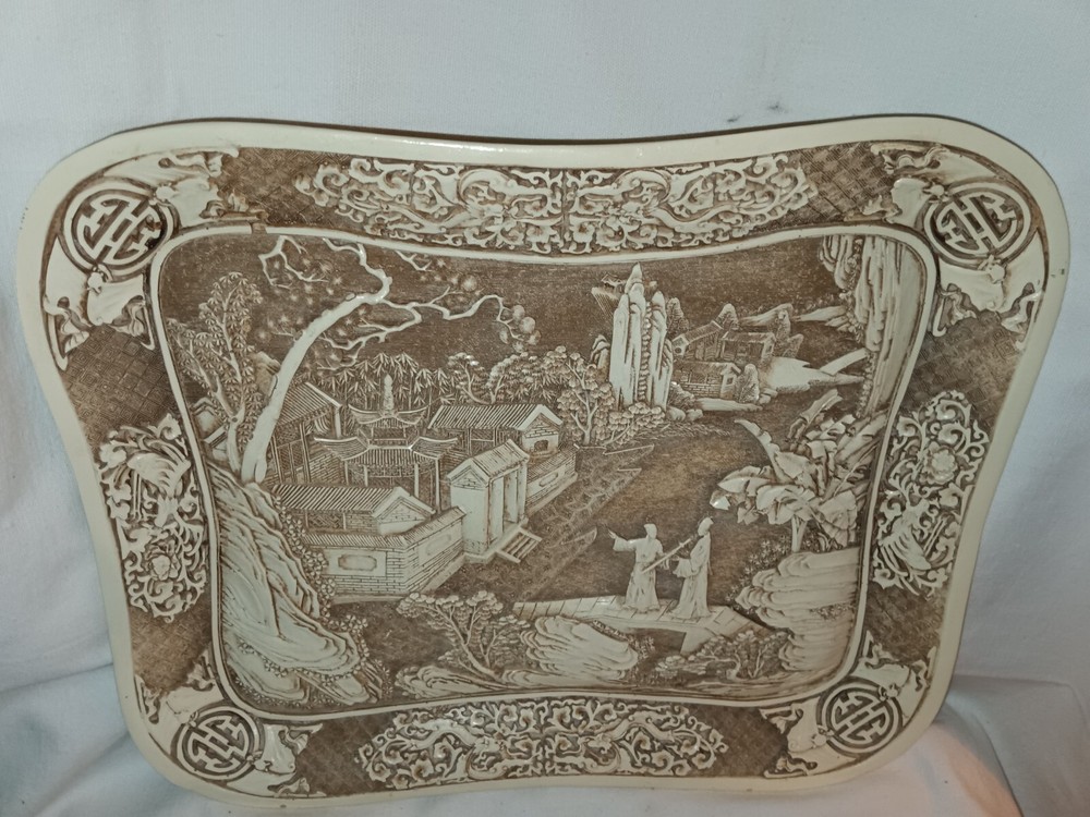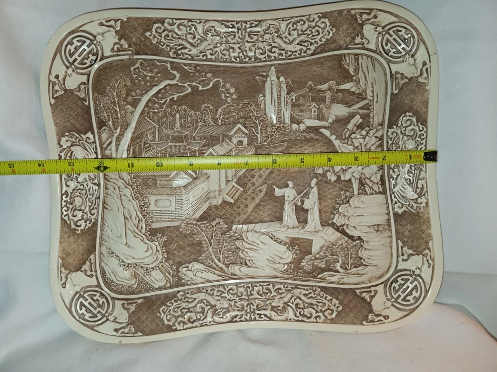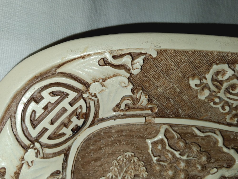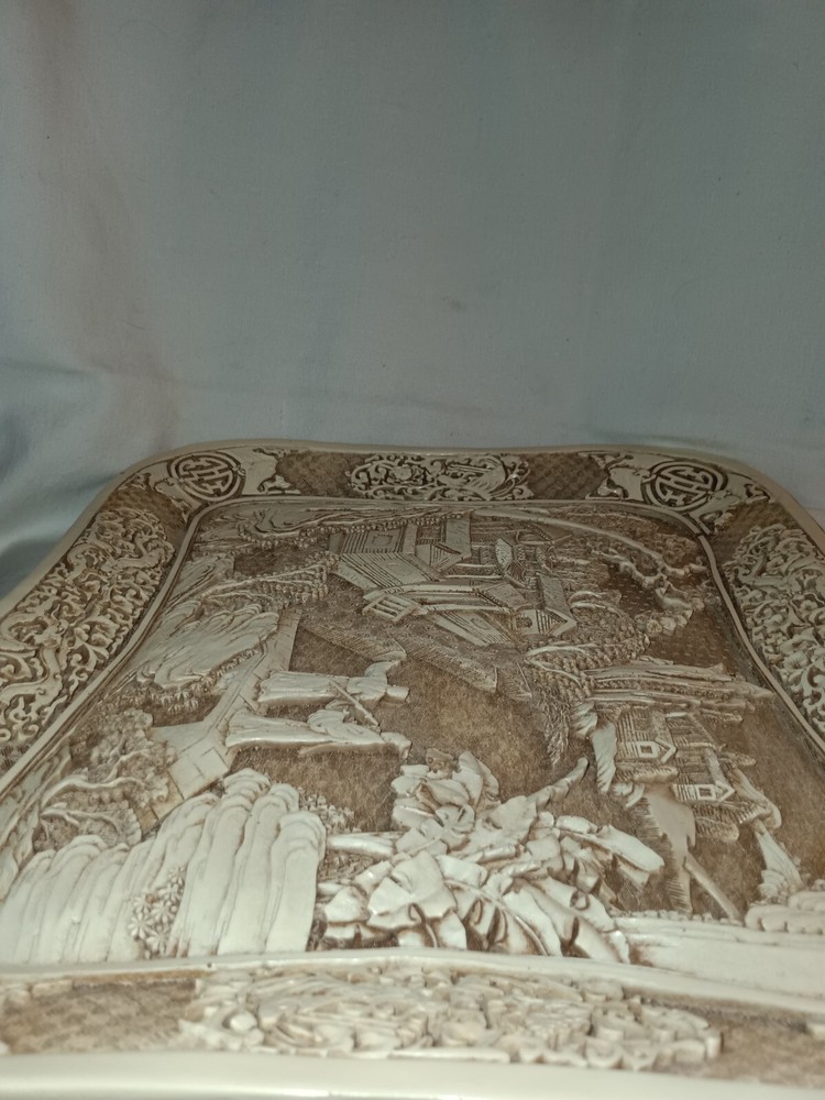 This vintage Ivory Dynasty tray by Arnart Imports features an Asian-inspired Chinese design. Made of resin in Taiwan in 1982, this rectangular decorative tray showcases an ivory color with intricate details. Perfect for collectors or those who appreciate 1980s Asian decor.