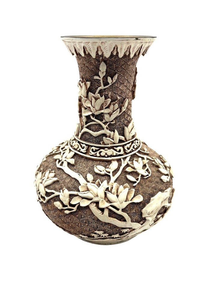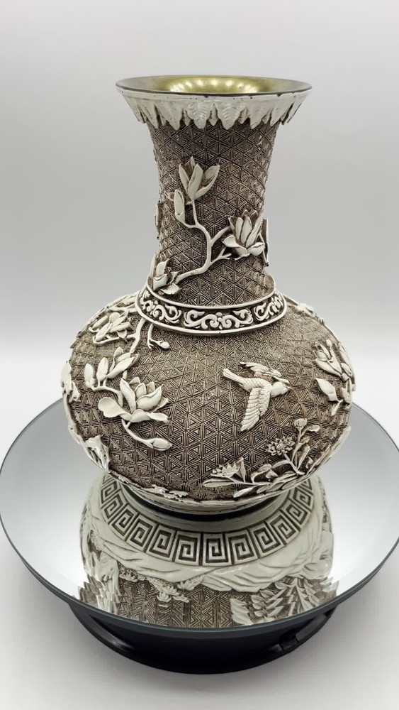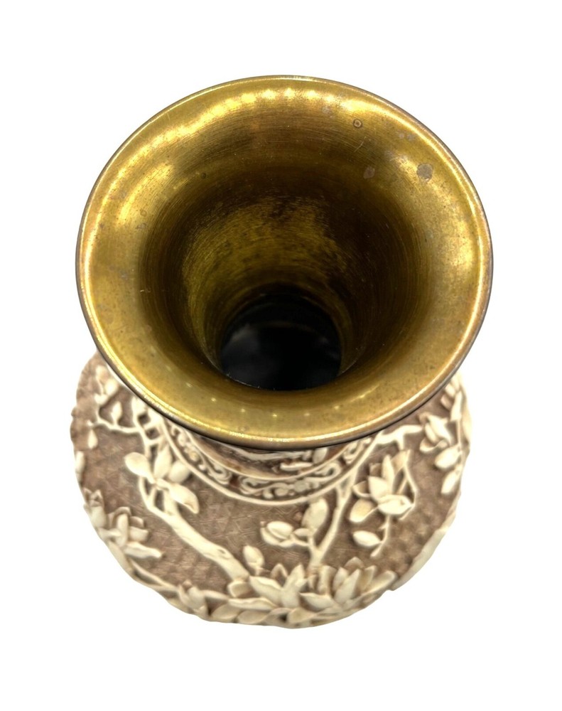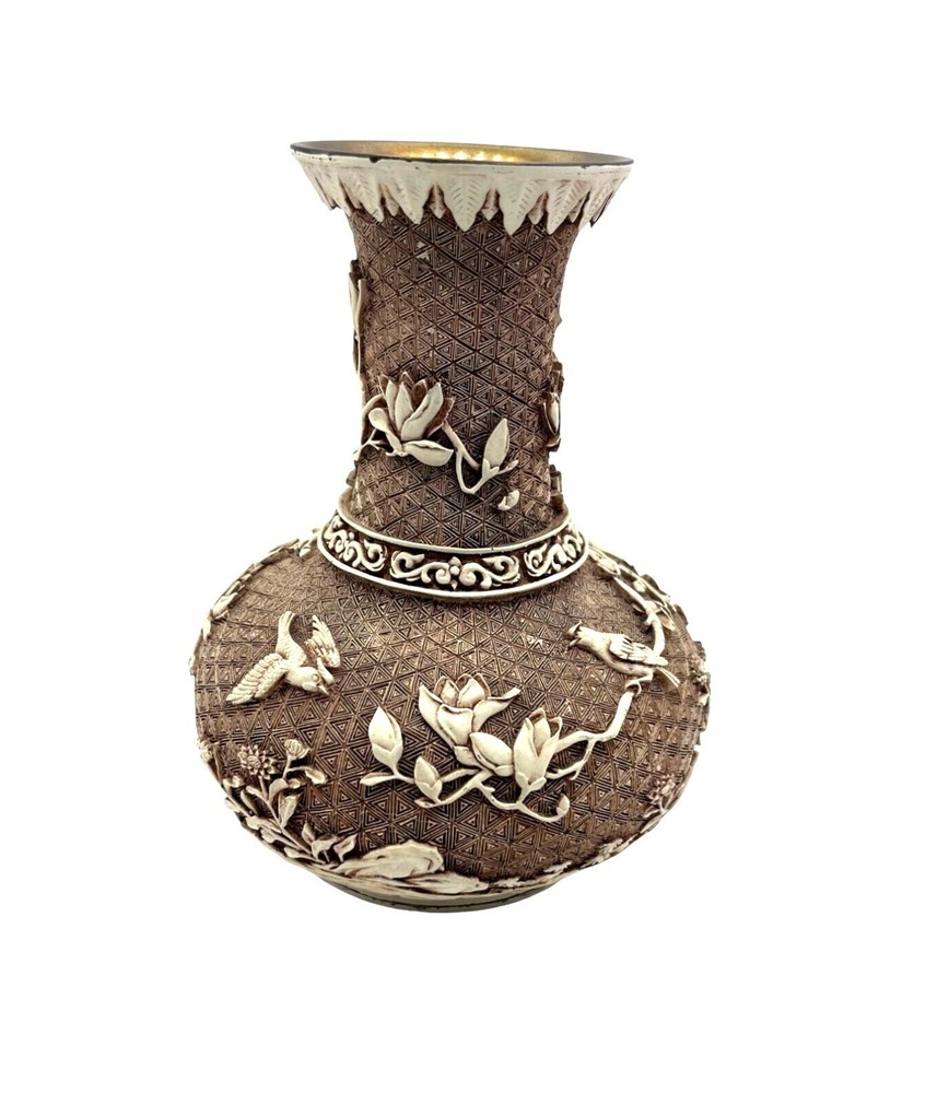 This exquisite vintage vase features a detailed bird and floral design embossed on its surface. Its combination of ivory look sculpture and brass materials gives it a distinct and elegant appearance. A perfect addition to sophisticated home decor, it seamlessly blends traditional craftsmanship with timeless beauty. • Embossed bird and floral design • Ivory look sculpture and brass materials • Antique finish • Decorative accent piece • Intricate detailing Size: 5" w x 7" tall Condition: Pre-Owned Good Some wear due to age on the painted rim and base. Otherwise in very good condition.