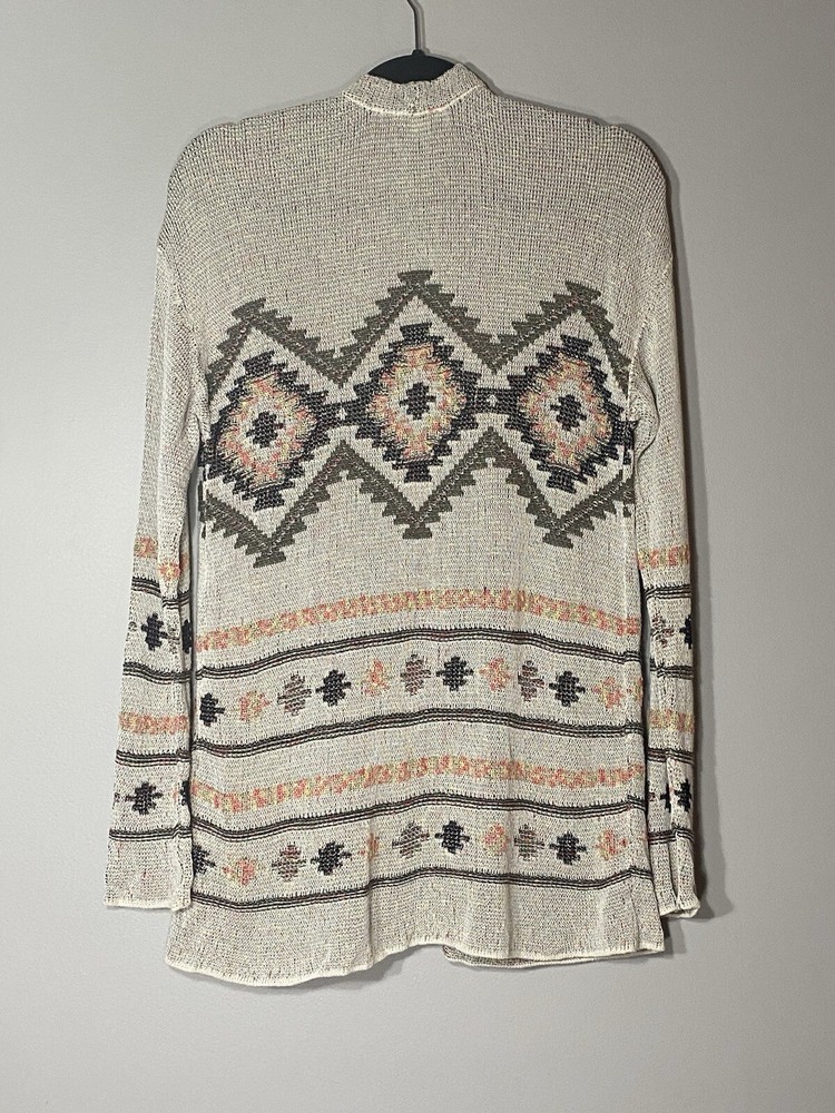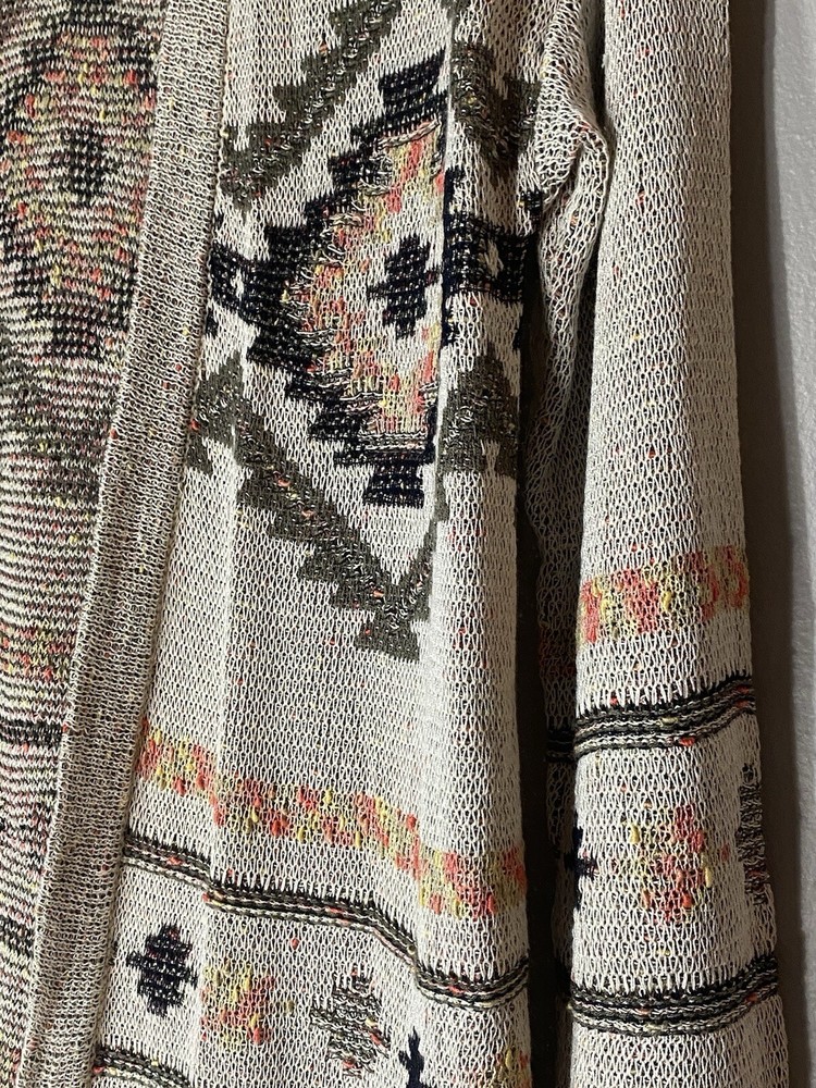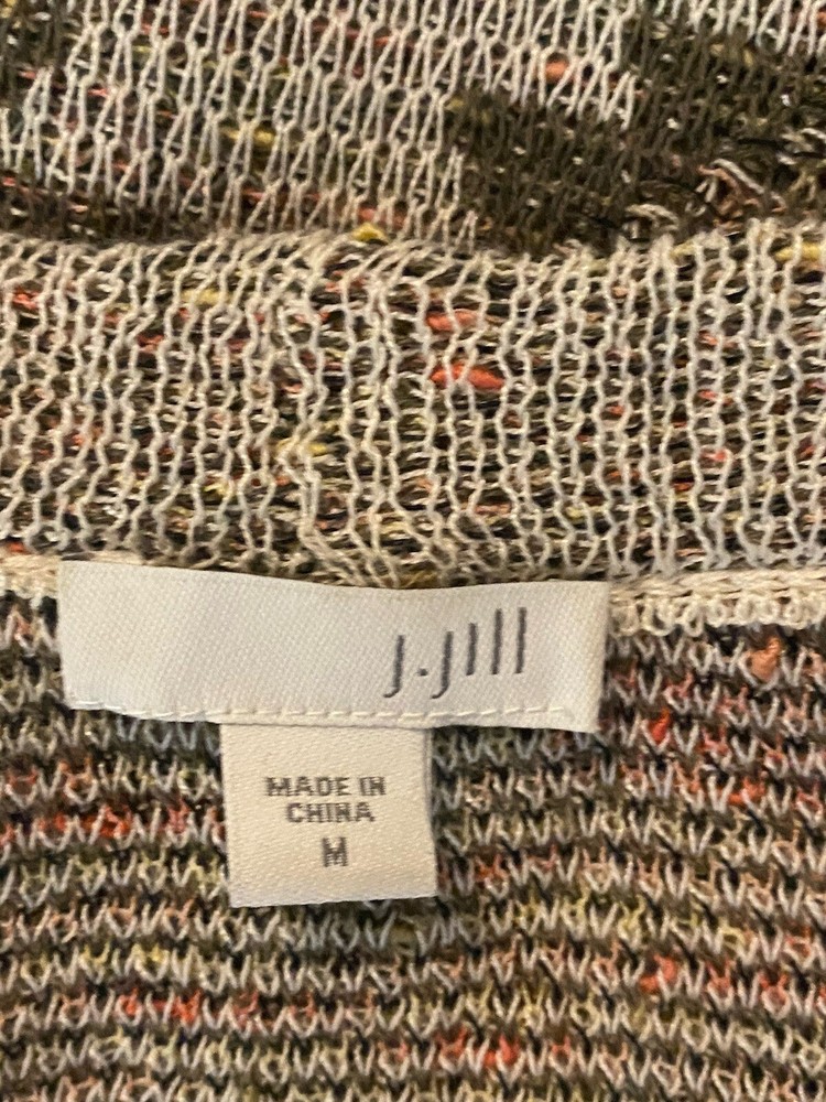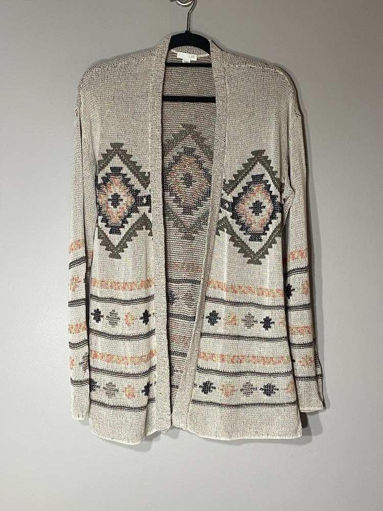 J Jill Ladies M Cardigan Open, long sleeve, light weight Tribal print, taupe, black, yellow, orange Perfect for fall Teaching, career, office, Great paired with leggings Measurements 22 inches pit to pit 30 inches top to bottom All measurements are flat lay and approximate Cotton Rayon blend Excellent condition Elevate your wardrobe with this stylish and comfortable J. Jill cardigan sweater. The geometric tribal print in multicolor adds a touch of excitement to any outfit. The long sleeves and open neckline provide warmth and versatility, while the cotton blend material ensures softness and comfort. This women's sweater in size M is perfect for any casual occasion, and the open feature allows for easy layering. The knit fabric type and Aztec theme make this cardigan a unique addition to your collection. Don't miss out on this must-have piece from J. Jill.