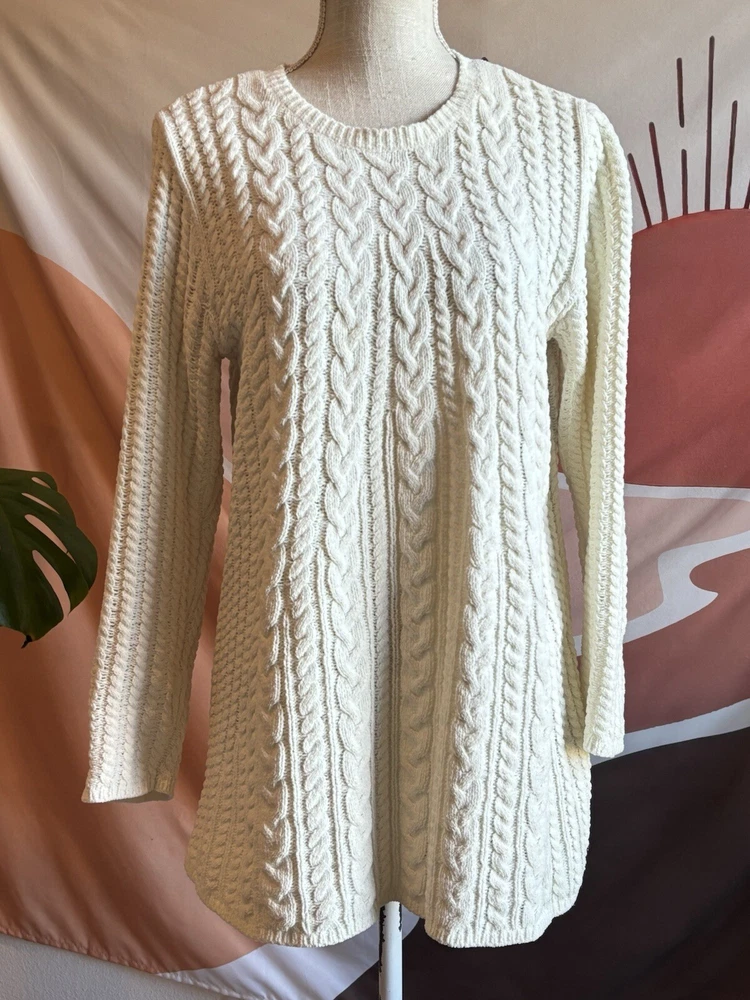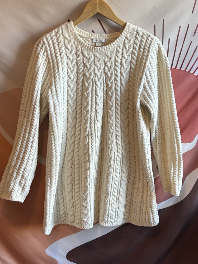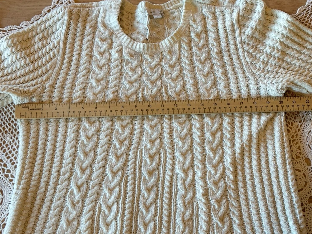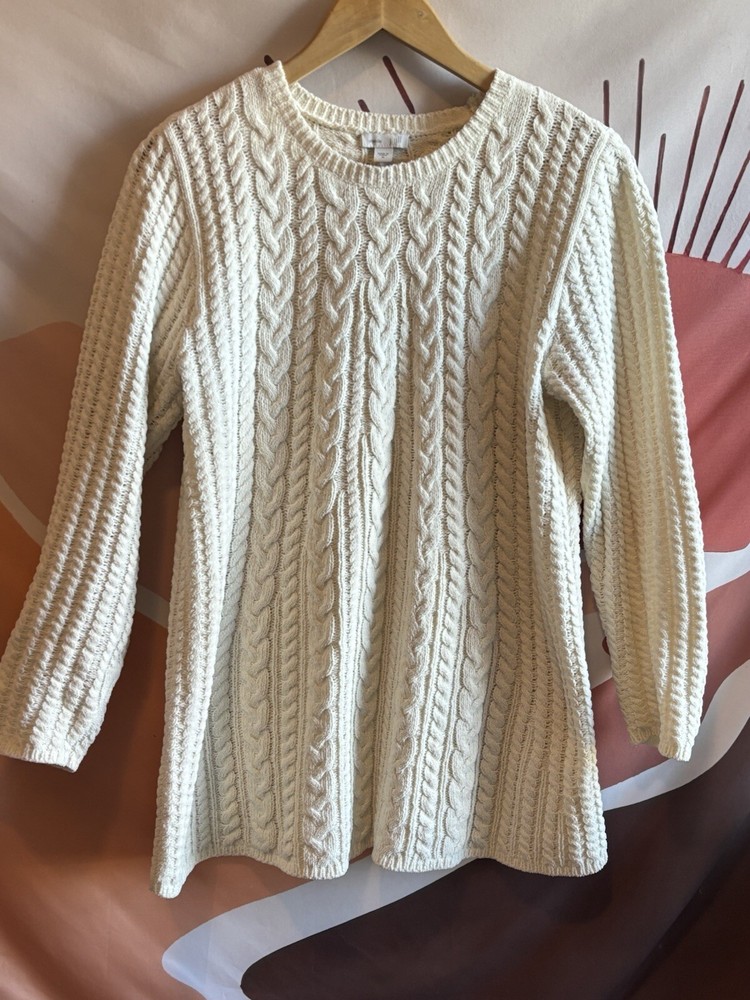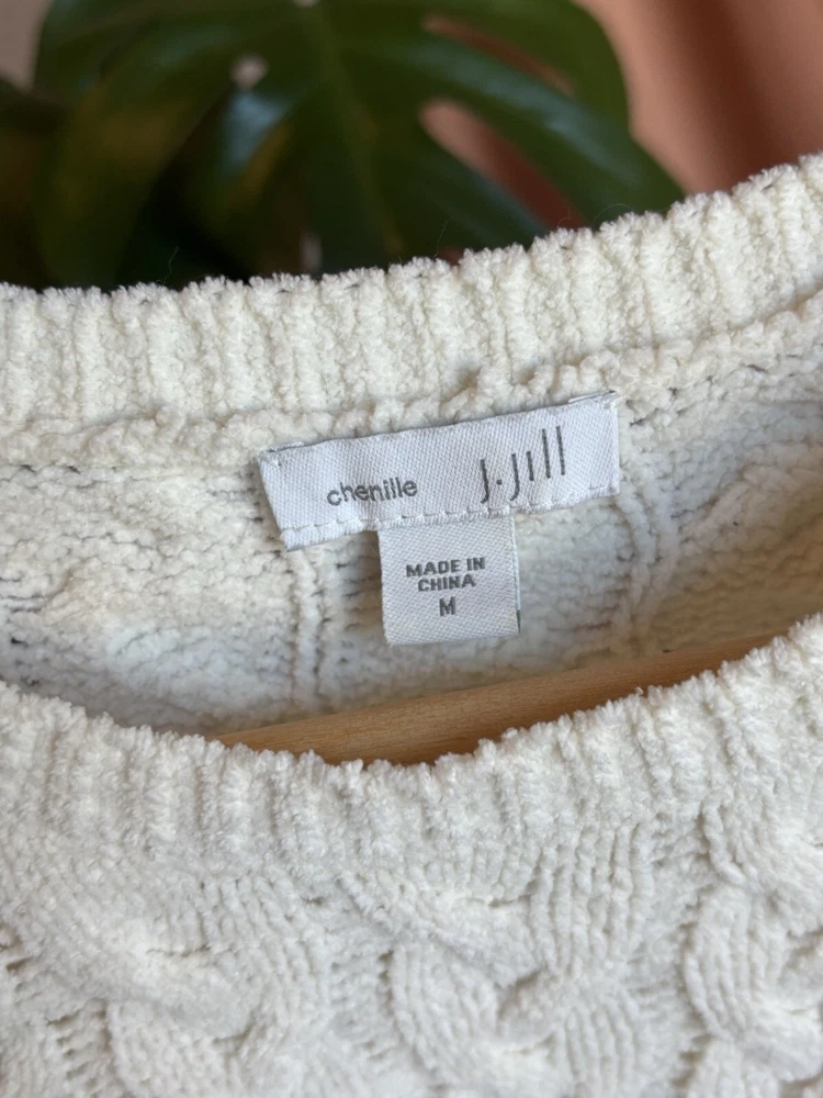 This is a J. Jill cable-knit sweater for women in size M. It is a white pullover with a crew neck and long sleeves, made of comfortable polyester material. The sweater has a solid pattern and is designed for regular size women. Pre loved in great condition. Please see photos for measurements. Smoke free home. We happily combine shipping. Thanks for looking.