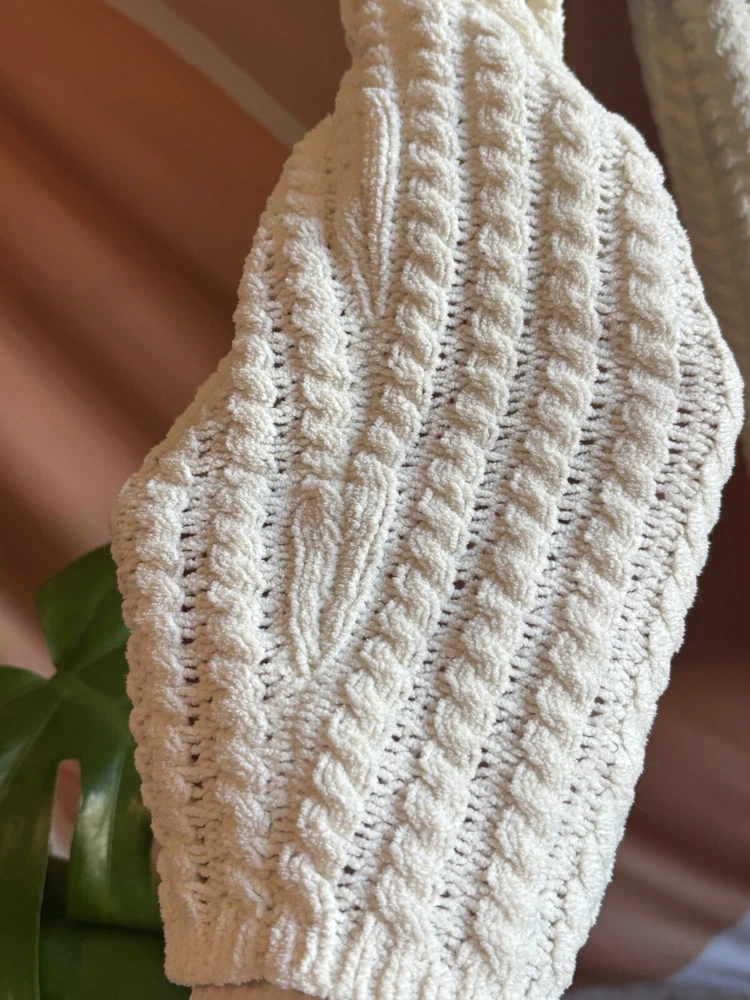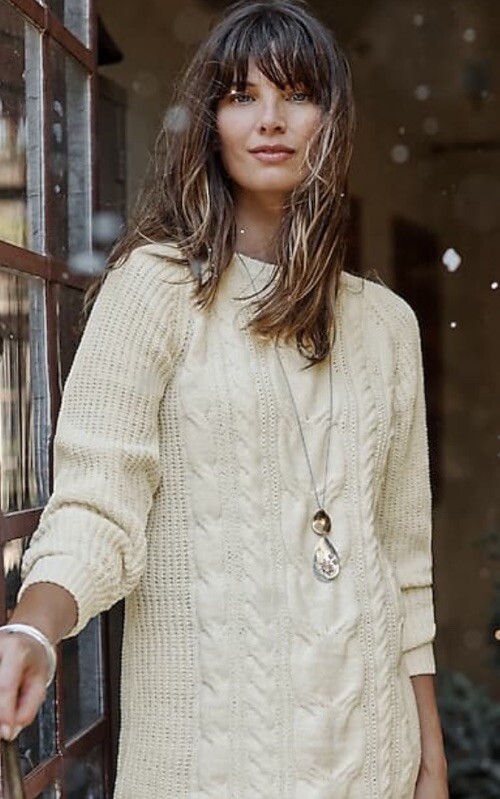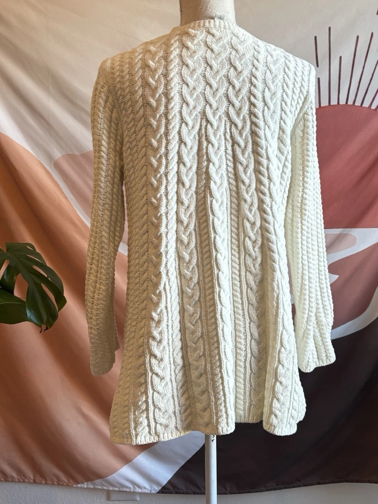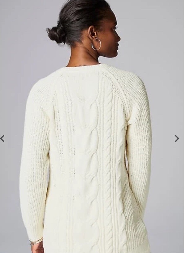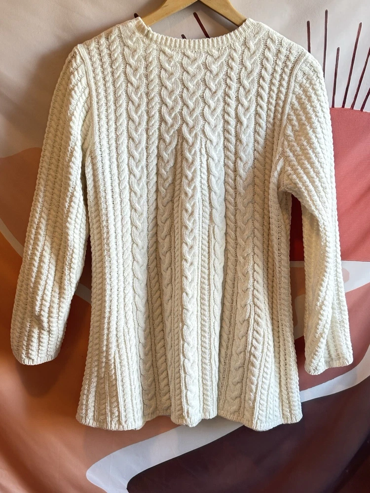This is a J. Jill cable-knit sweater for women in size M. It is a white pullover with a crew neck and long sleeves, made of comfortable polyester material. The sweater has a solid pattern and is designed for regular size women. Pre loved in great condition. Please see photos for measurements. Smoke free home. We happily combine shipping. Thanks for looking.